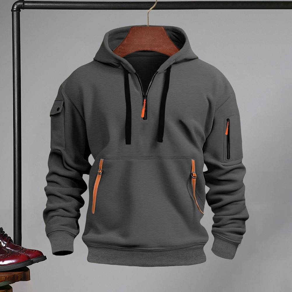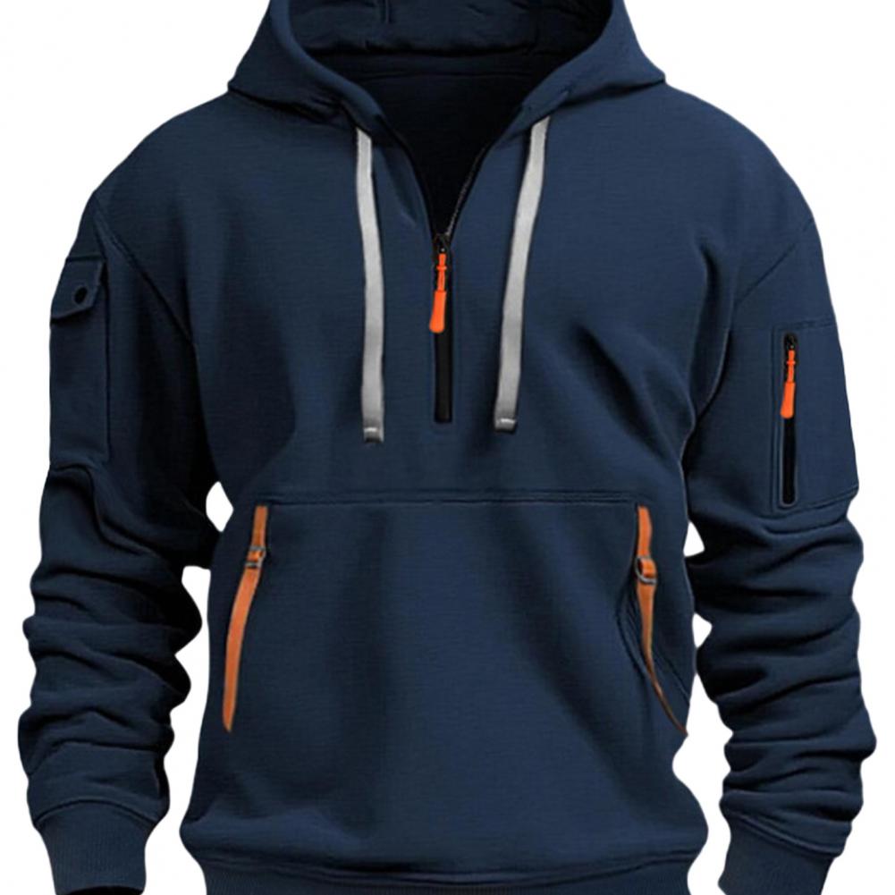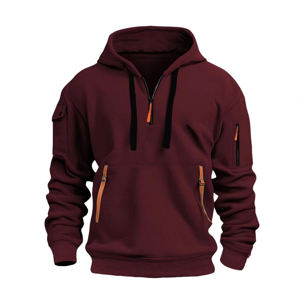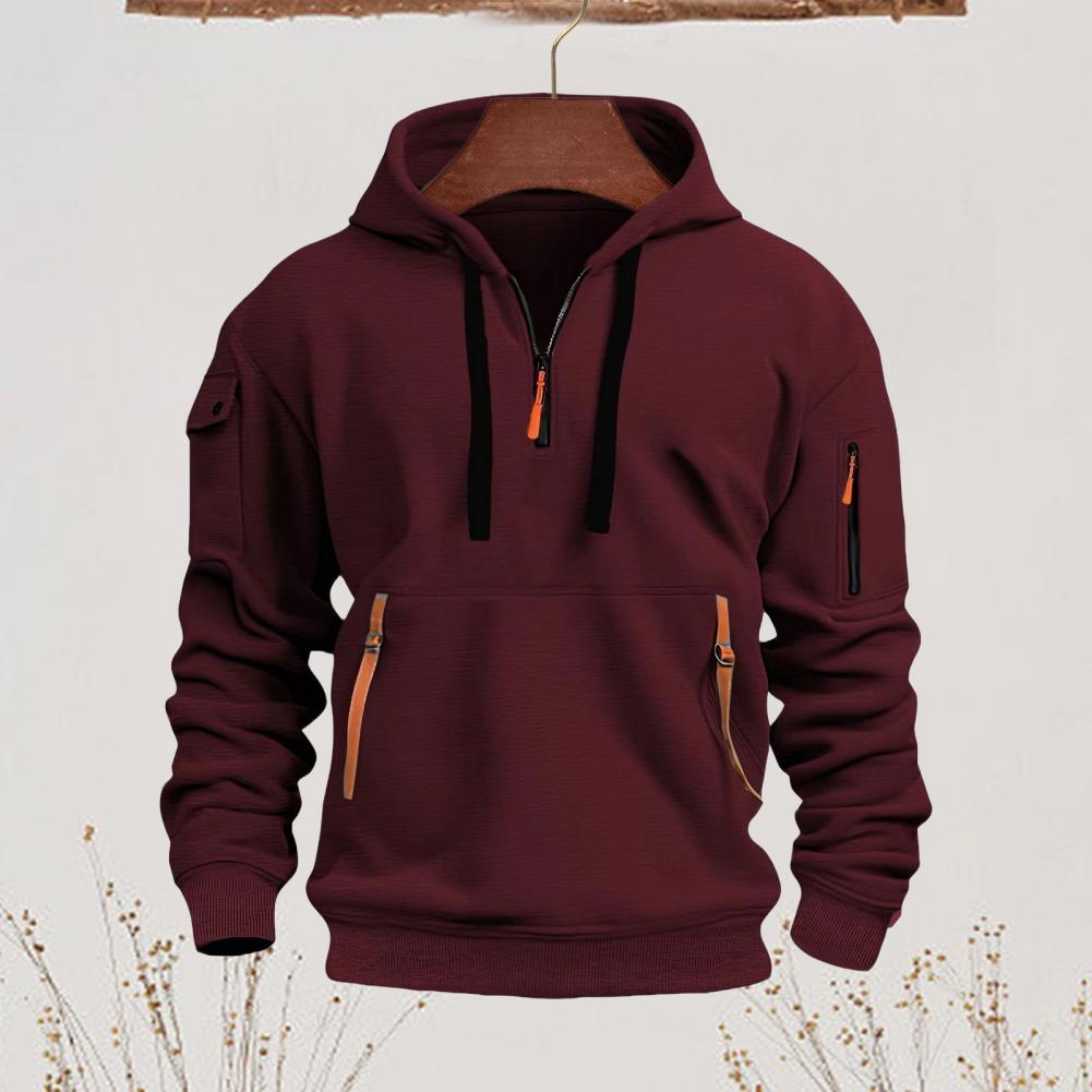 Men Fall Winter Hoodie Solid Color Drawstring Long Sleeves Half Zipper Arm Pocket Strap Decor Hooded Loose Daily Wear Casual Sport Top