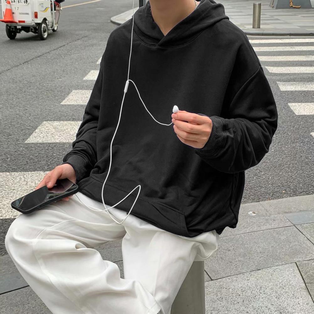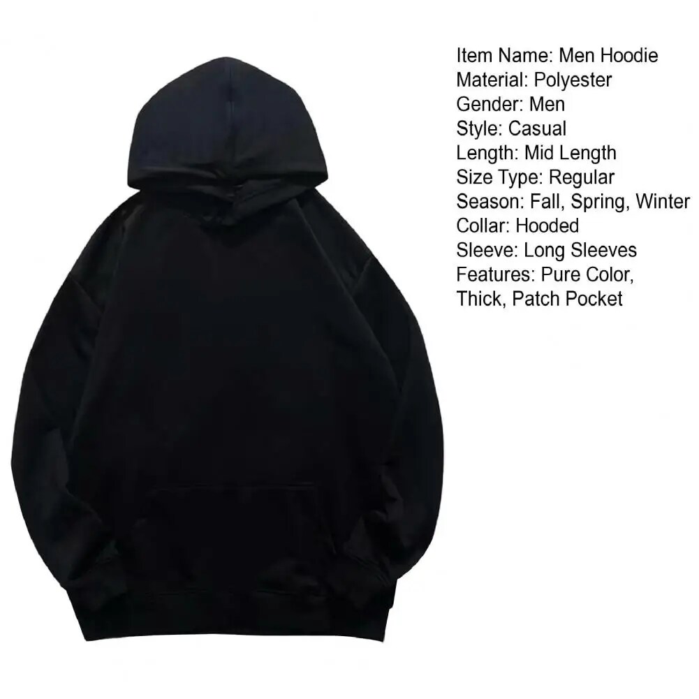 Men Fall Winter Hoodie Pure Color Elastic Cuff Thick Big Patch Pocket Hooded Loose Keep Warm Mid Length Sport Top