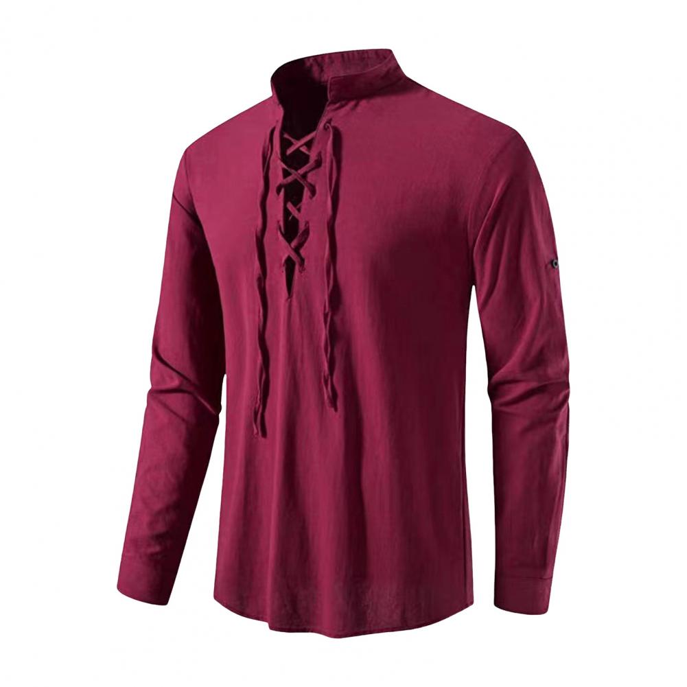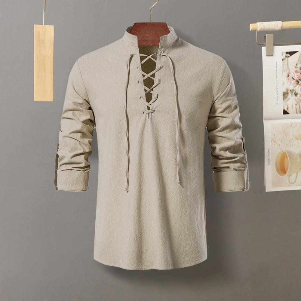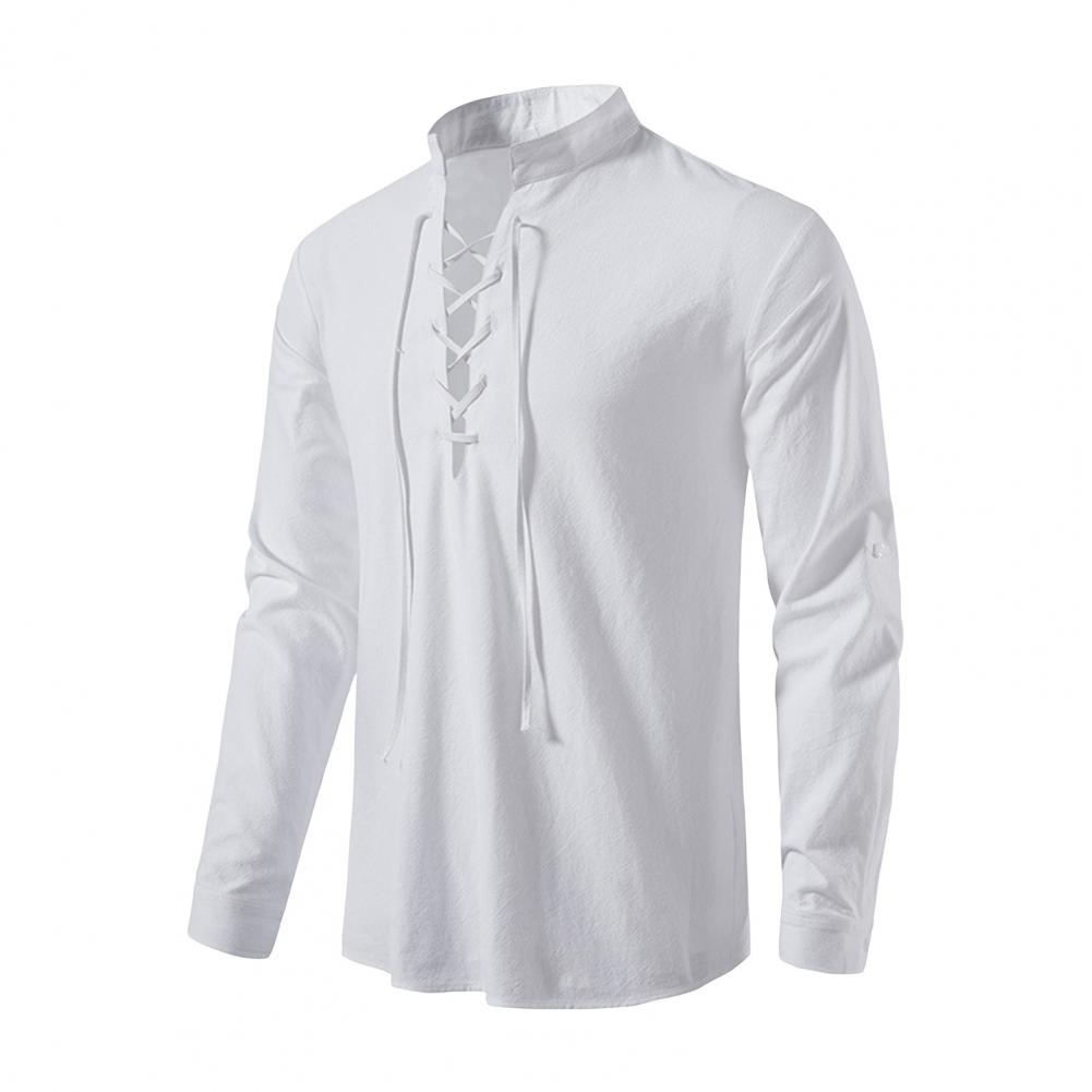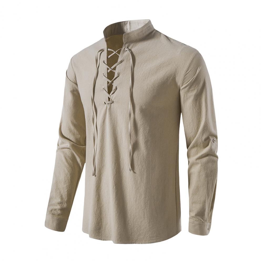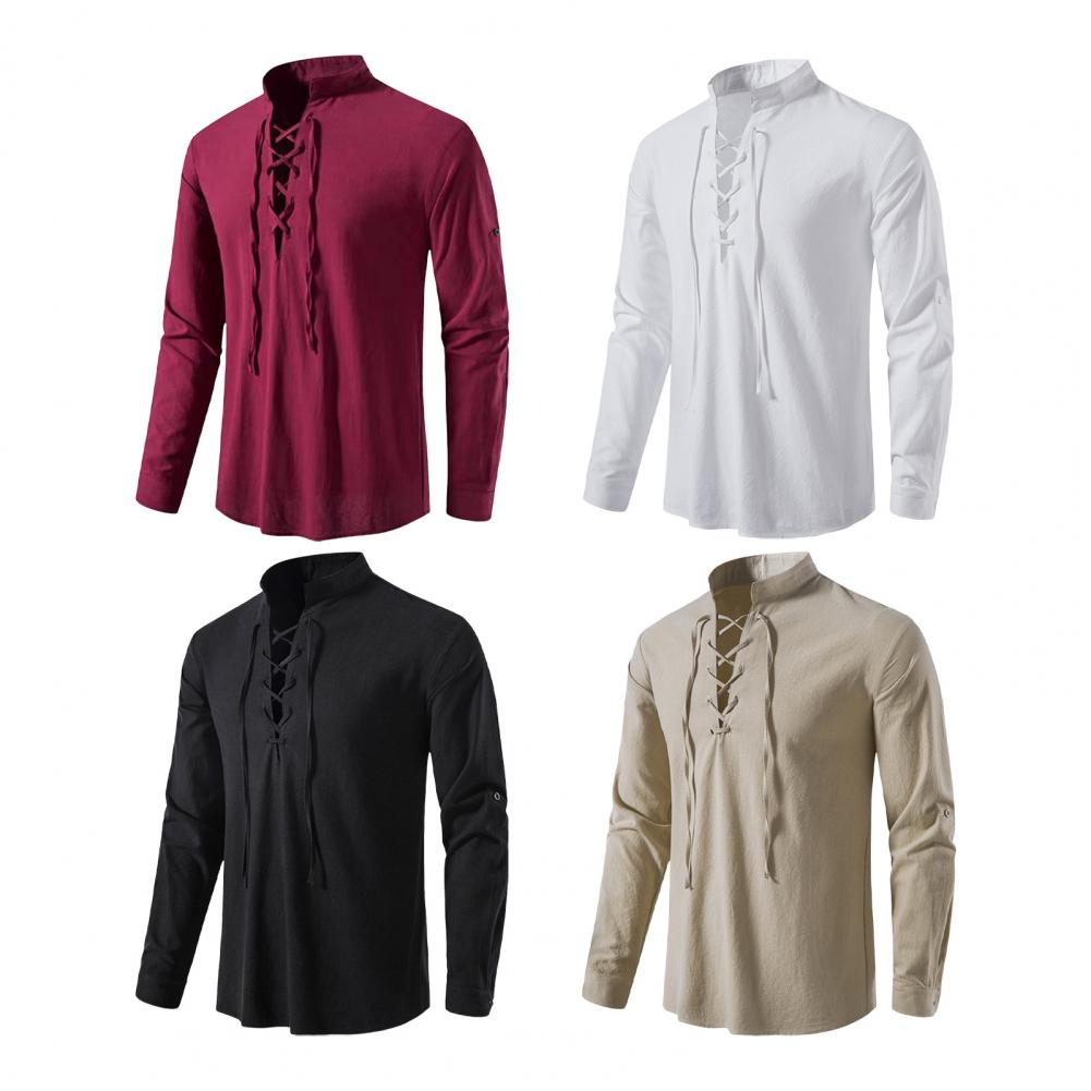 Wiosenna koszula męska sznurowany pasek stójka jednokolorowe długie rękawy Retro Hippie Casual sweter w stylu plażowym średniej długości codzienny top