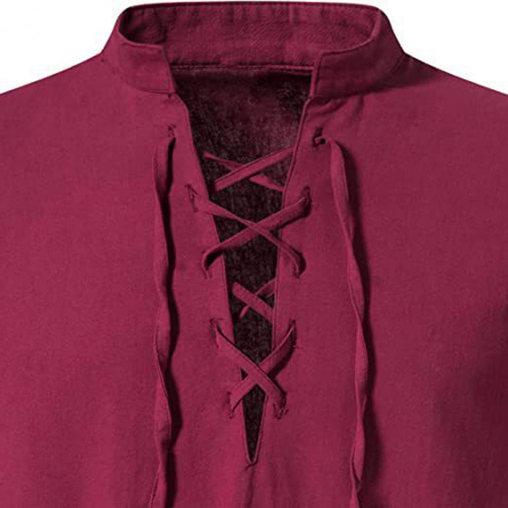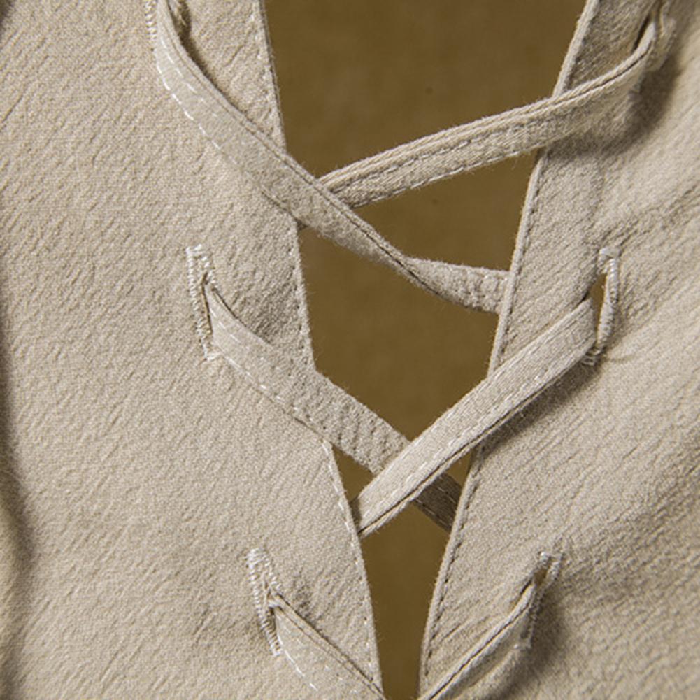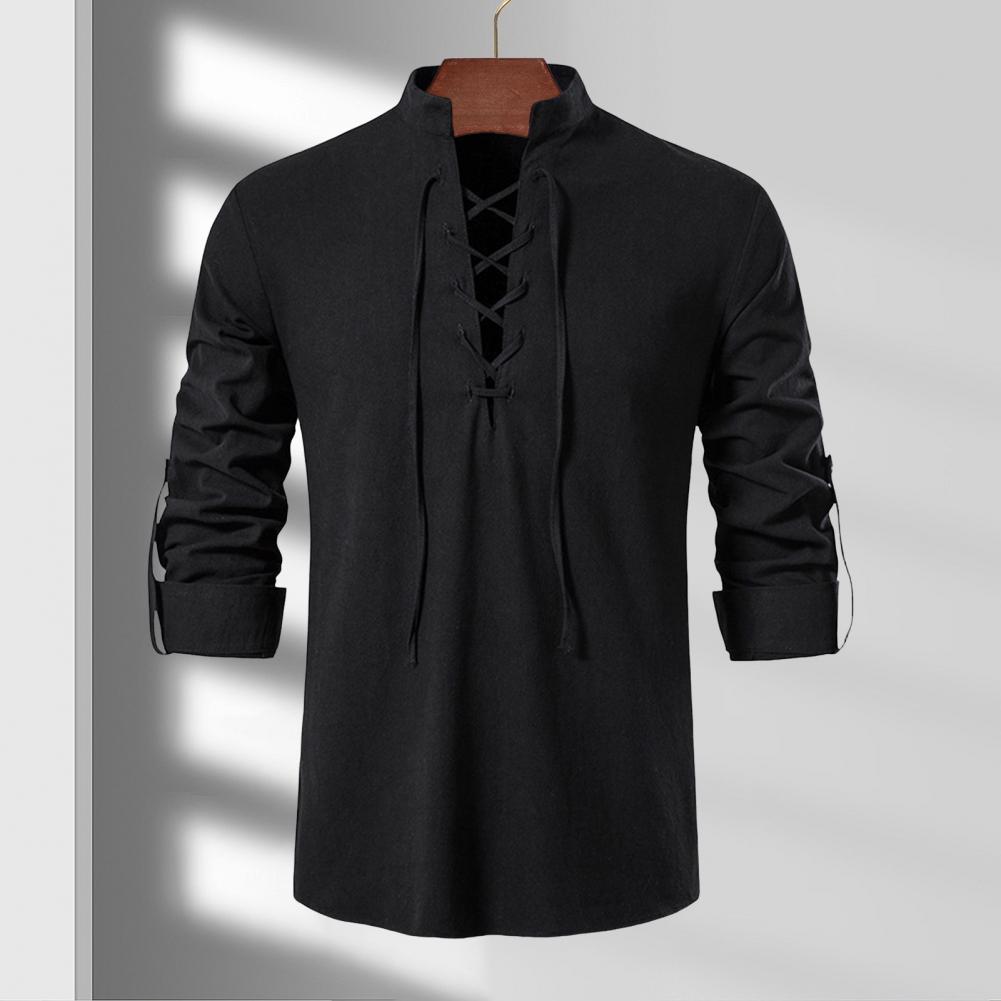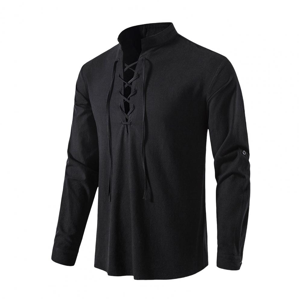 Wiosenna koszula męska sznurowany pasek stójka jednokolorowe długie rękawy Retro Hippie Casual sweter w stylu plażowym średniej długości codzienny top