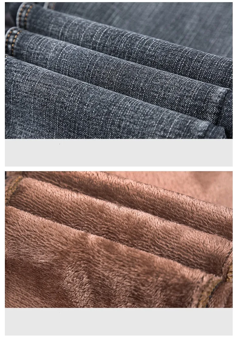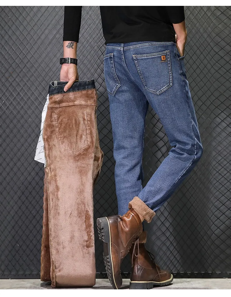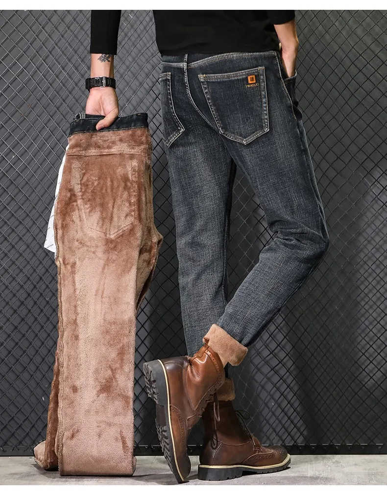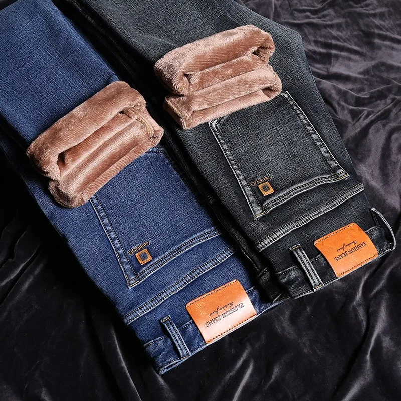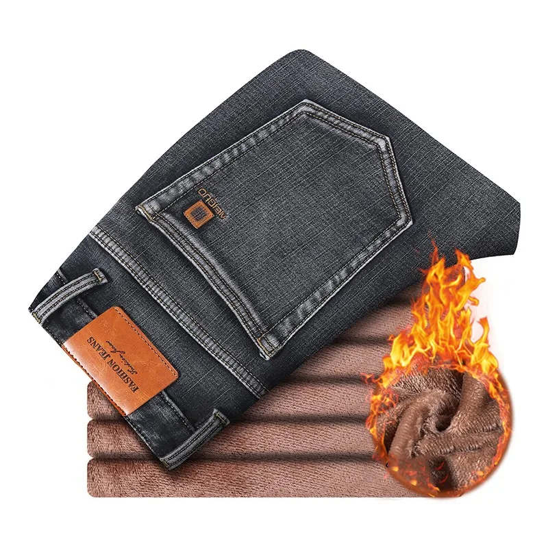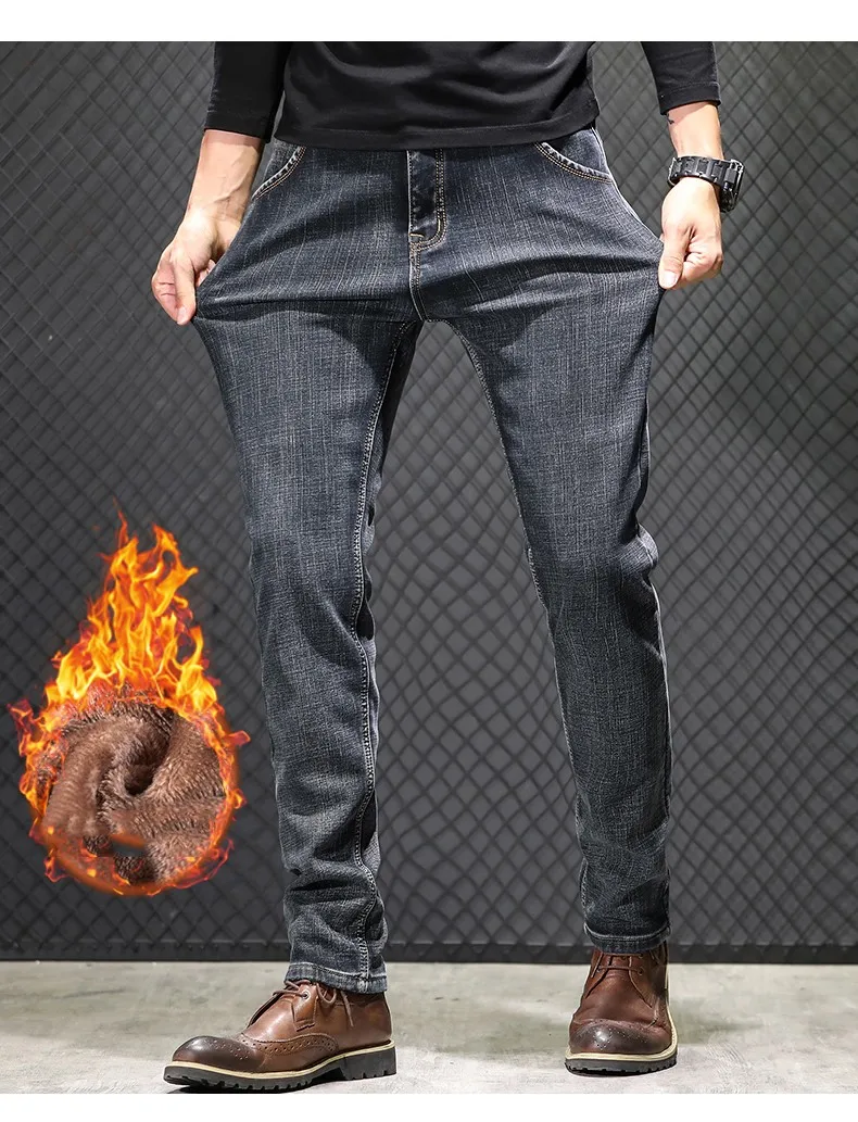 • 2024 New Men's Warm Fleece Jeans Classic Style High Quality Cotton Slim Fit Denim Stretch Trousers Dark Grey Brand Pants