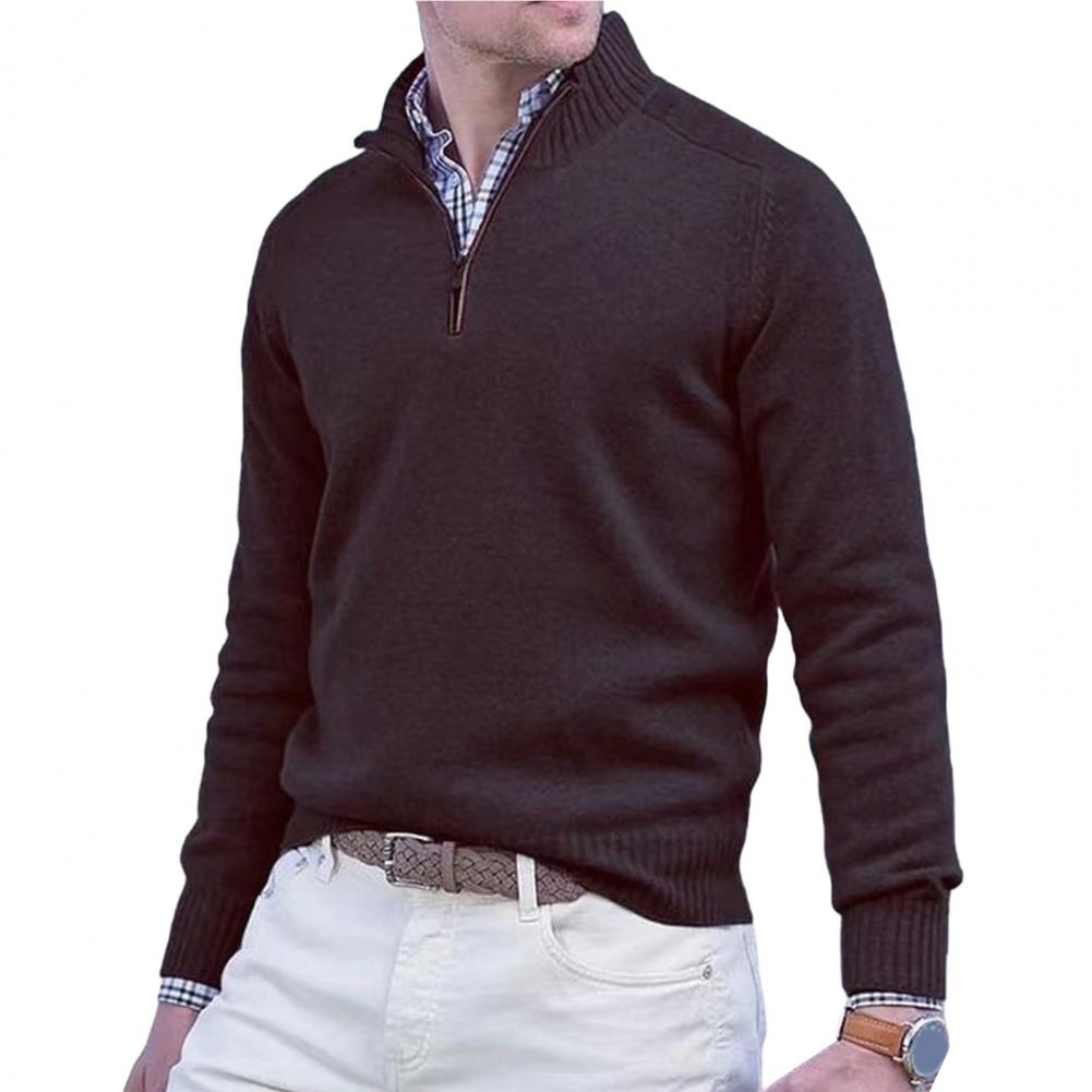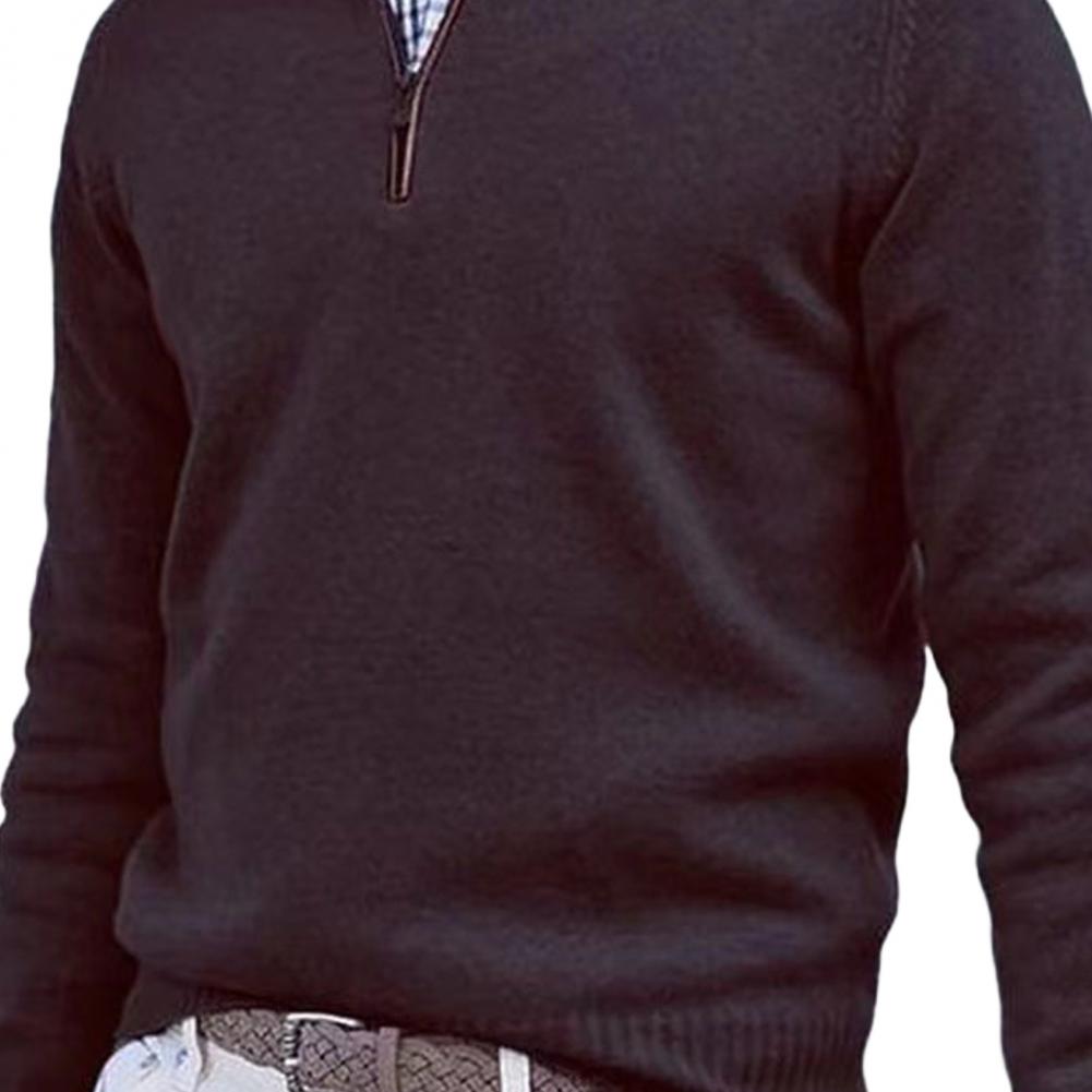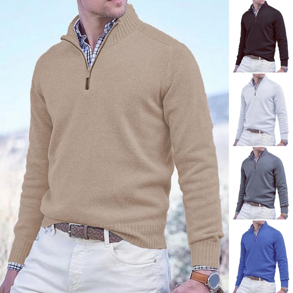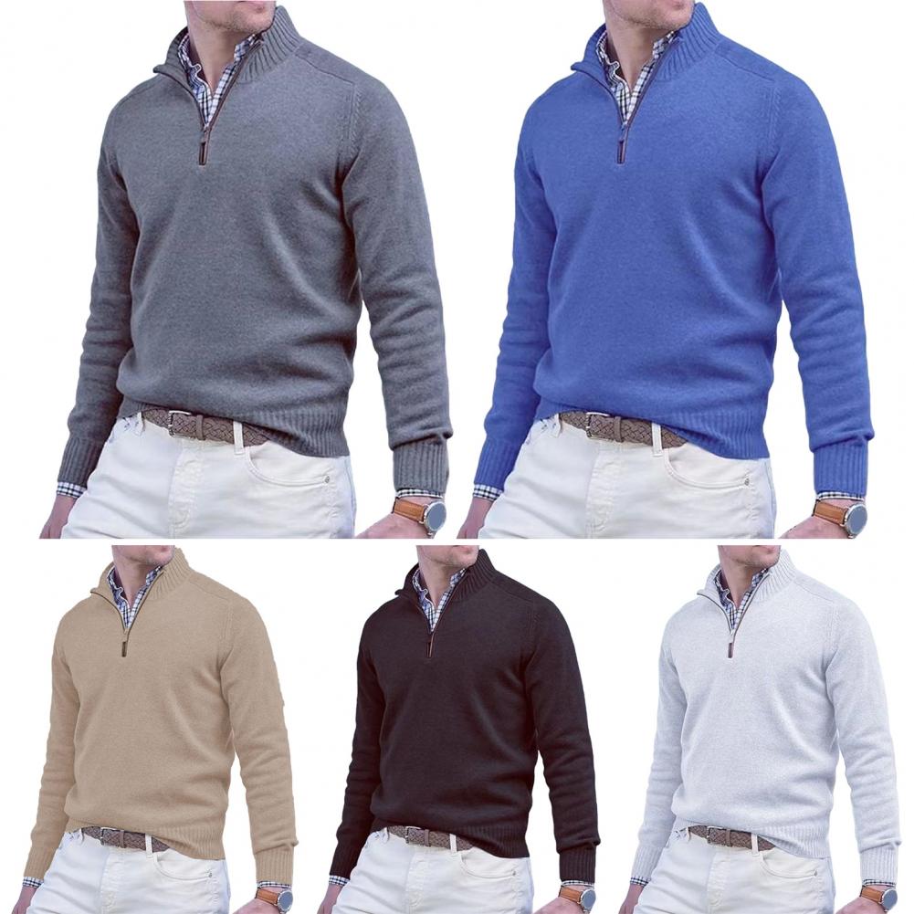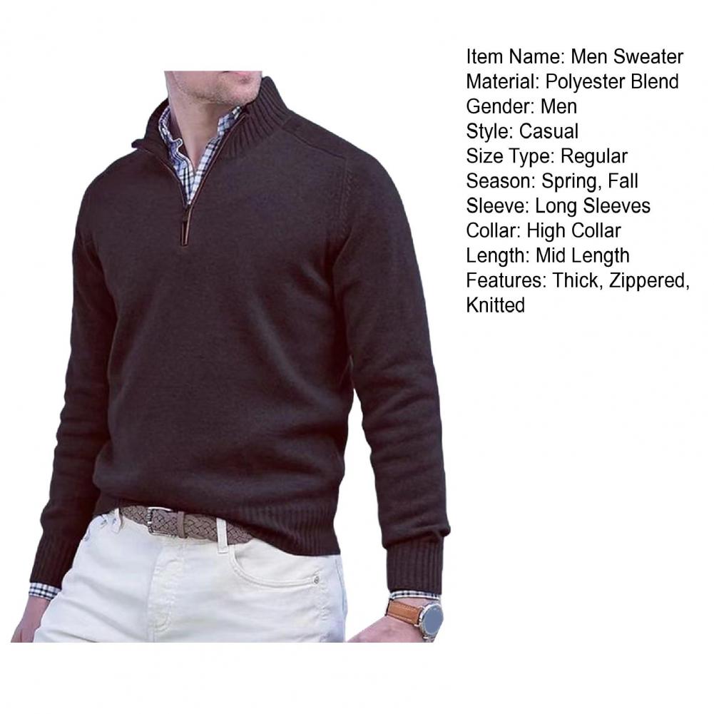 Fall Winter Men Sweater Zippered Half-high Collar Long Sleeves Top Knitted Thick Warm Pure Color Pullover Stretchy Daily Wear Knitwear