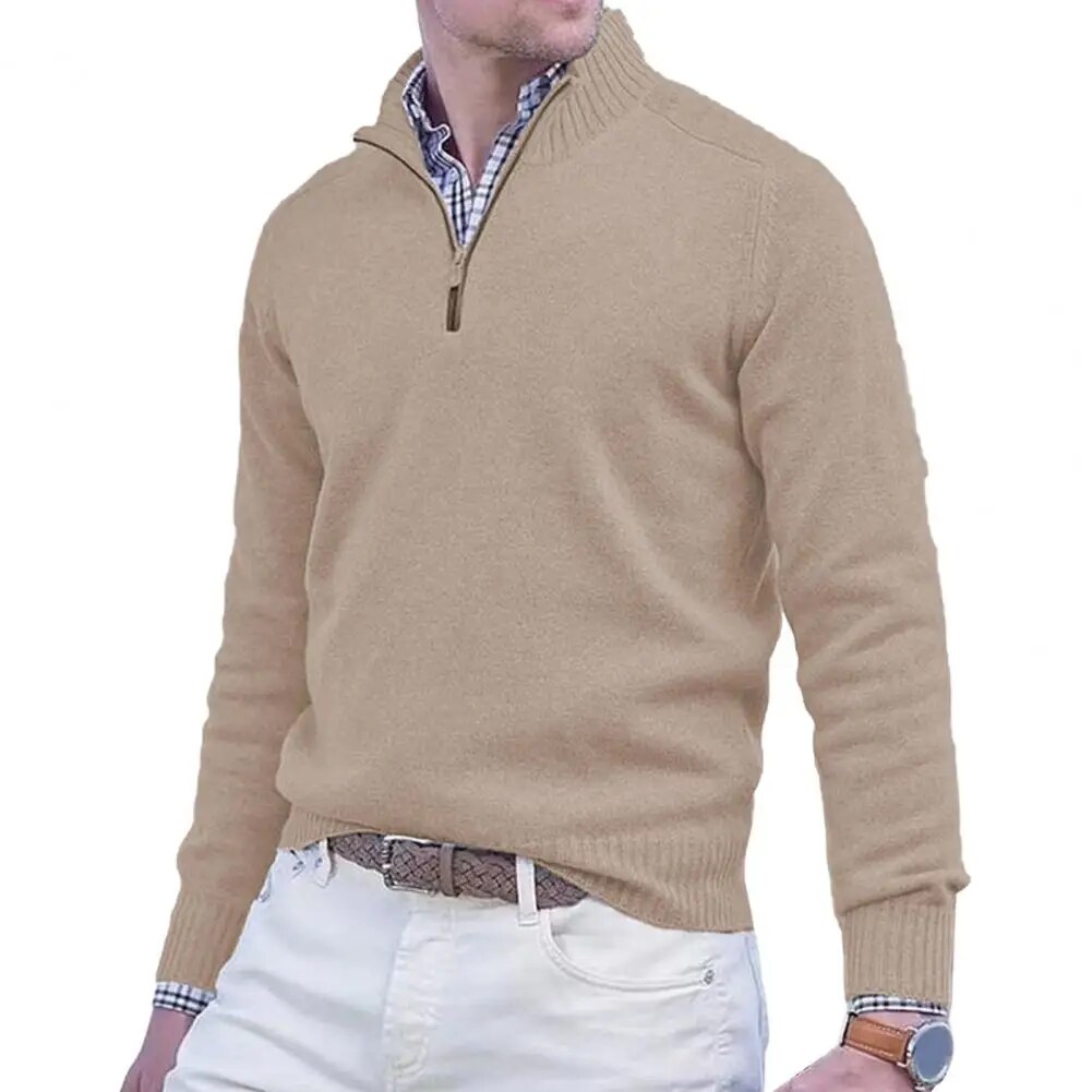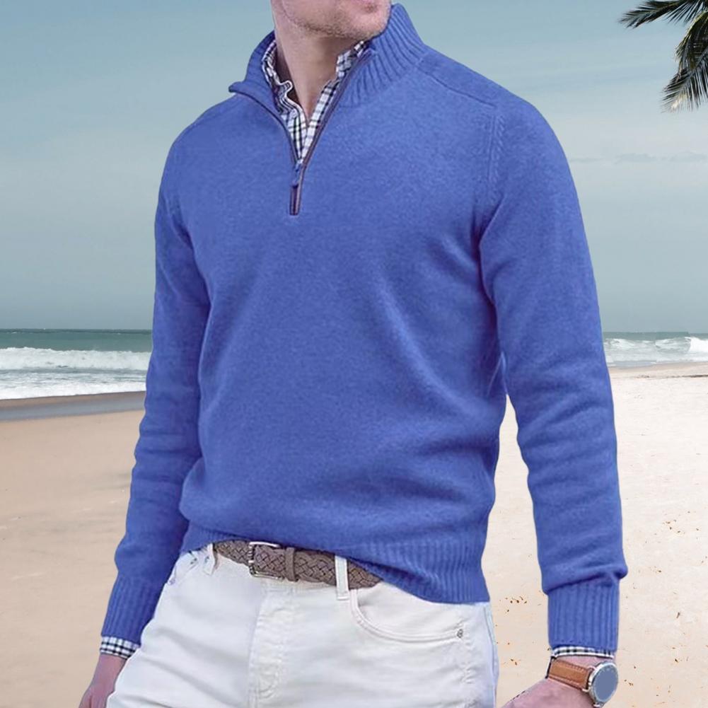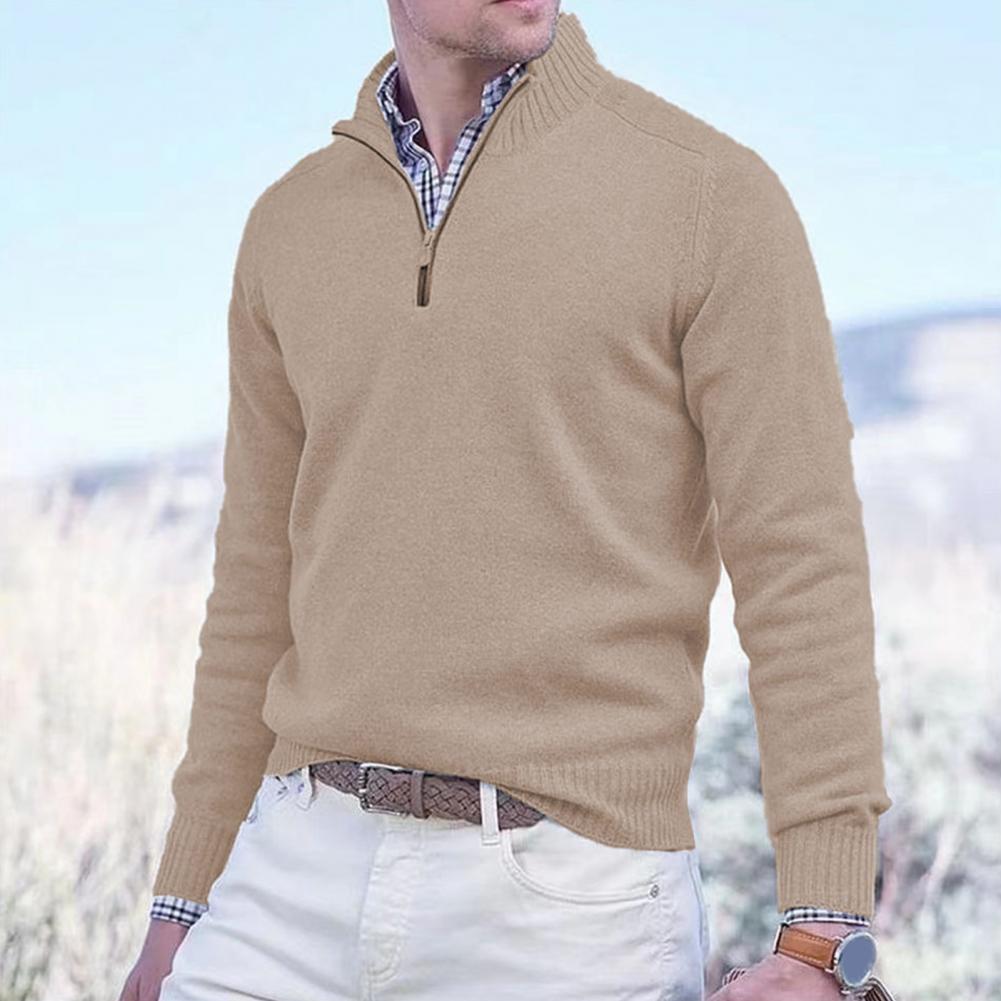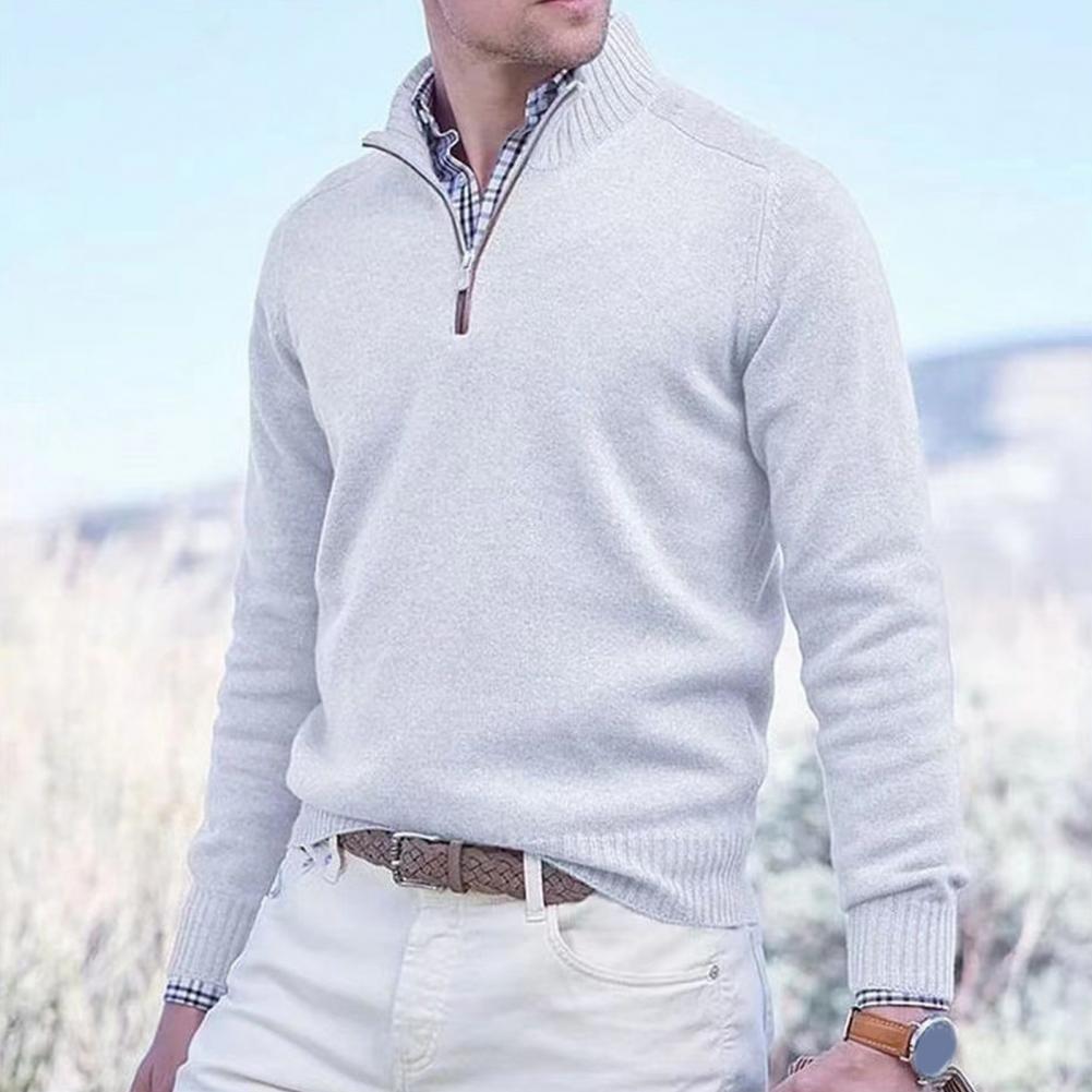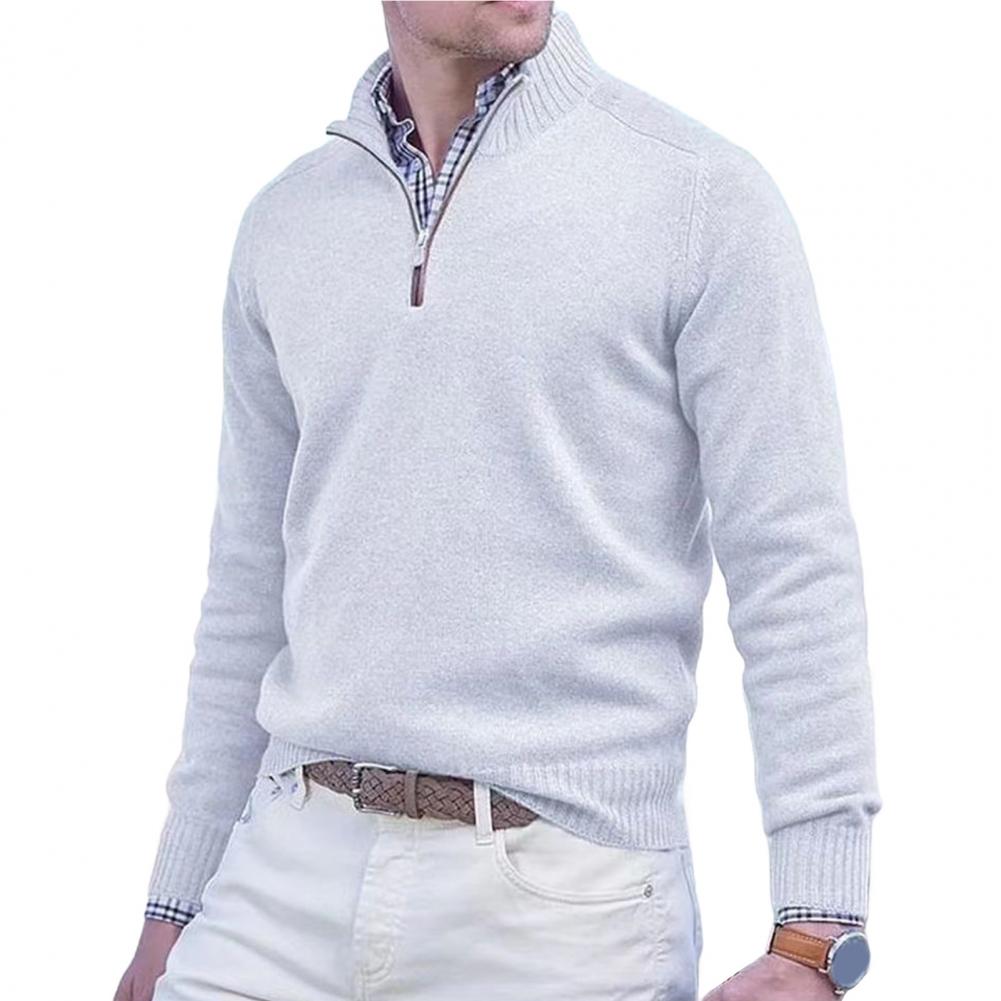 Fall Winter Men Sweater Zippered Half-high Collar Long Sleeves Top Knitted Thick Warm Pure Color Pullover Stretchy Daily Wear Knitwear