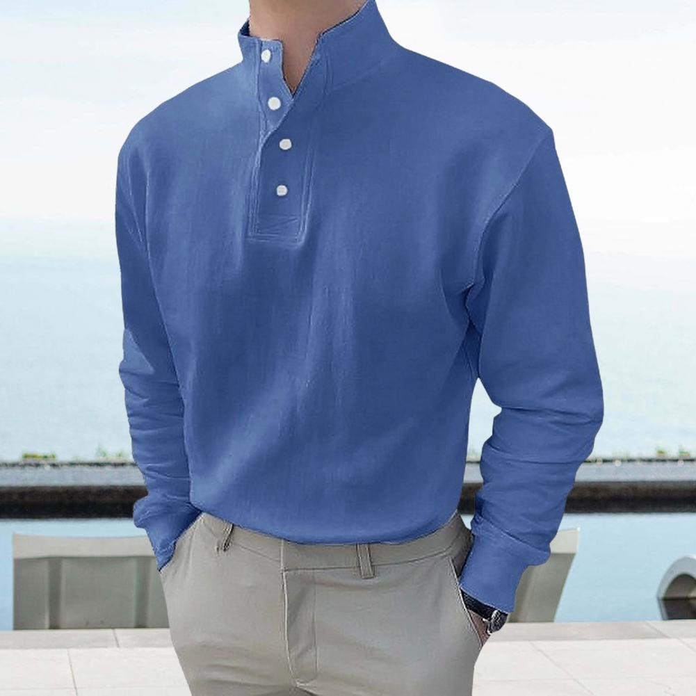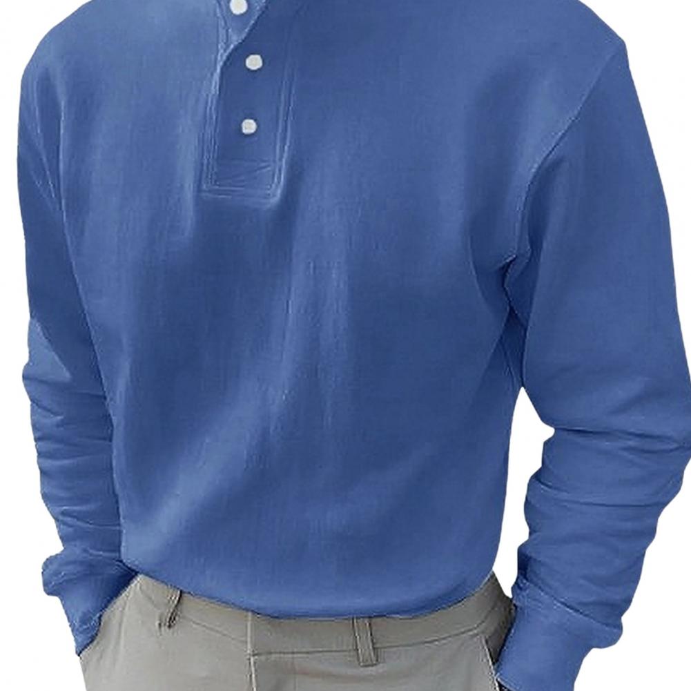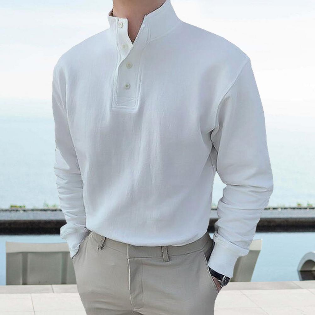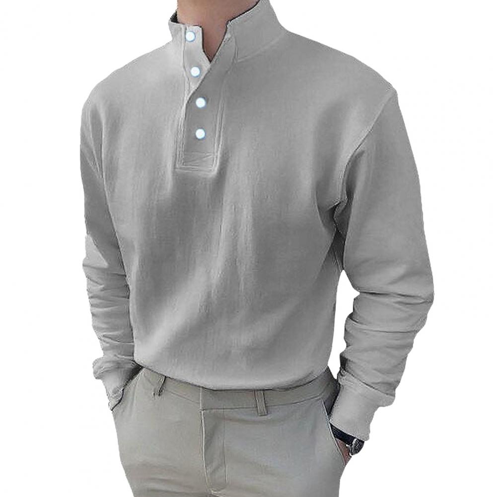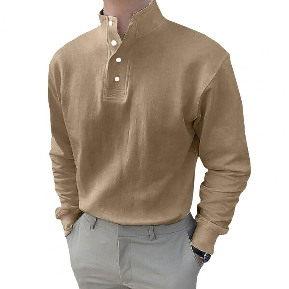 Autumn Spring Men Shirt Buttoned Half-open Stand Collar Long Sleeves Solid Color Elastic Cuff Loose Pullover Daily Wear Office Top