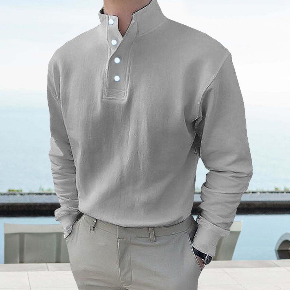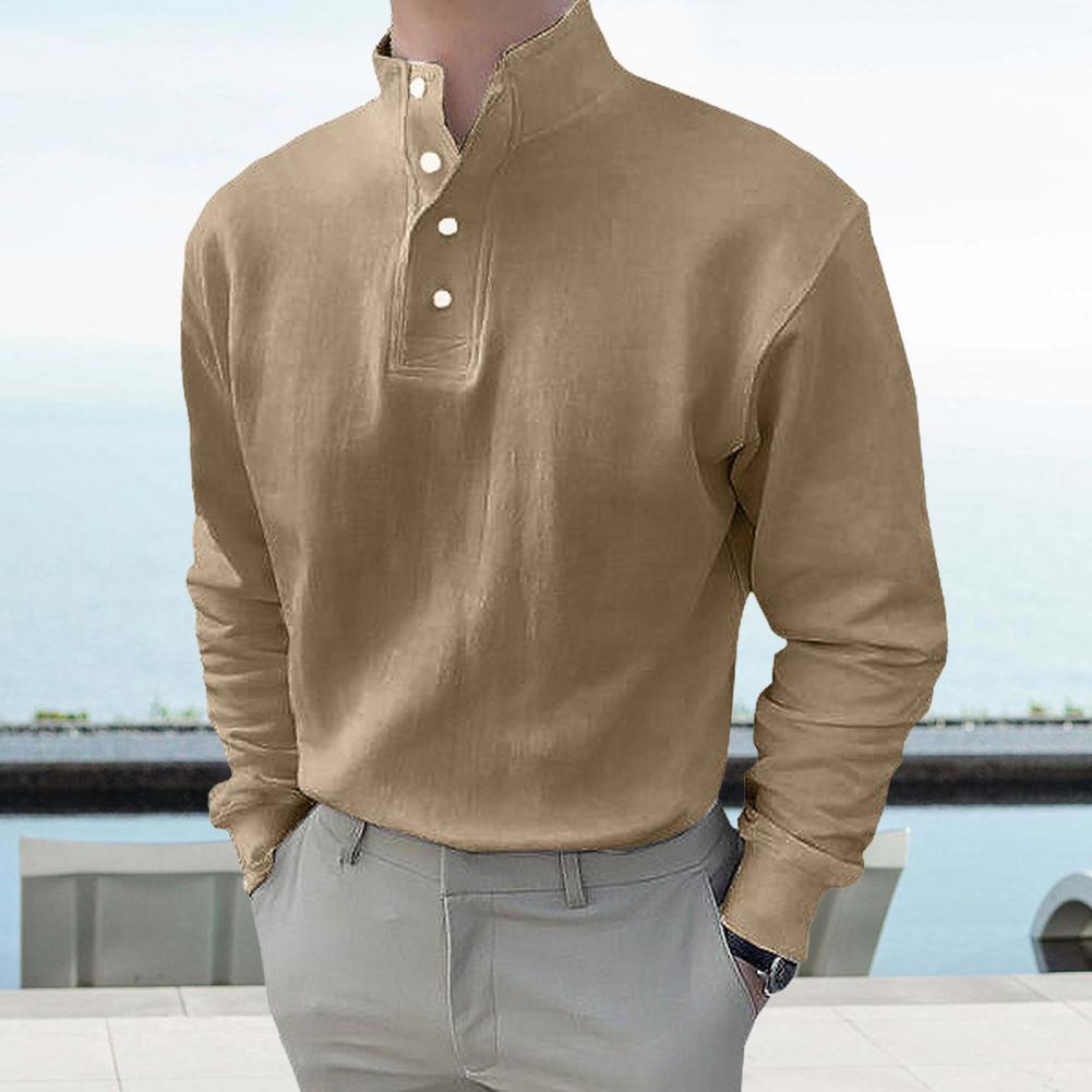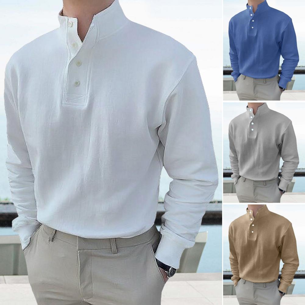 Style: Embrace a classic yet stylish look with this men's top featuring a loose fit, solid color design, stand-up collar, and long sleeves for a versatile wardrobe staple.