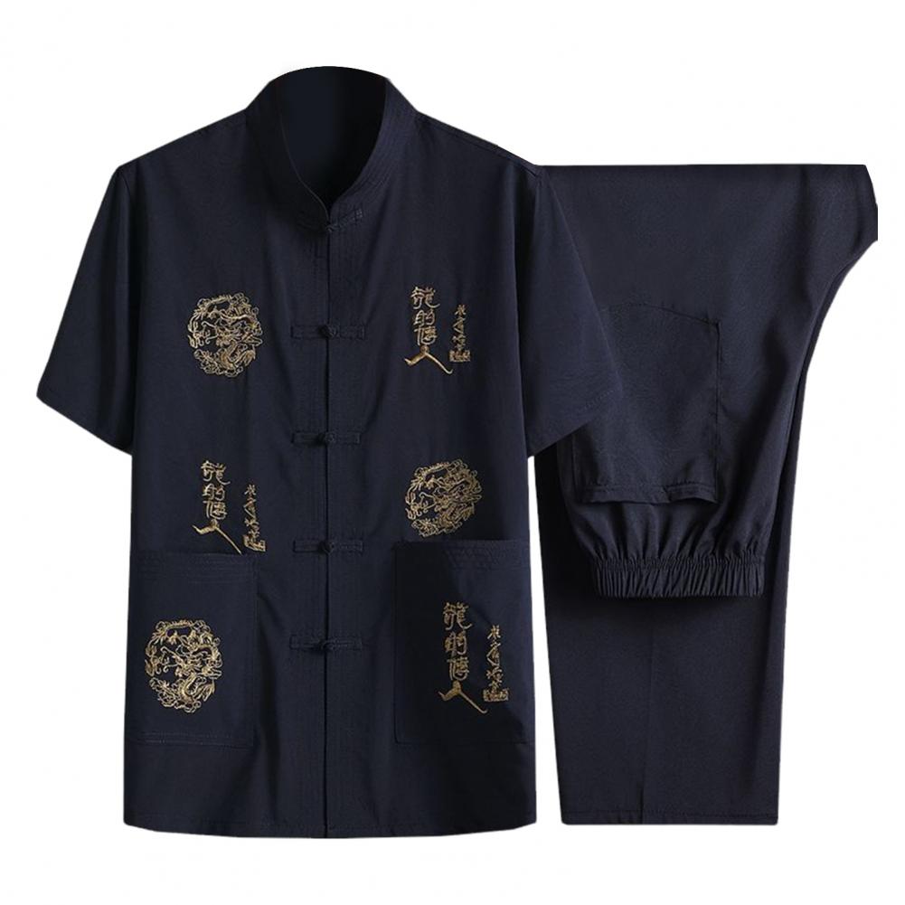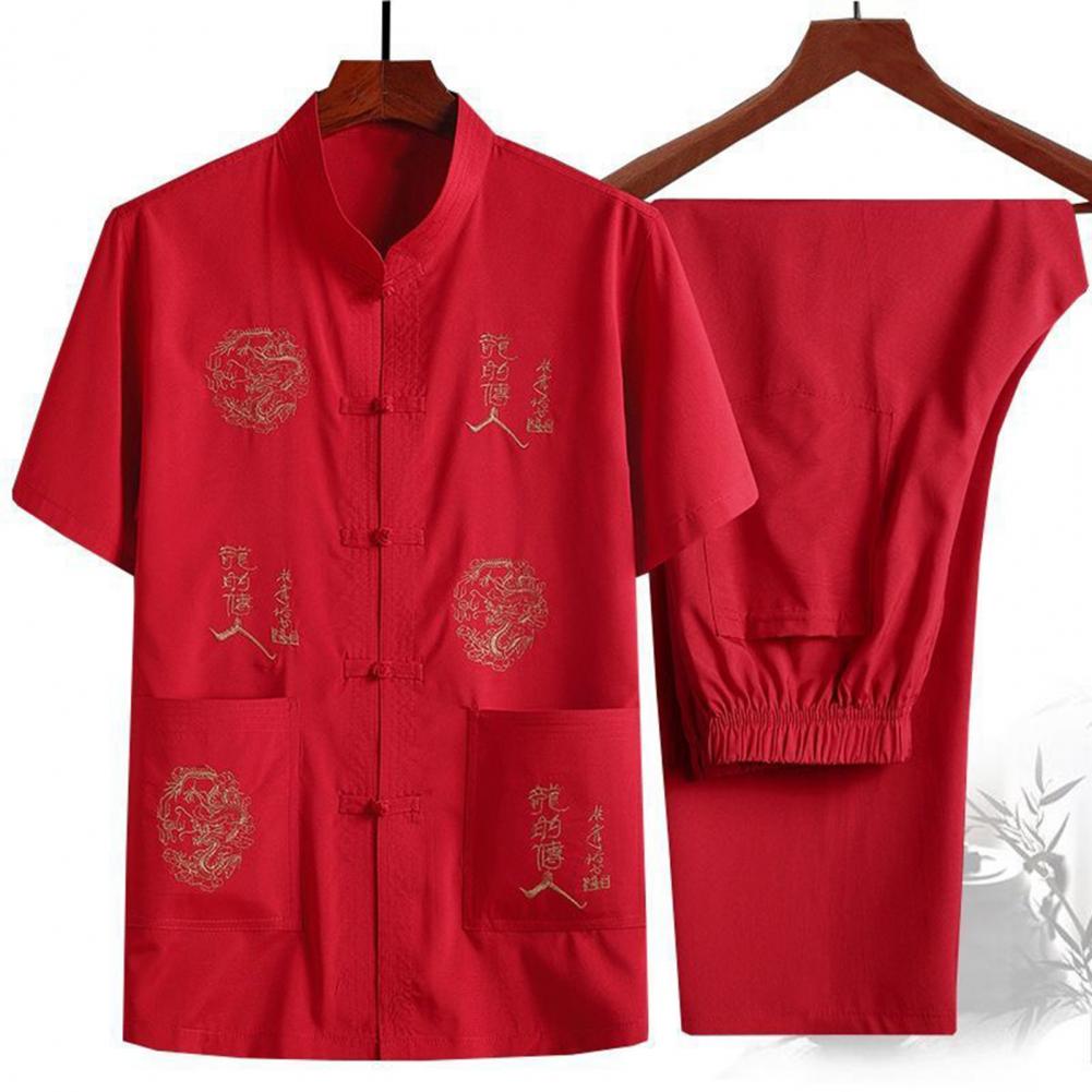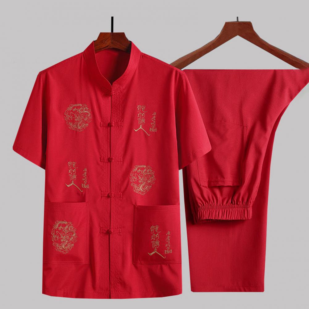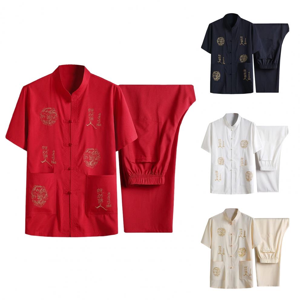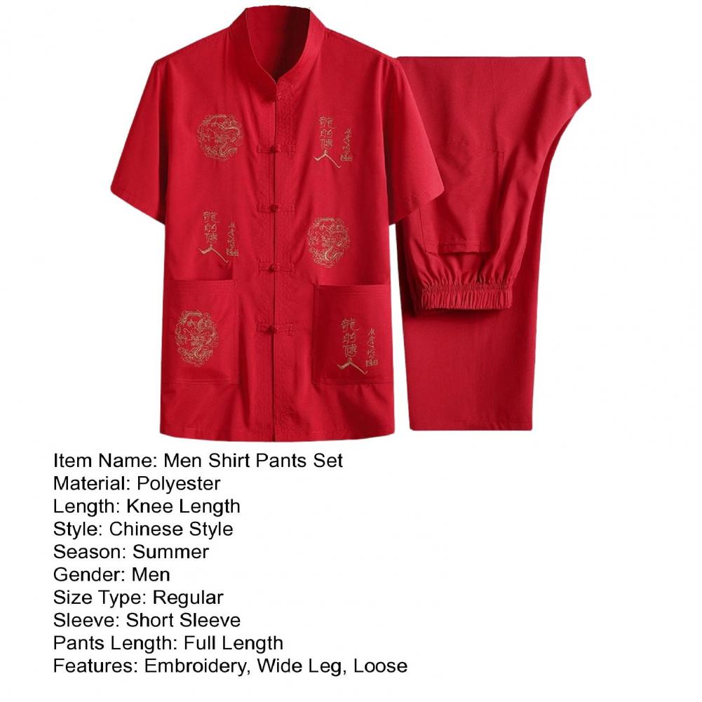 Introducing our versatile and stylish Chinese-style men's suit, perfect for any occasion. This 2-piece set includes a short-sleeved top and elastic-waisted trousers, both featuring pockets and traditional Chinese elements such as dragon embroidery and characters.