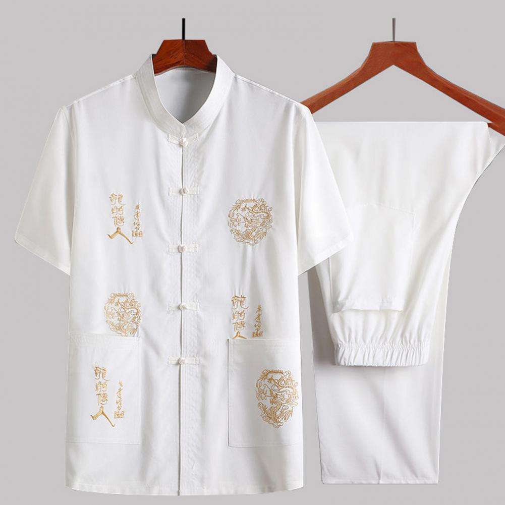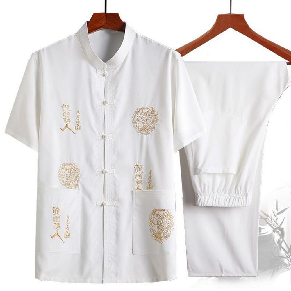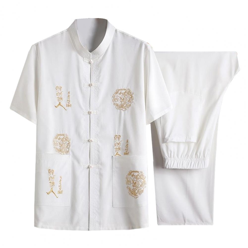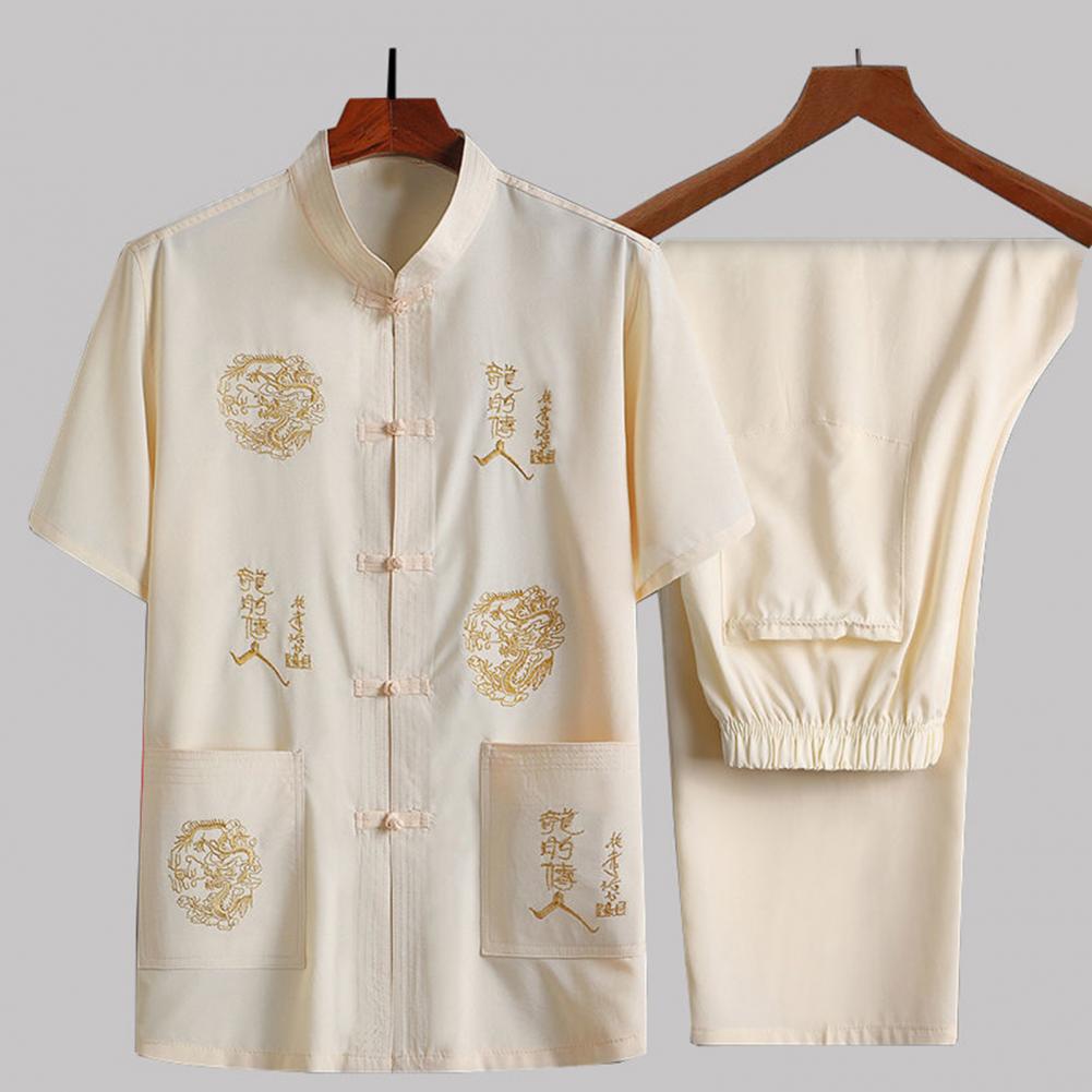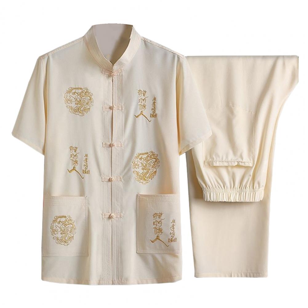 Introducing our versatile and stylish Chinese-style men's suit, perfect for any occasion. This 2-piece set includes a short-sleeved top and elastic-waisted trousers, both featuring pockets and traditional Chinese elements such as dragon embroidery and characters.