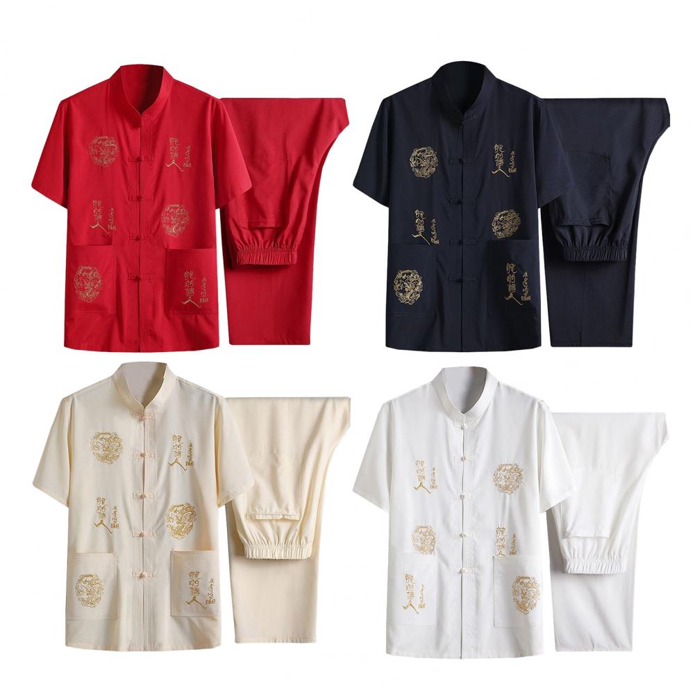 2 Pcs/Set Men Shirt Pants Set Retro Chinese Tang Suit Top Stand Collar Single-breasted Embroidery Short Sleeve Elastic Waist Wide Leg Father Mid-aged Men Top Trousers Set