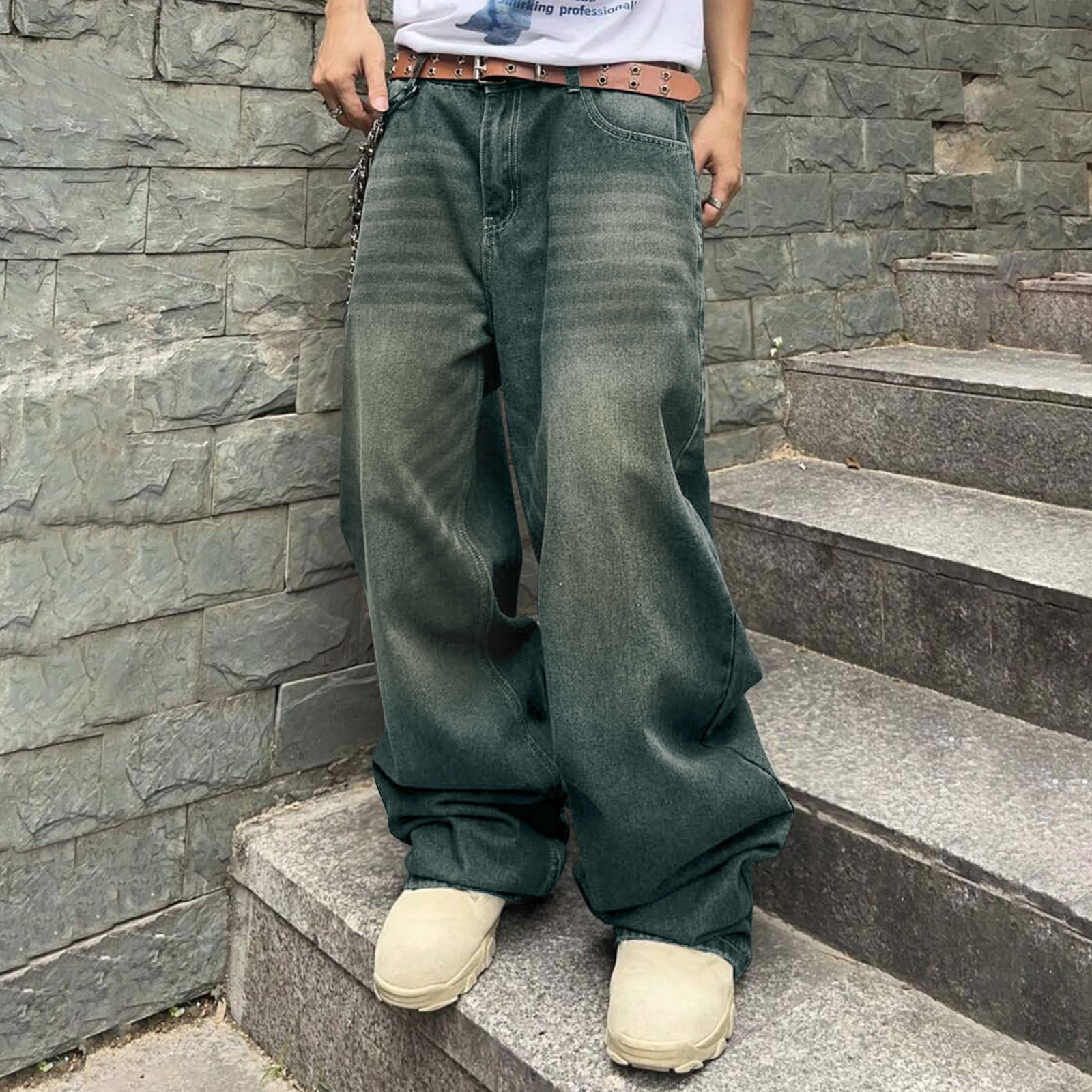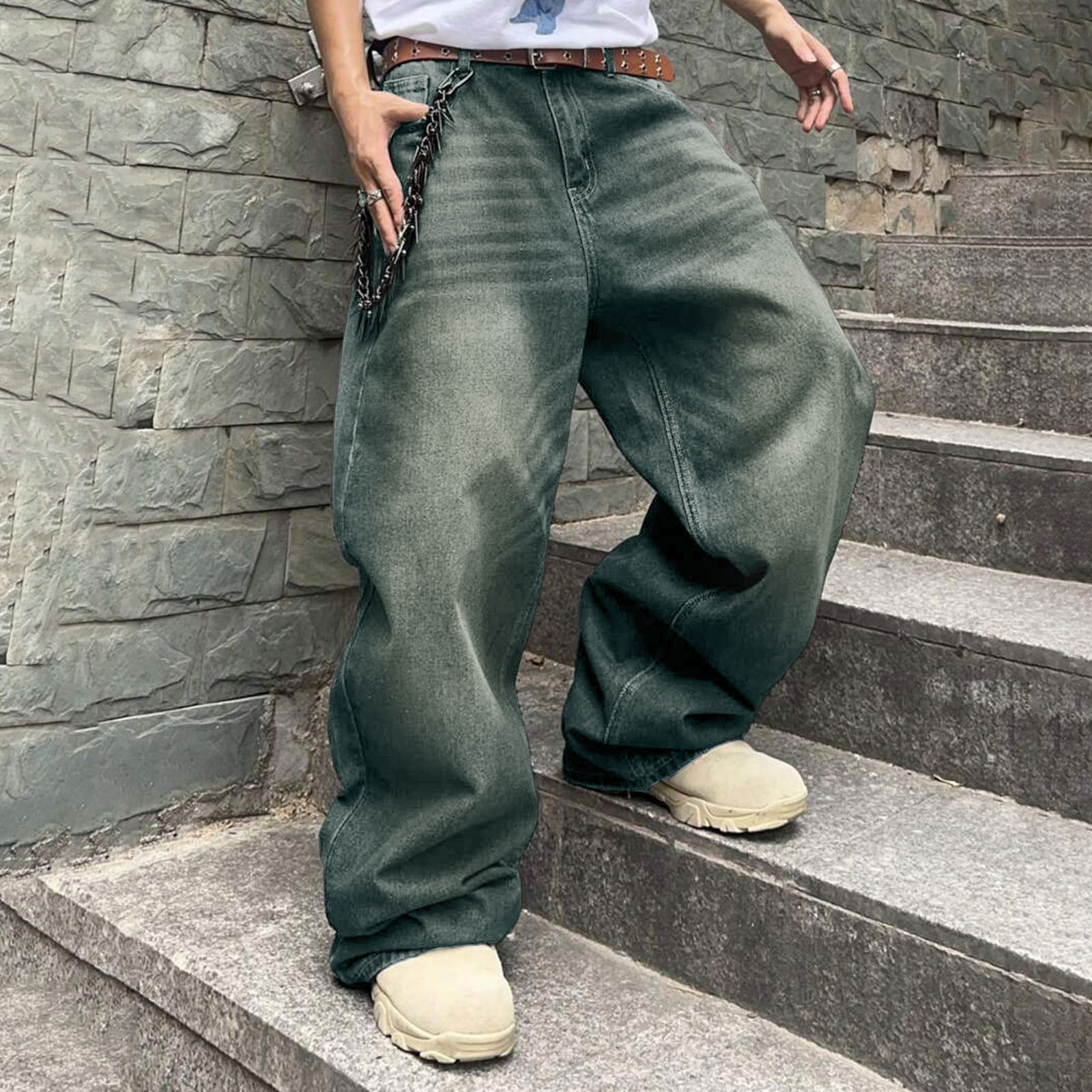 Men's Baggy Hip Hop Jeans Wide Leg Skater Denim Pants Casual Loose Fit Long Trousers Streetwear