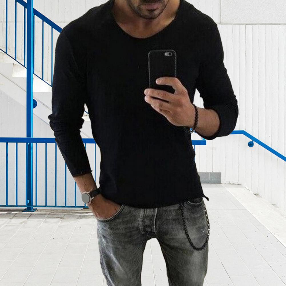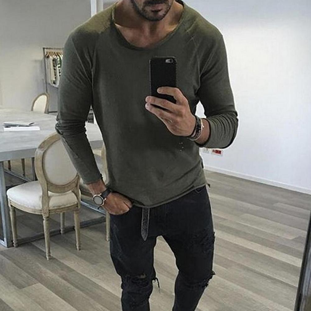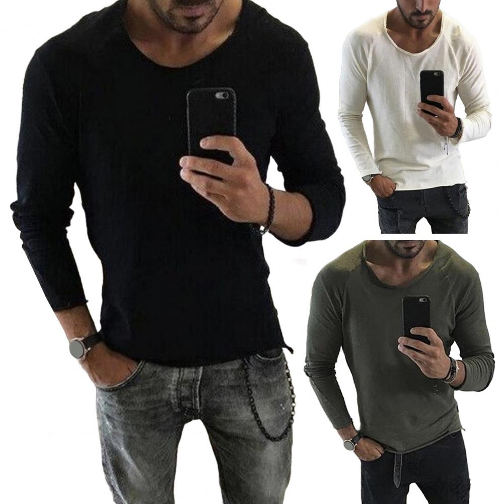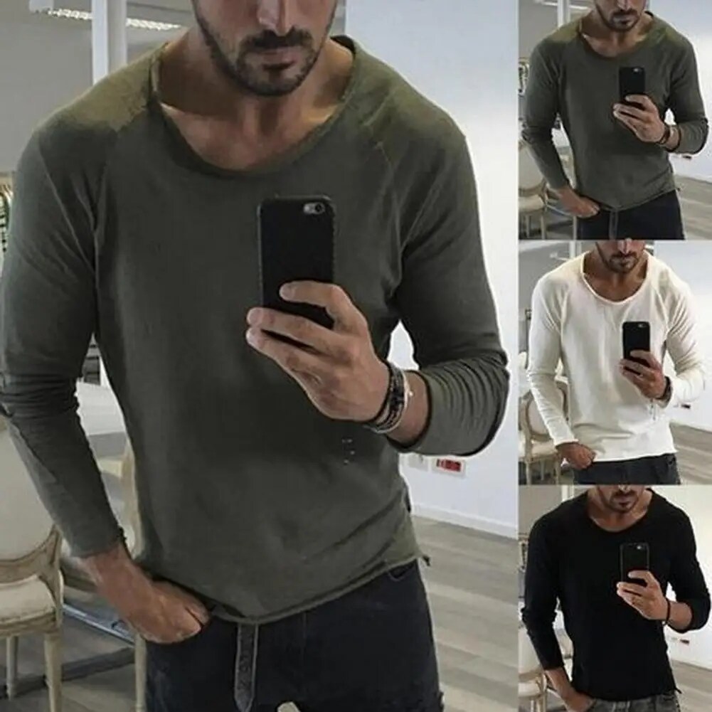 Spring Fall Men Top Slim Fit Ripped Edge O Neck Solid Color Long Sleeves Pullover Mid Length Retro Style Daily Wear Casual T-shirt