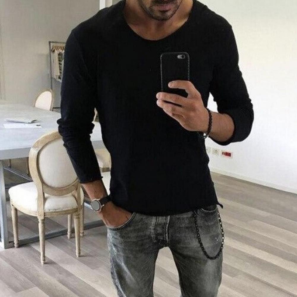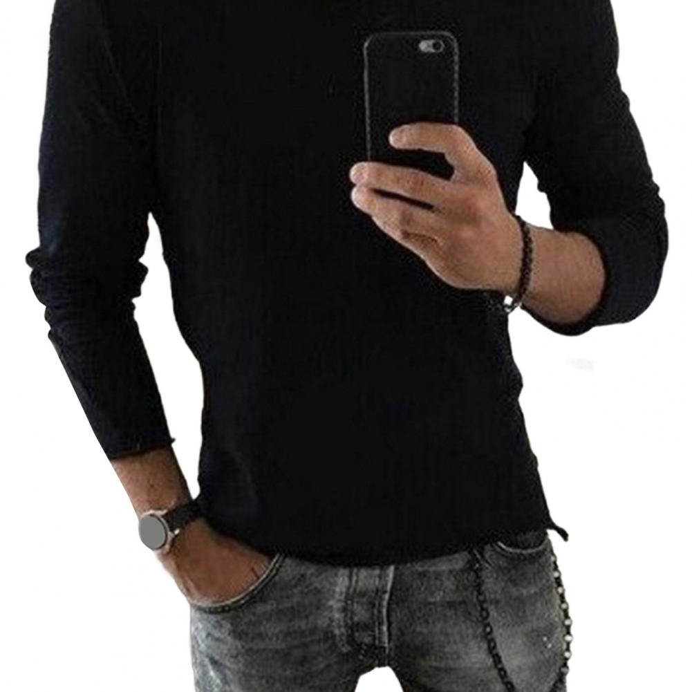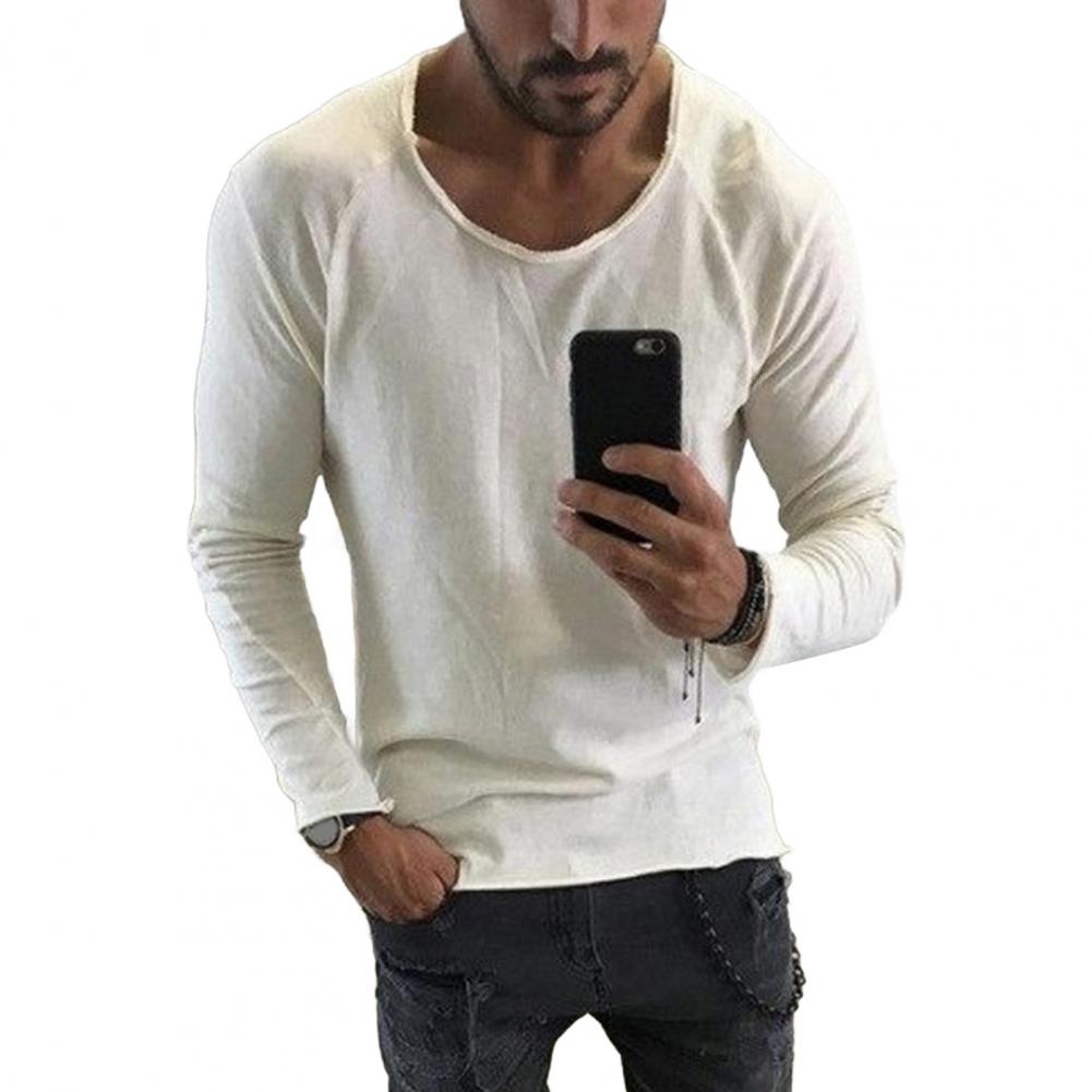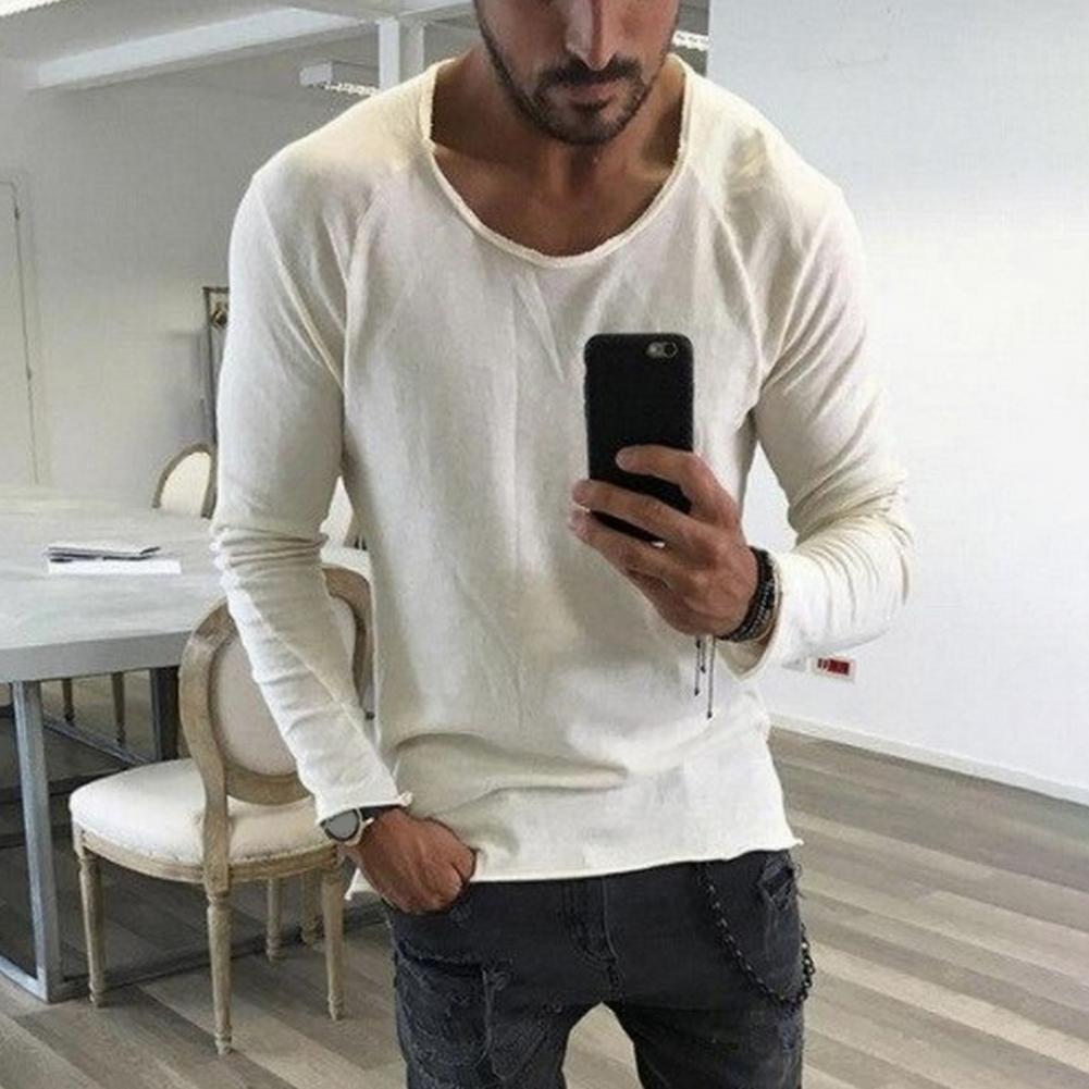 Spring Fall Men Top Slim Fit Ripped Edge O Neck Solid Color Long Sleeves Pullover Mid Length Retro Style Daily Wear Casual T-shirt