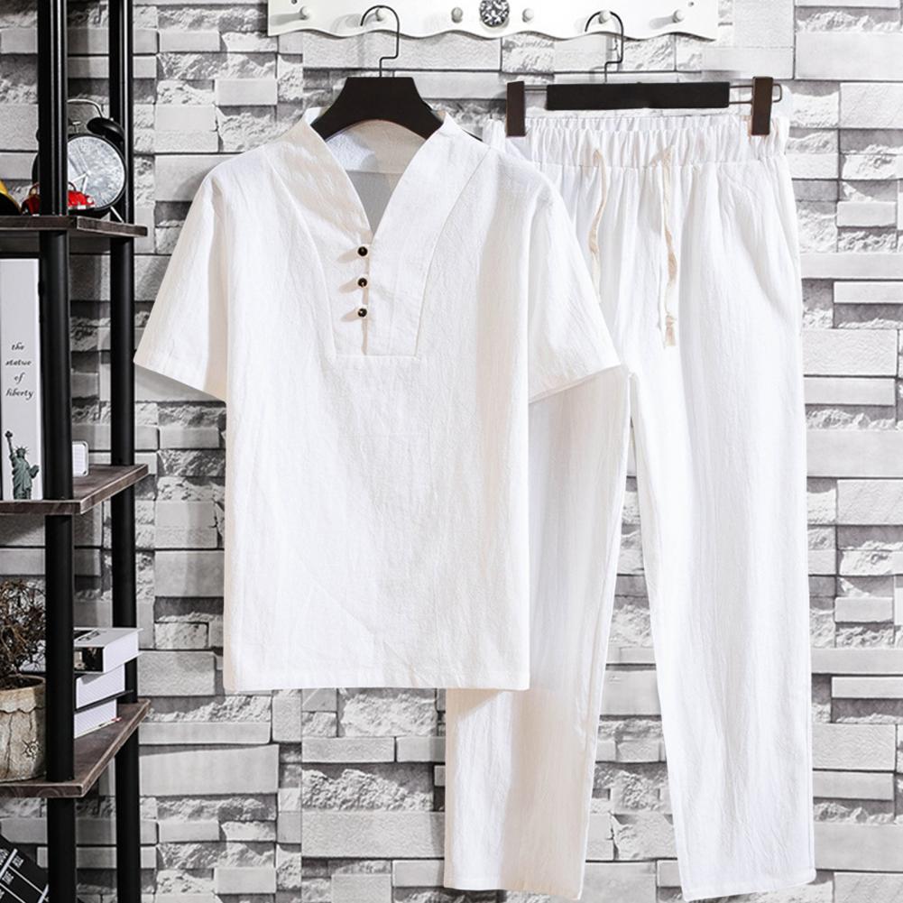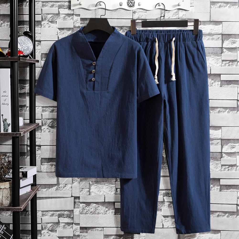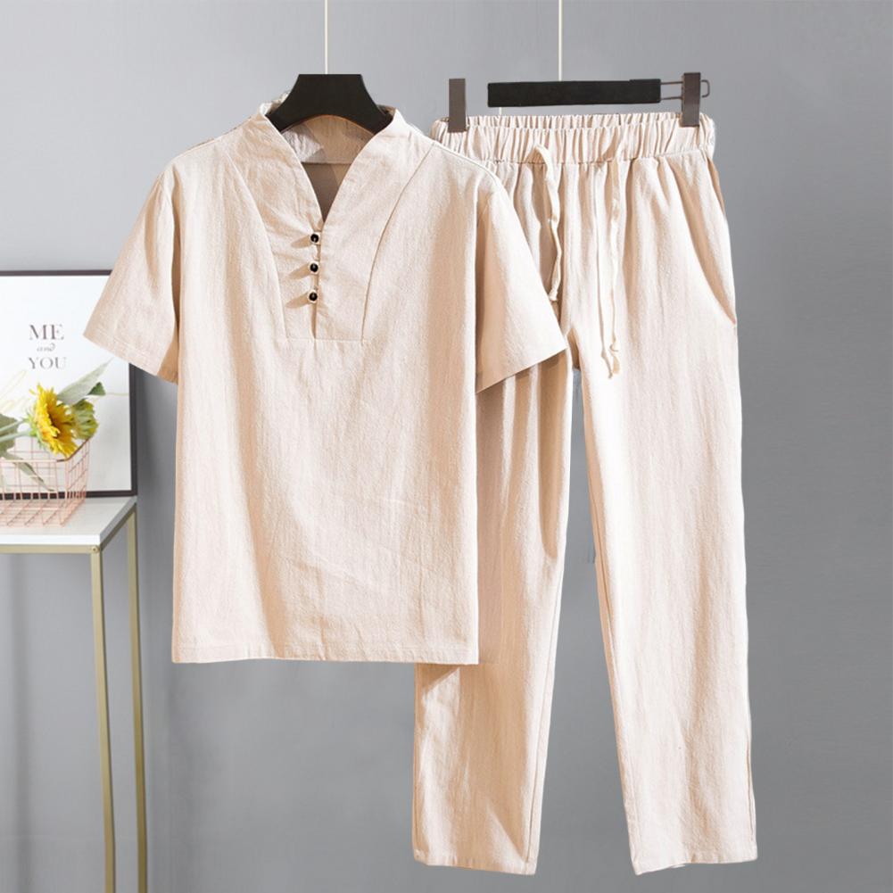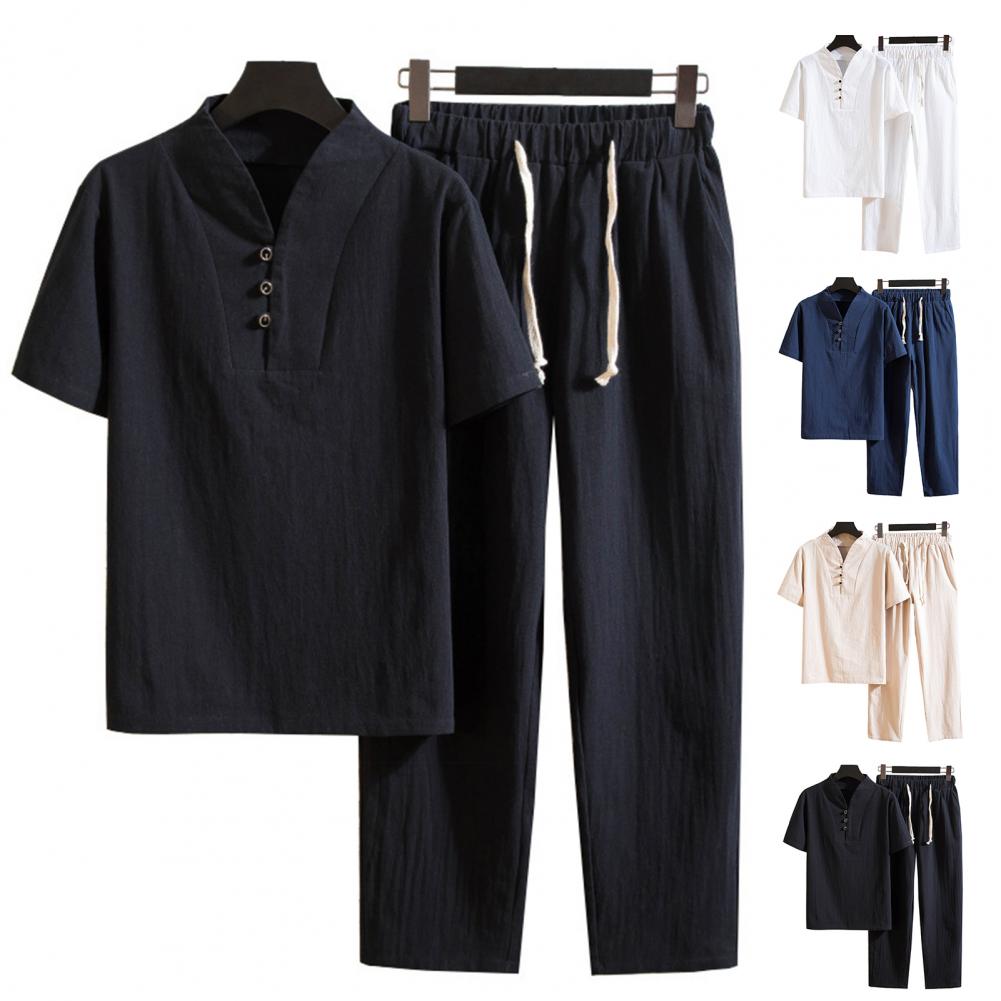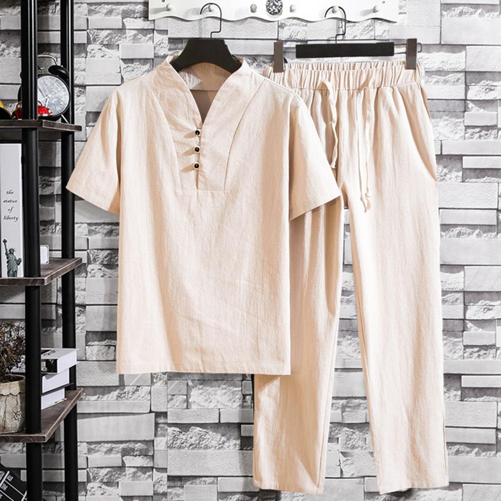 • New Arrival Men's Cotton and Linen Short Sleeve T-shirt+Ankle Length Pant Set Solid Shirt+Trousers Home Suits Male Size M-3XL