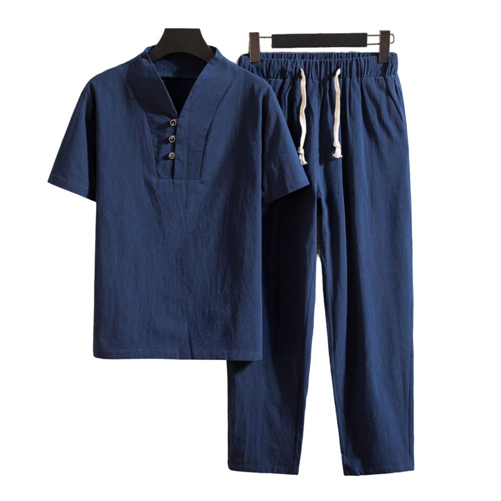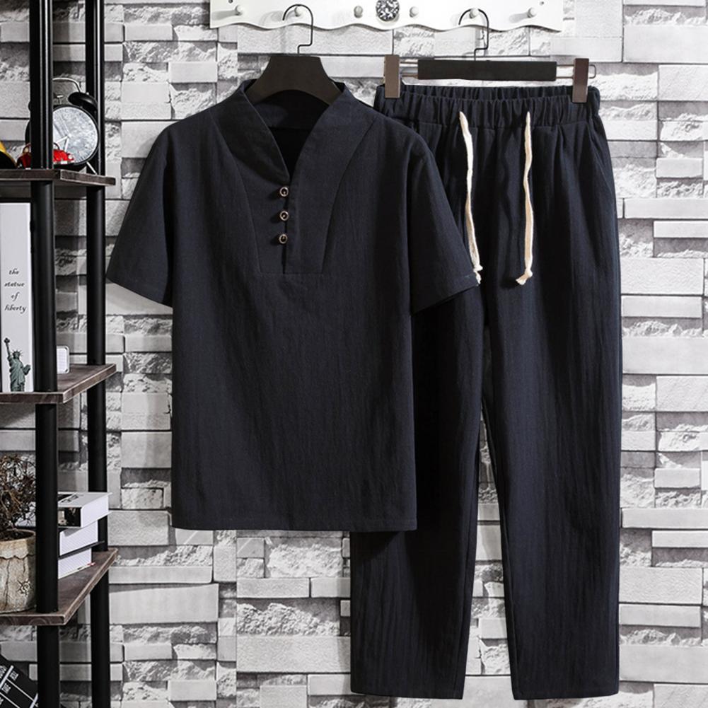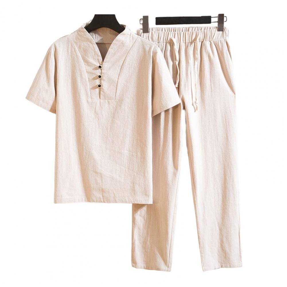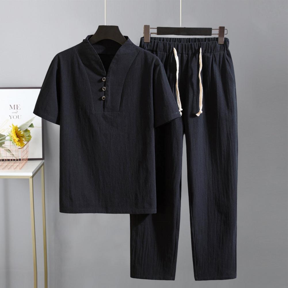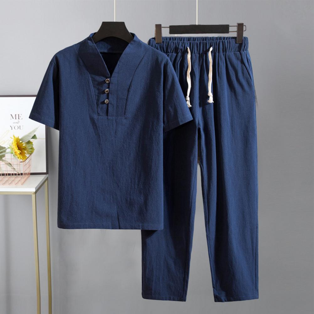 • New Arrival Men's Cotton and Linen Short Sleeve T-shirt+Ankle Length Pant Set Solid Shirt+Trousers Home Suits Male Size M-3XL