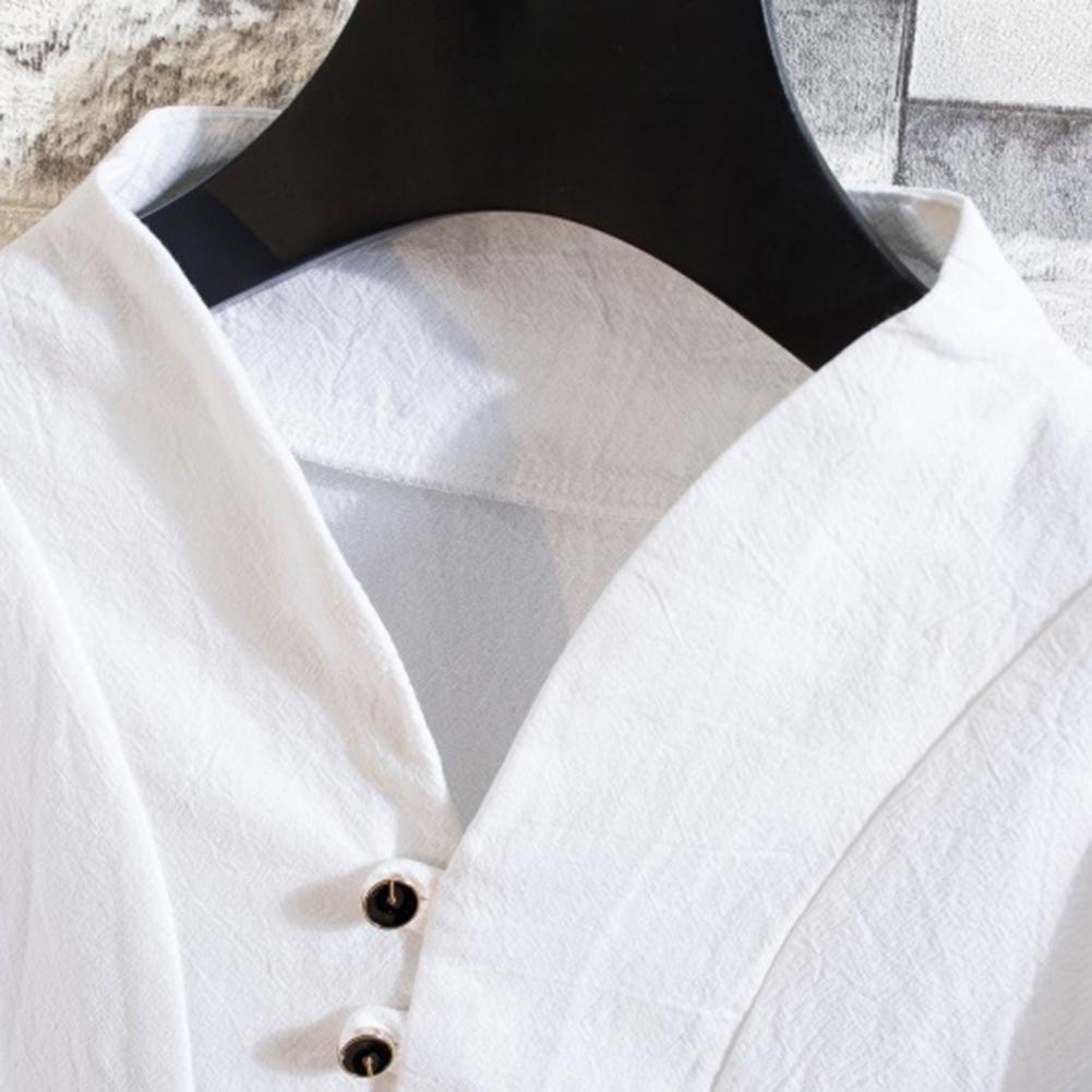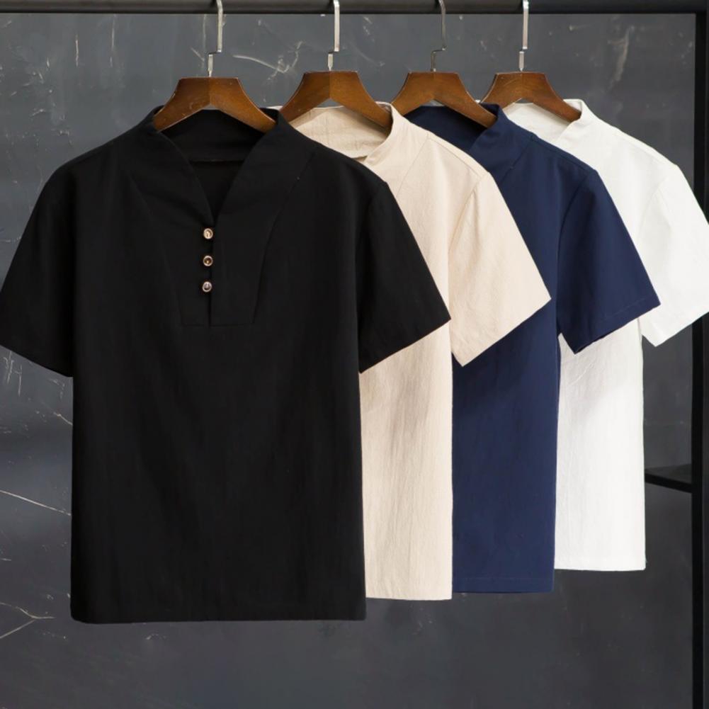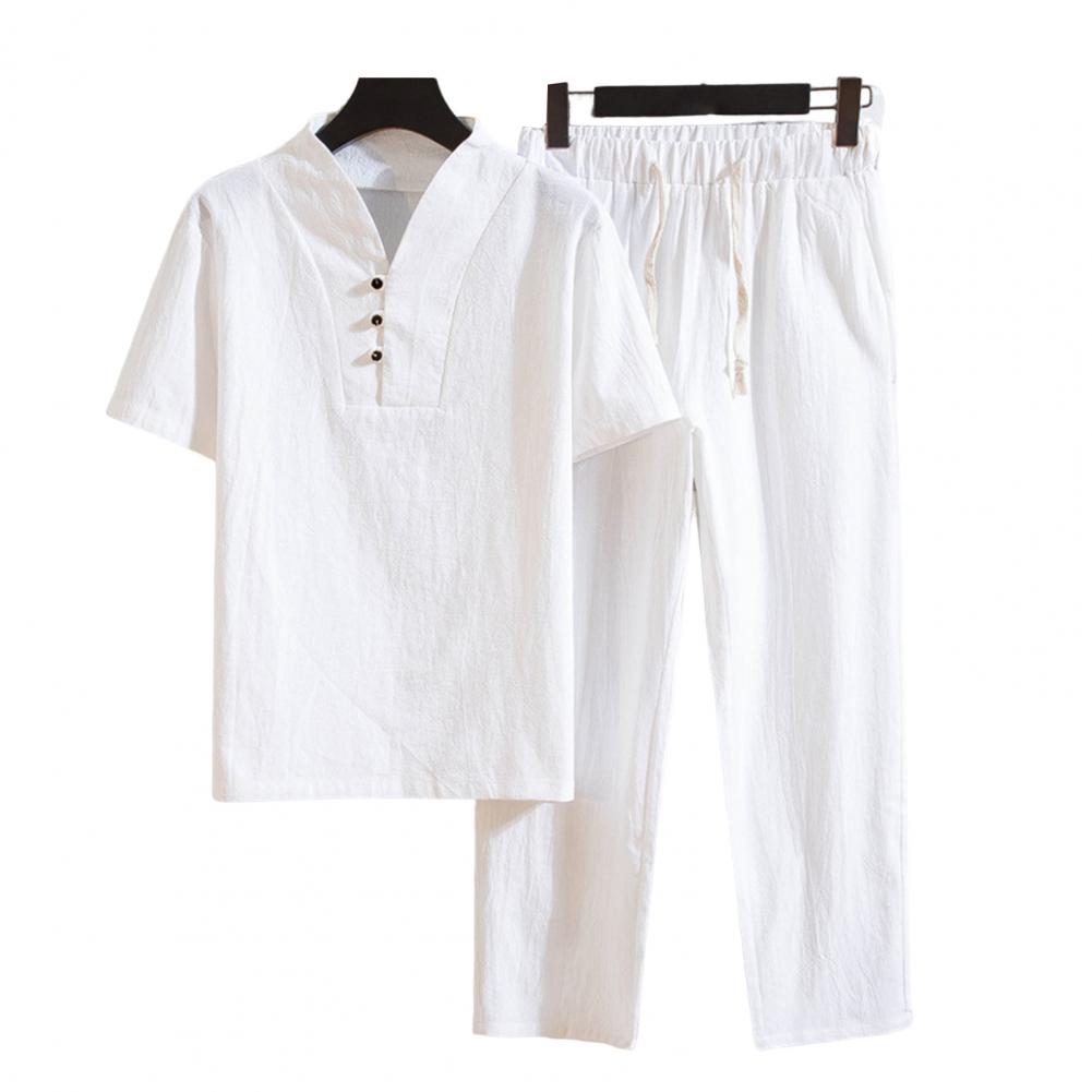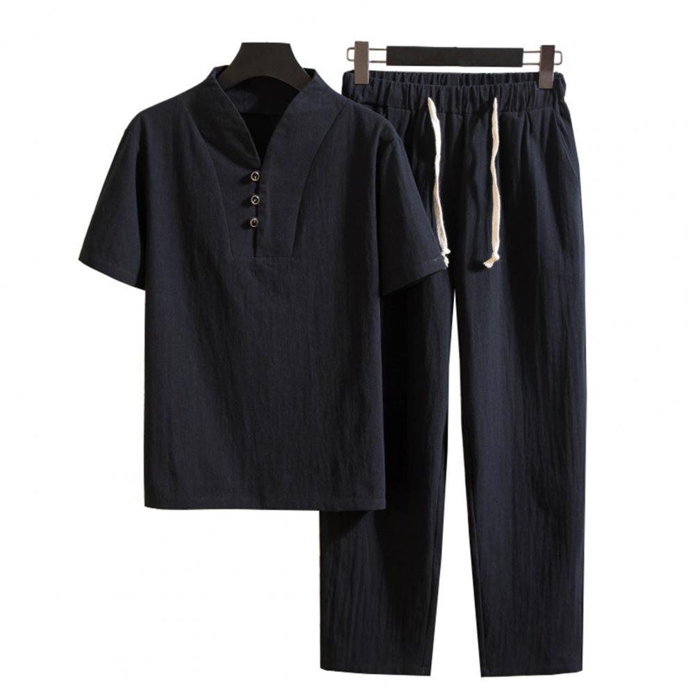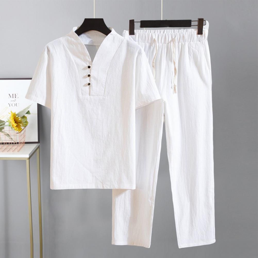 • New Arrival Men's Cotton and Linen Short Sleeve T-shirt+Ankle Length Pant Set Solid Shirt+Trousers Home Suits Male Size M-3XL