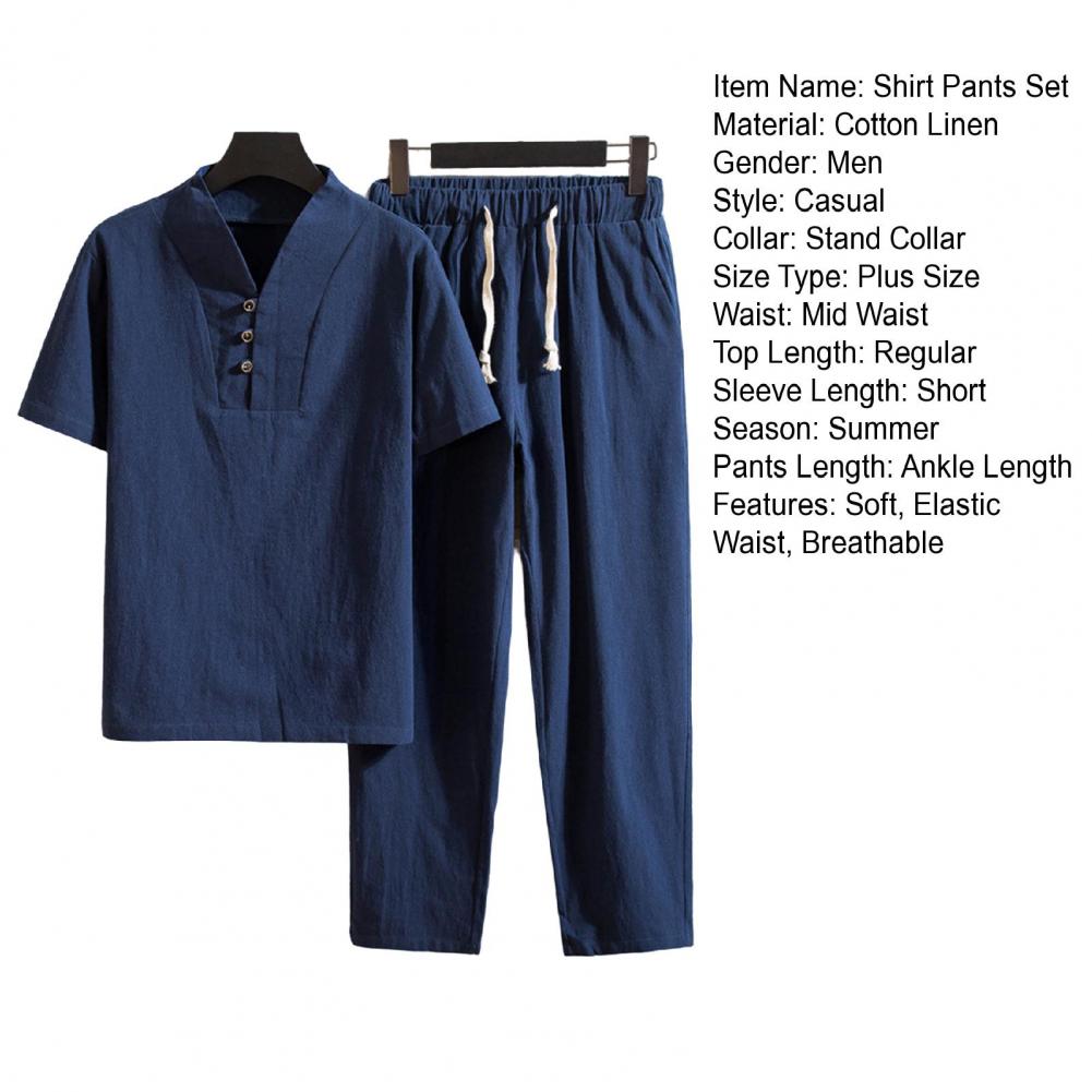 2 Pcs/Set Men Shirt Pants Set Stand Collar Solid Color Elastic Waist Drawstring Pockets Sports Buttons Wide Leg Plus Size Men Top Trousers Suit Men Clothes