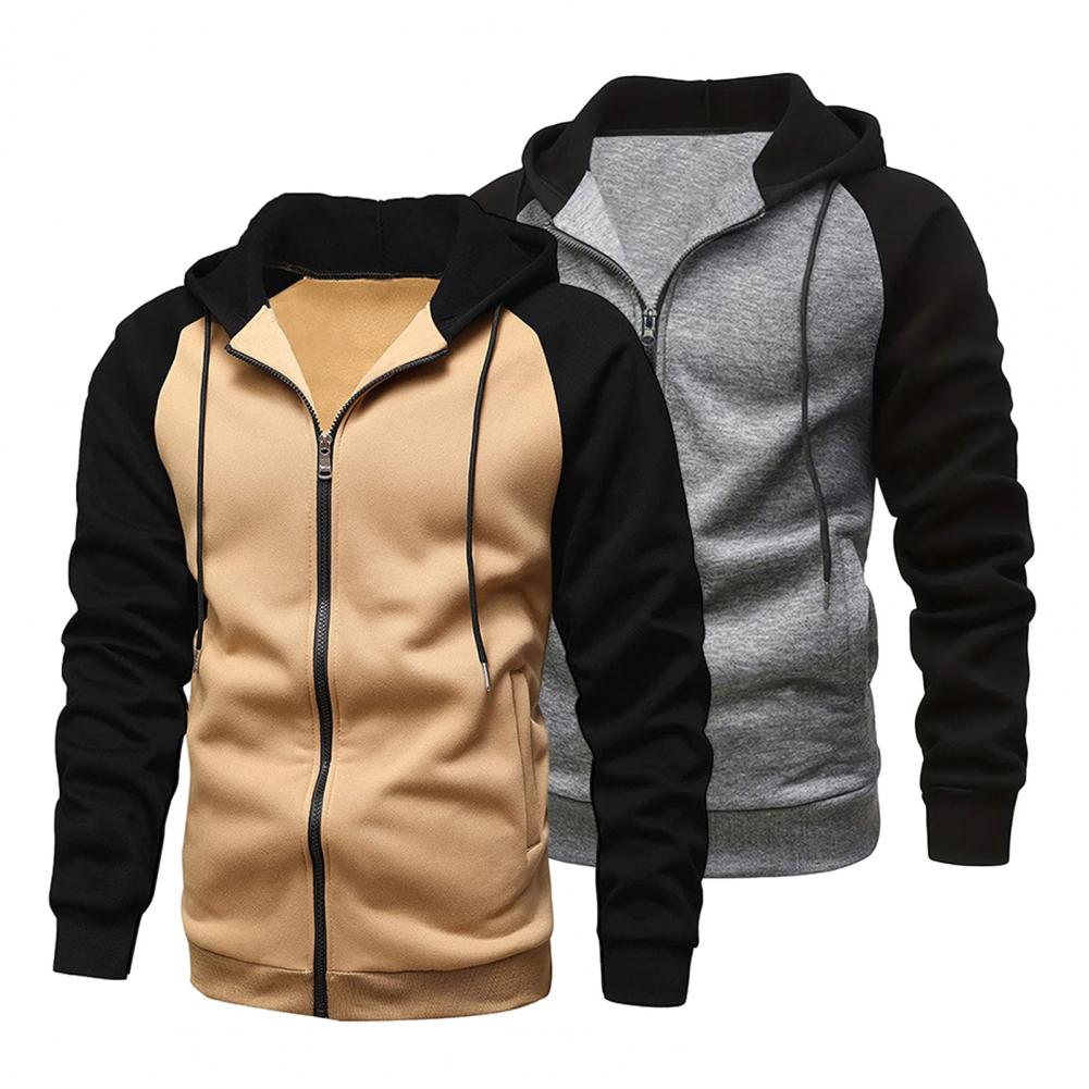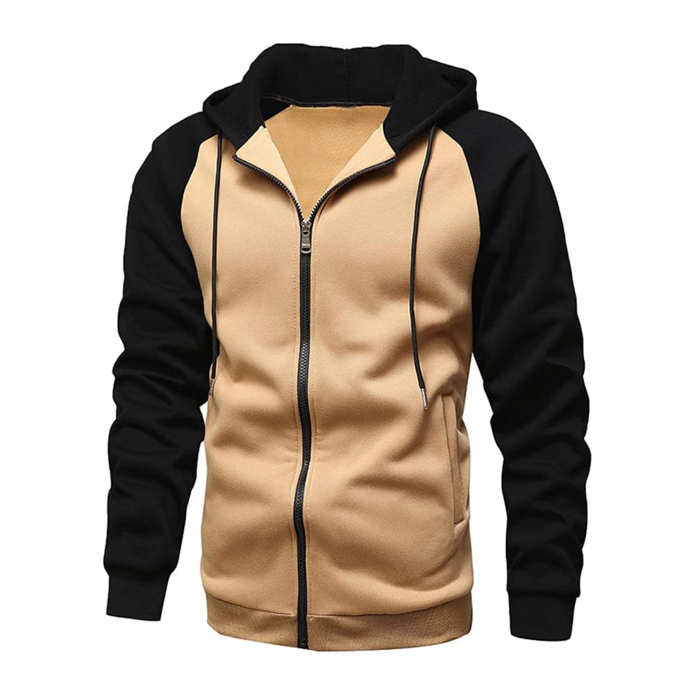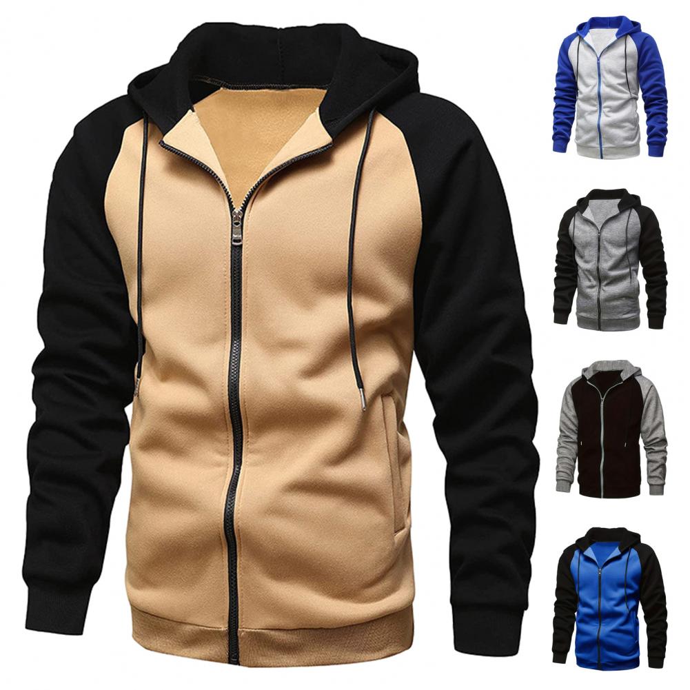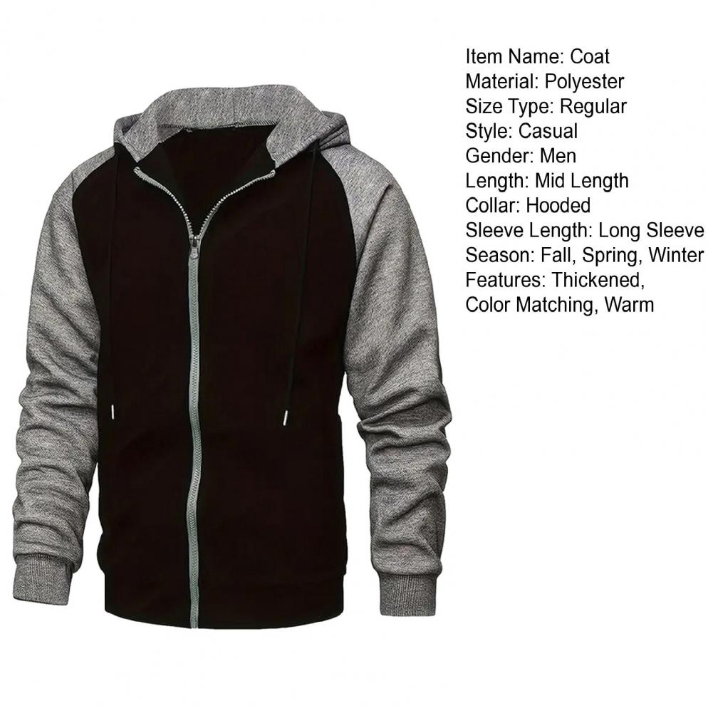 Fall Spring Men Coat Color Matching Drawstring Hooded Zipper Closure Cardigan Long Sleeve Soft Warm Thick Mid Length Men Jacket