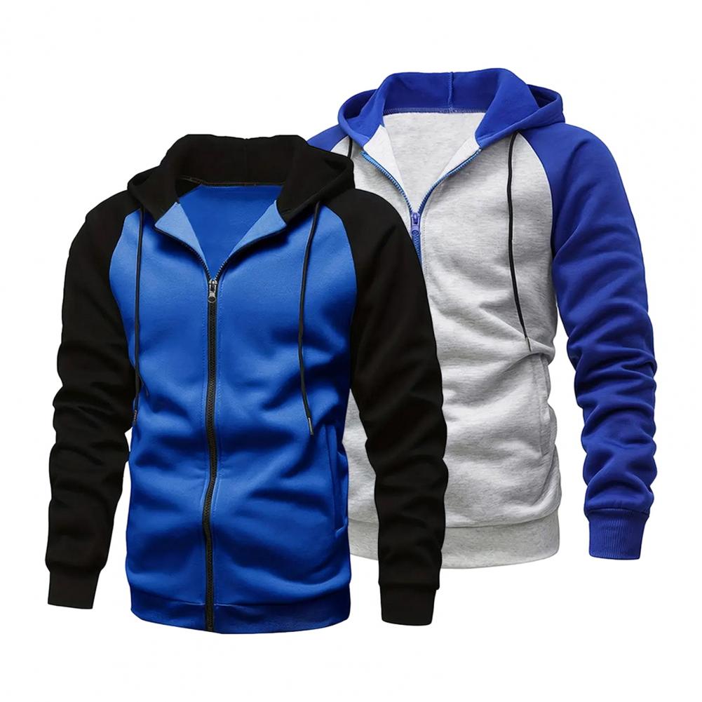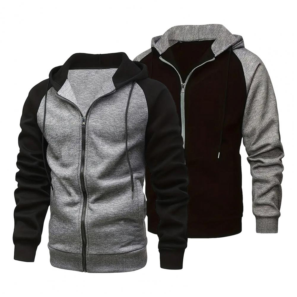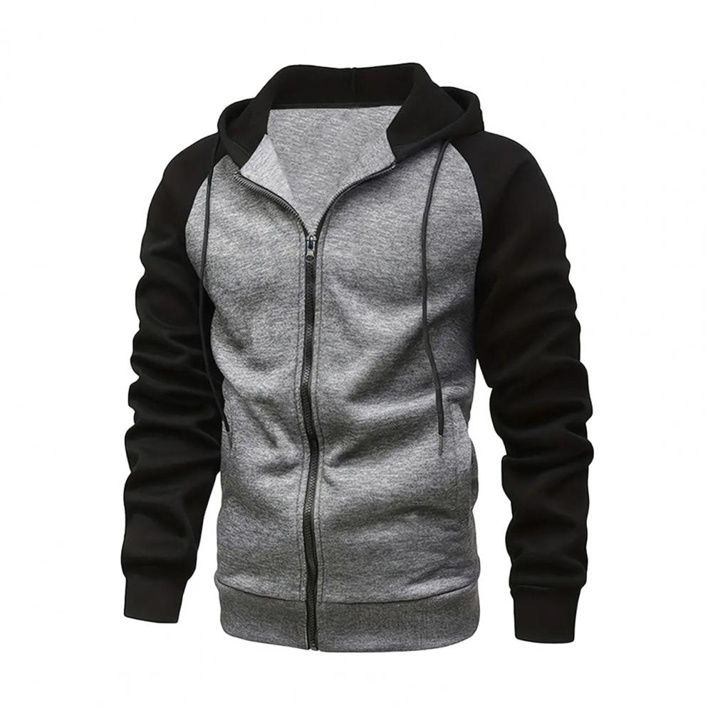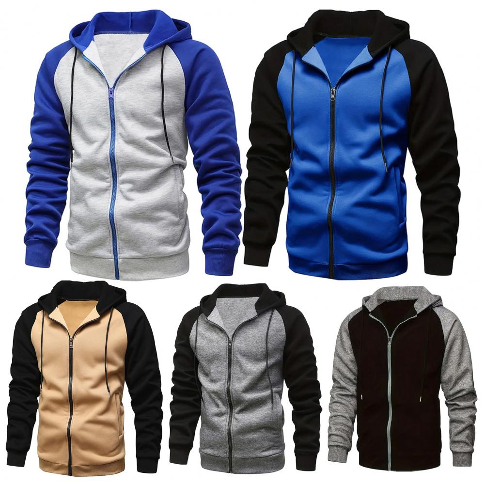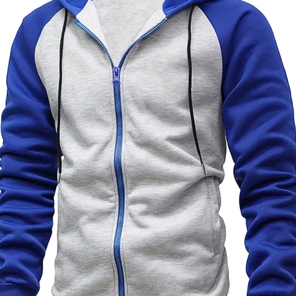 Trendy and fashionable men's hooded zipper sweatshirt with color blocking and long sleeves.