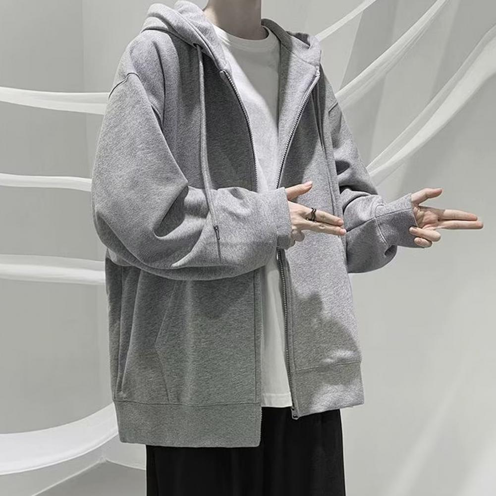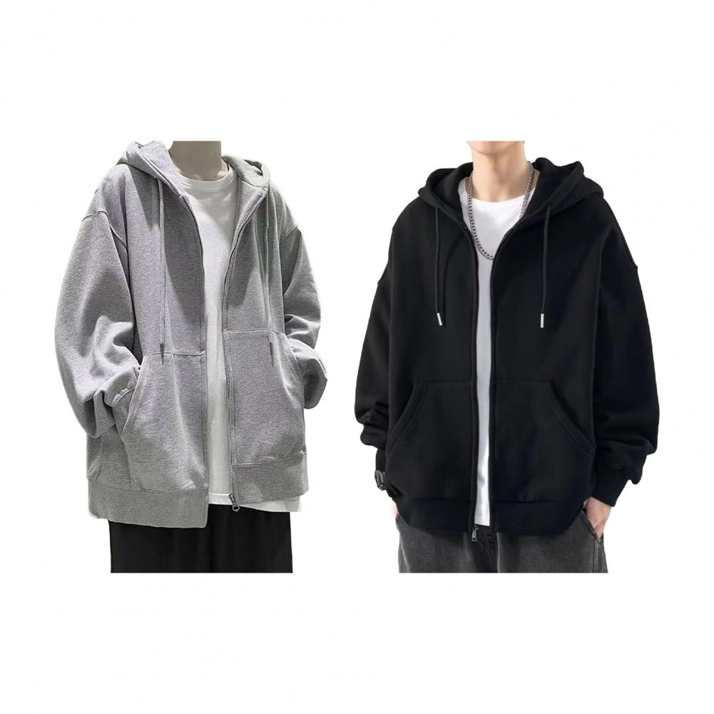 Men Fall Winter Hoodie Drawstring Loose Zip-up Long Sleeves Pockets Hooded Plus Size Cardigan Thin Pure Color Daily Wear Casual Coat