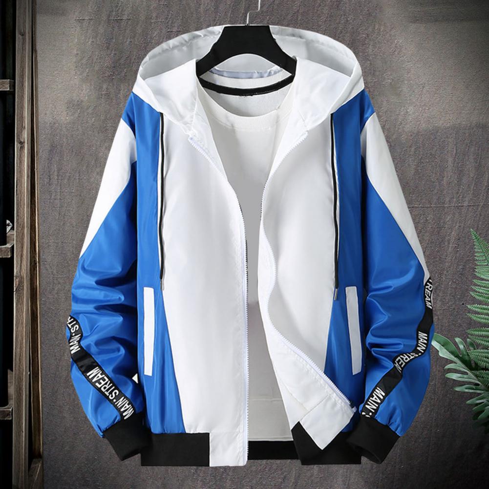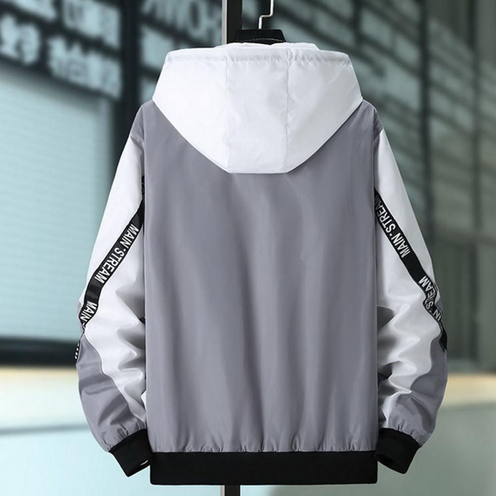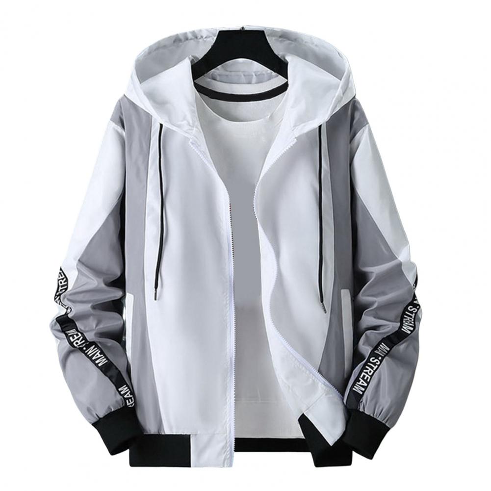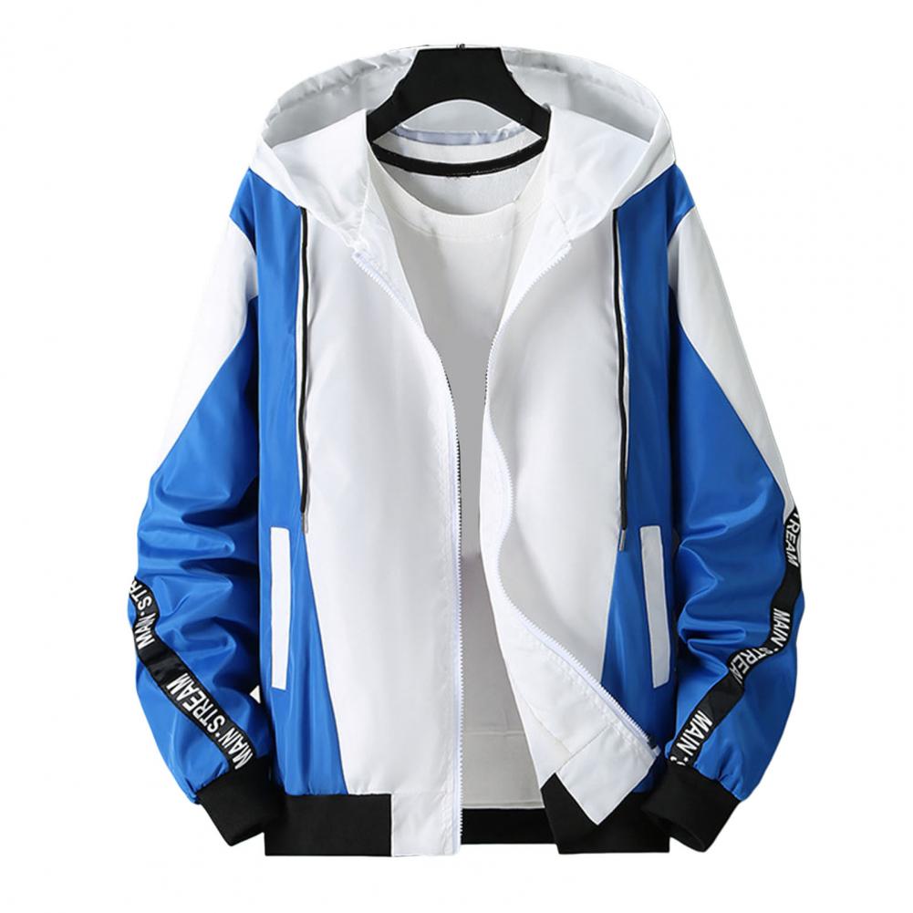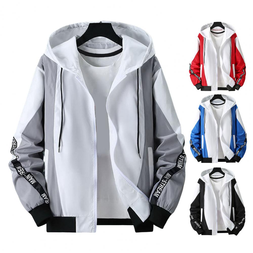 Men Jacket Coat Hooded Drawstring Long Sleeve Baseball Coat Color Block Thin Zipper Placket Outwear Tops