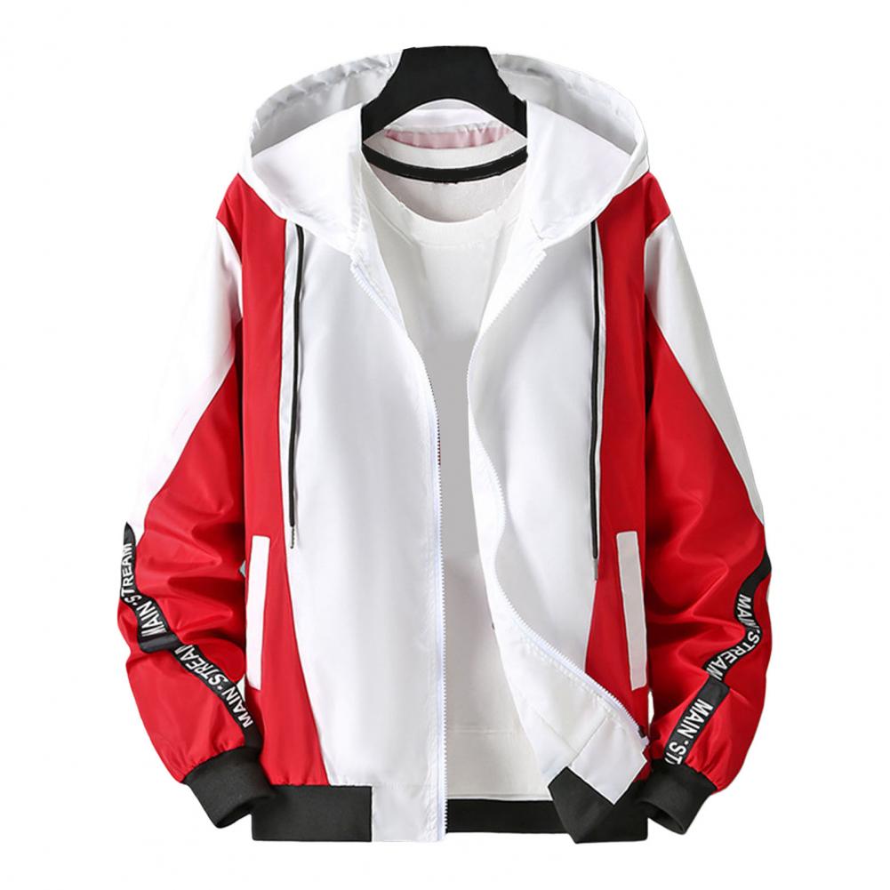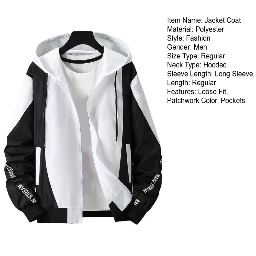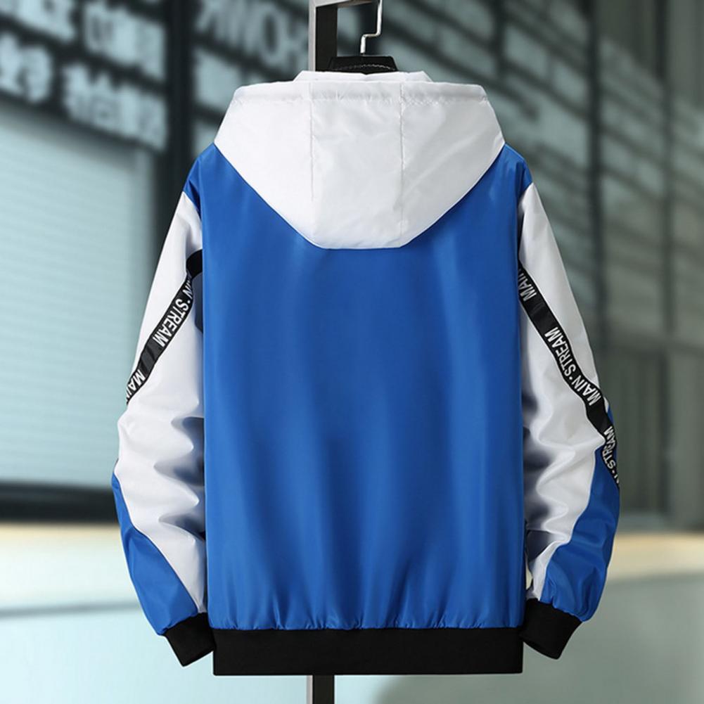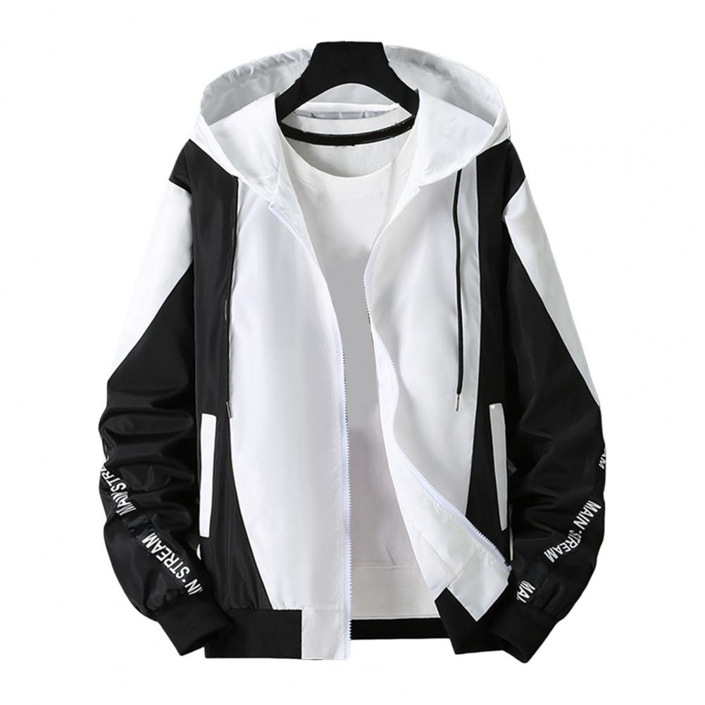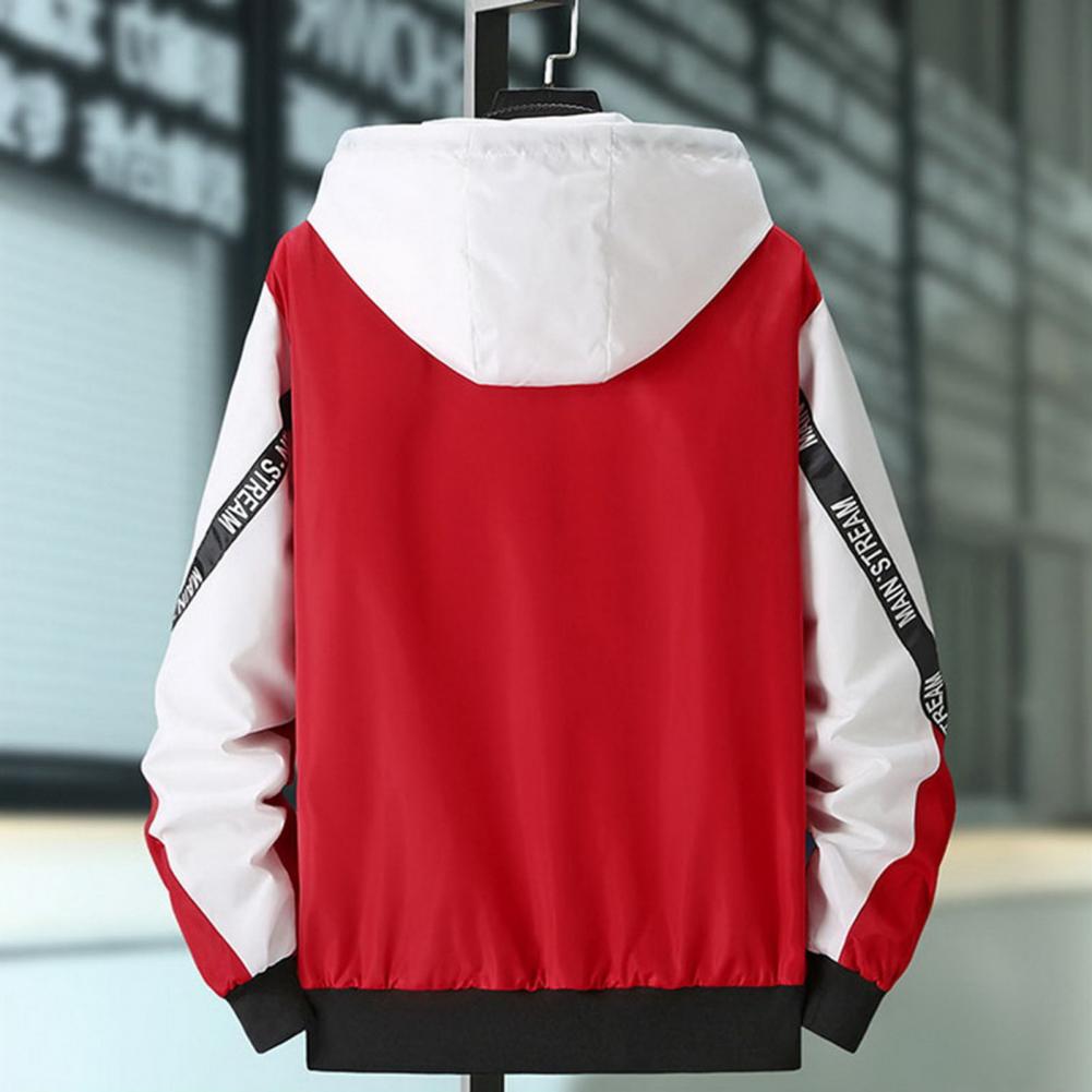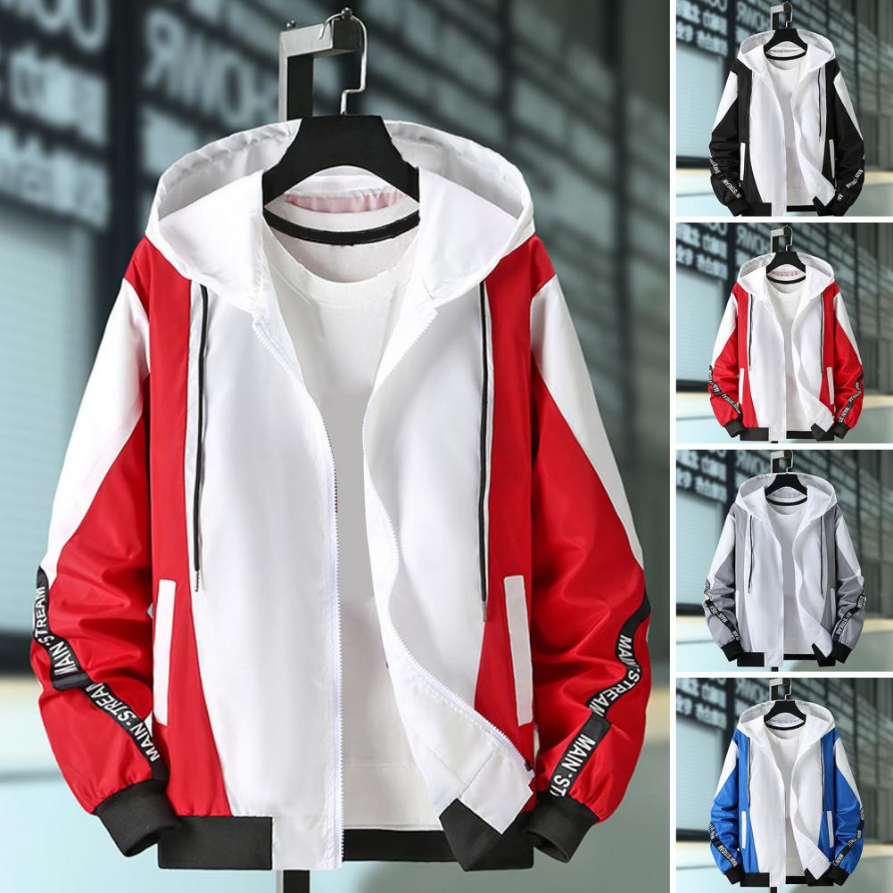 Men Jacket Coat Hooded Drawstring Long Sleeve Baseball Coat Color Block Thin Zipper Placket Outwear Tops