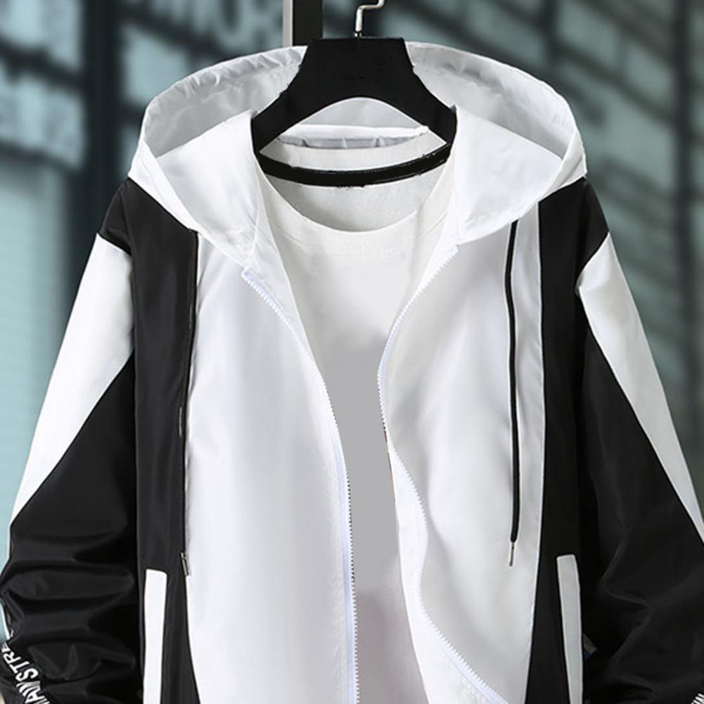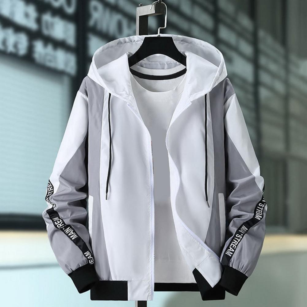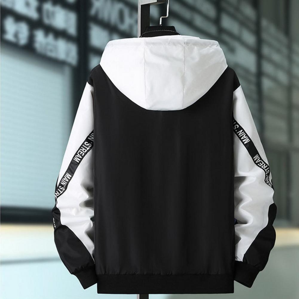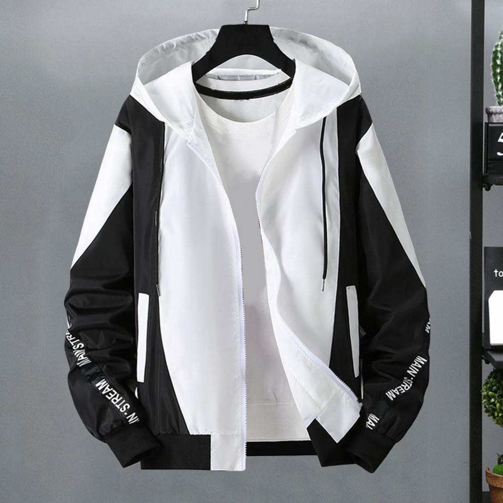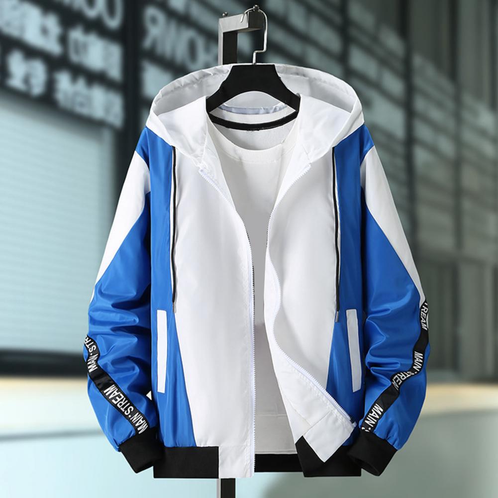 Men Jacket Coat Hooded Drawstring Long Sleeve Baseball Coat Color Block Thin Zipper Placket Outwear Tops