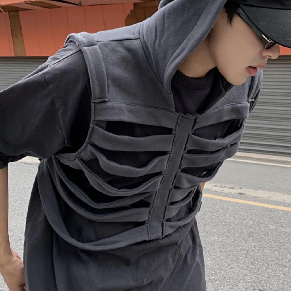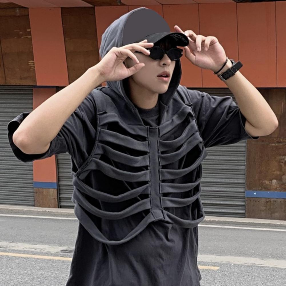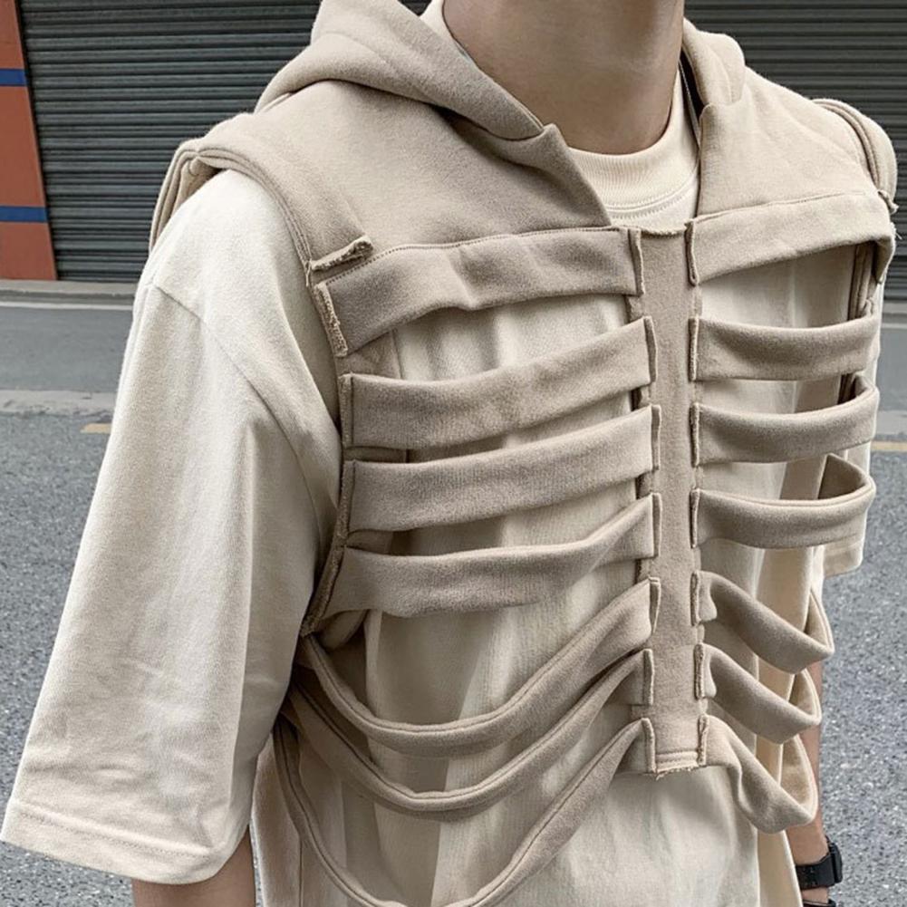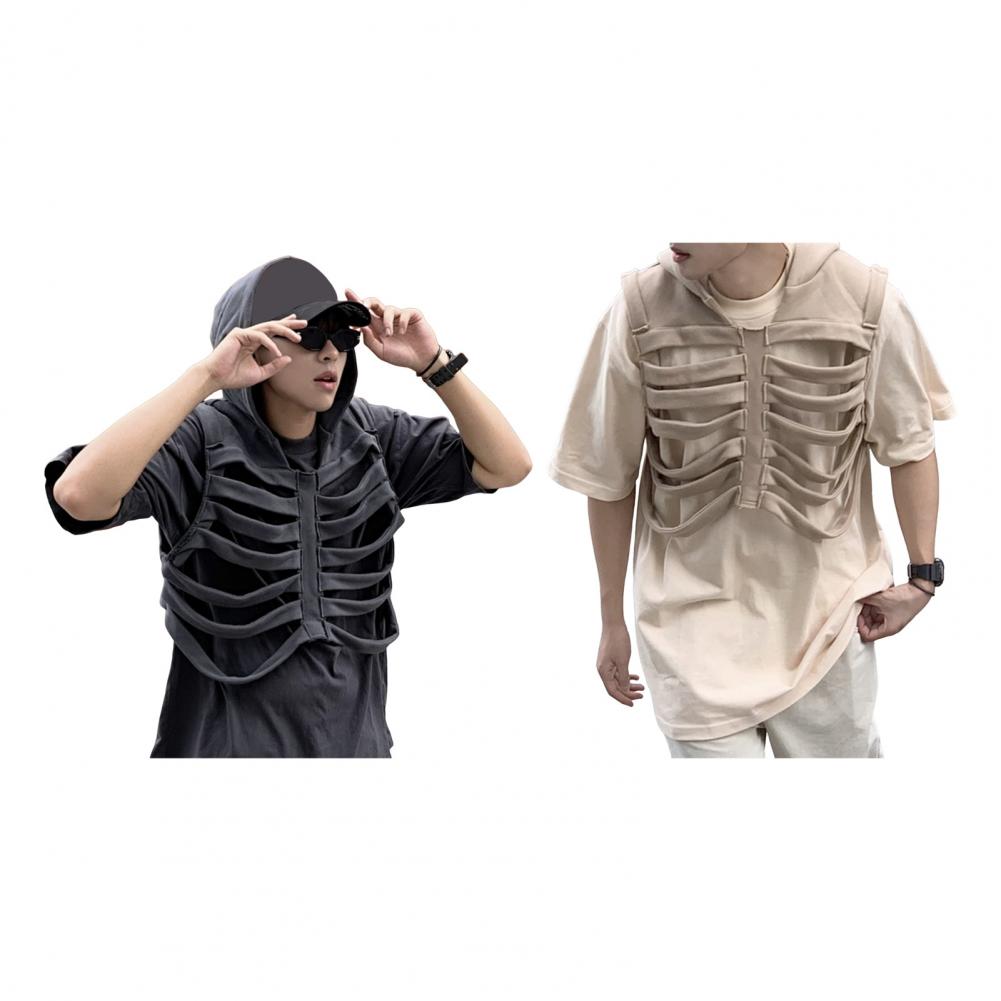 Stand out in style with this American hip-hop skull rib vest, a trendy and personalized addition to your wardrobe. Made from a soft and durable blend of polyester fiber and cotton, this hooded vest features an integrated skull rib design for a unique touch.