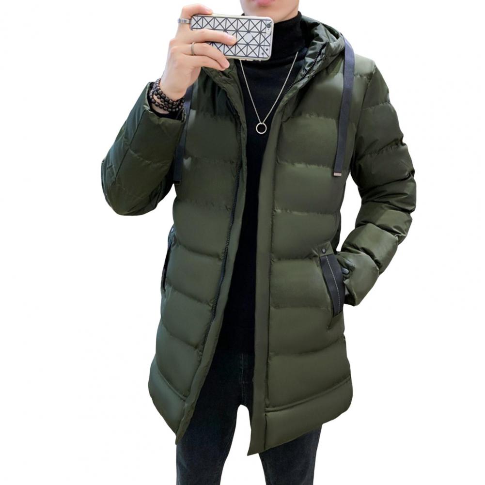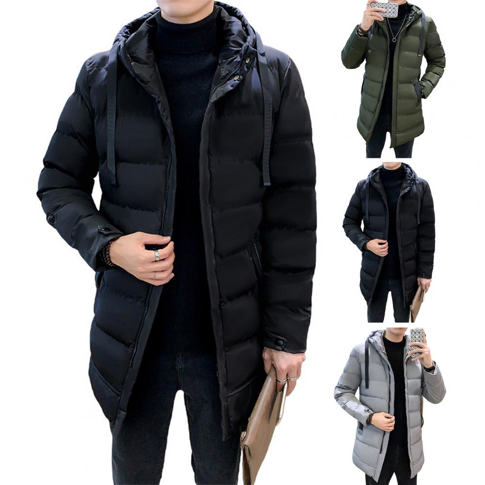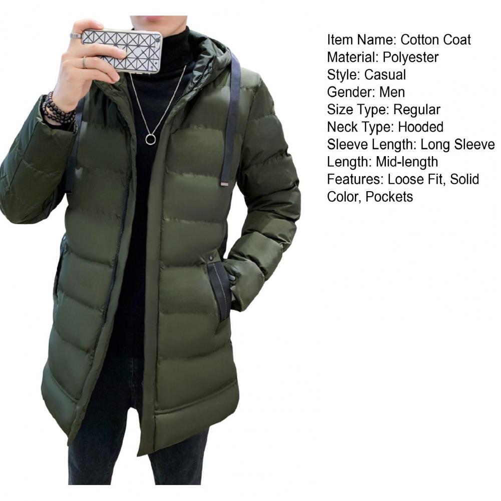 Men Cotton Coat Hooded Long Sleeve Full Zipper Closure Solid Color Jacket with Pockets Mid-length Thickened Quilted Outwear