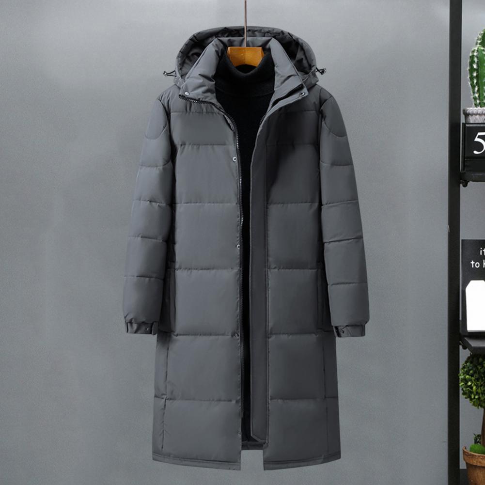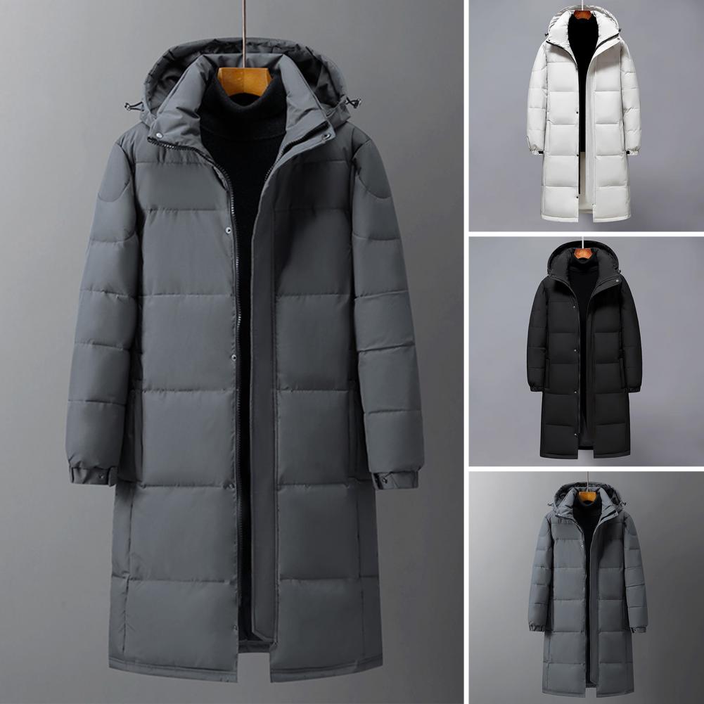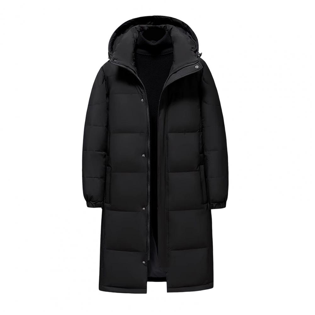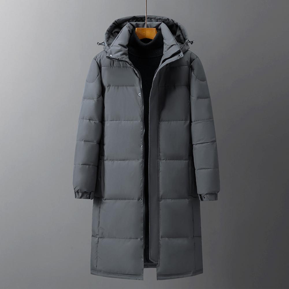 Design: Featuring adjustable sleeves and a detachable hood, this solid-colored down jacket offers versatility and comfort. The extended style provides extra coverage while the soft, skin-friendly fabric maintains its shape wear after wear.