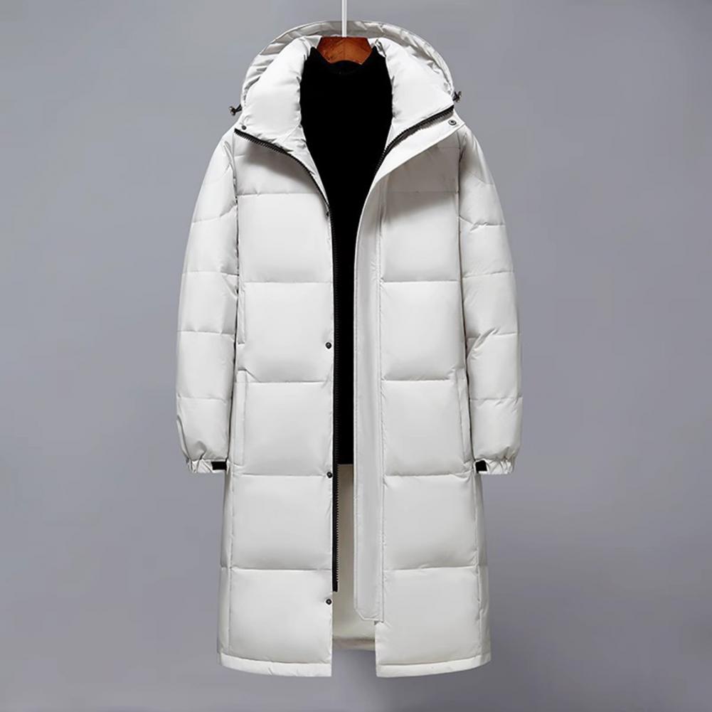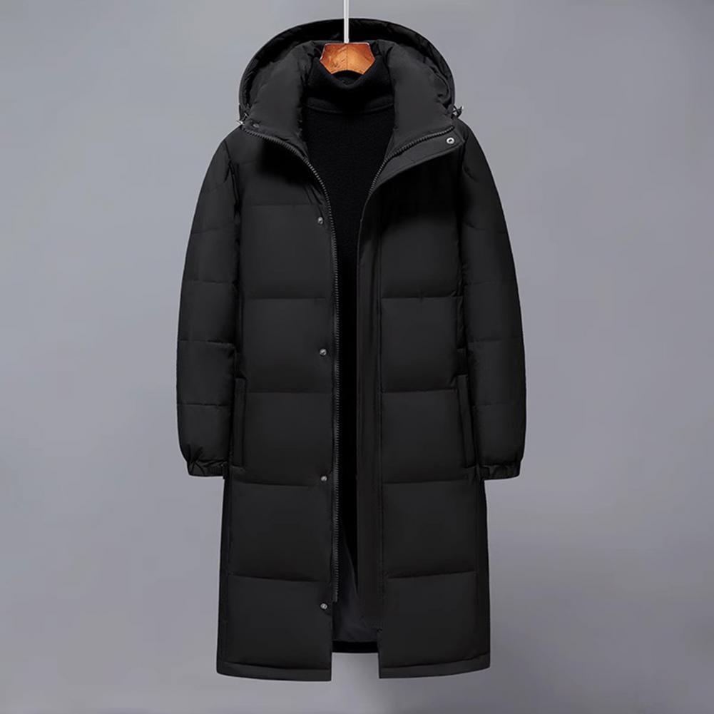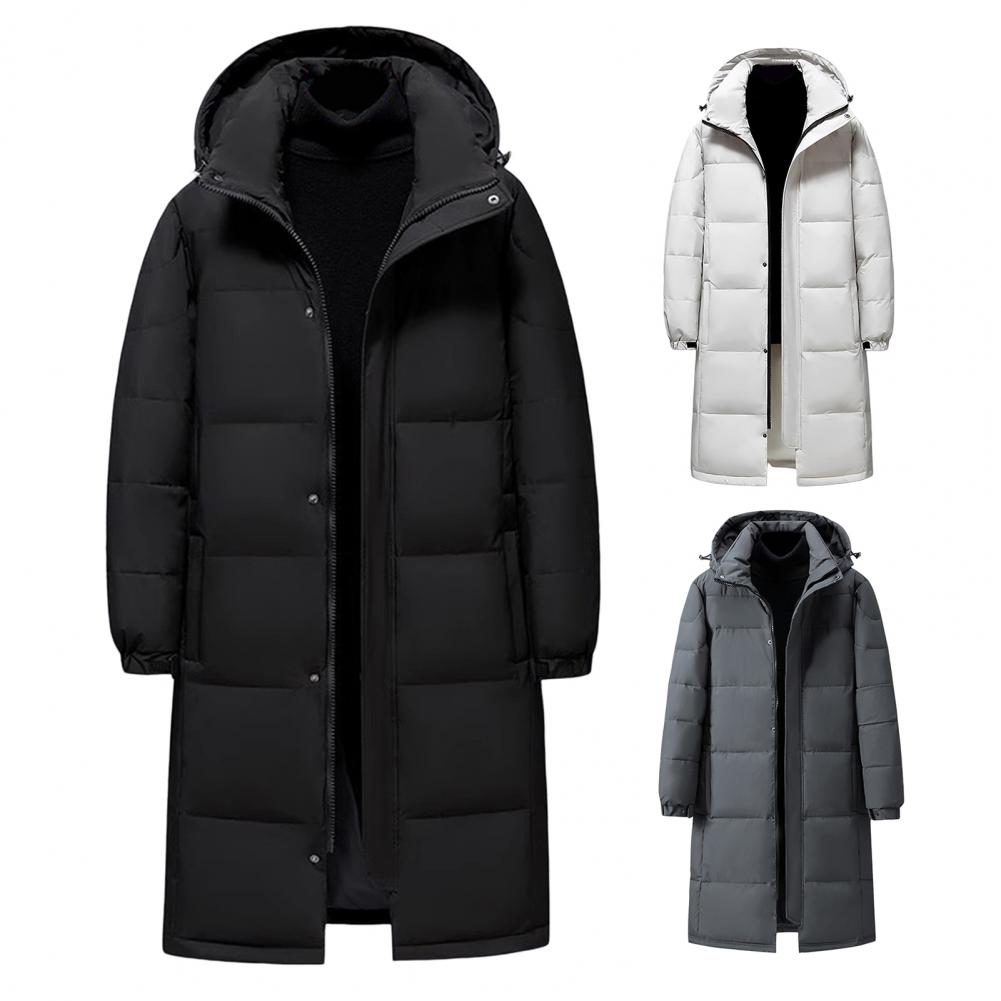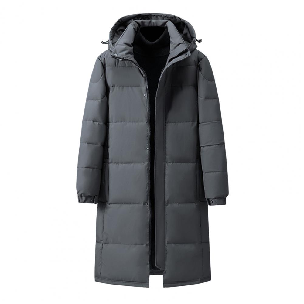 Design: Featuring adjustable sleeves and a detachable hood, this solid-colored down jacket offers versatility and comfort. The extended style provides extra coverage while the soft, skin-friendly fabric maintains its shape wear after wear.