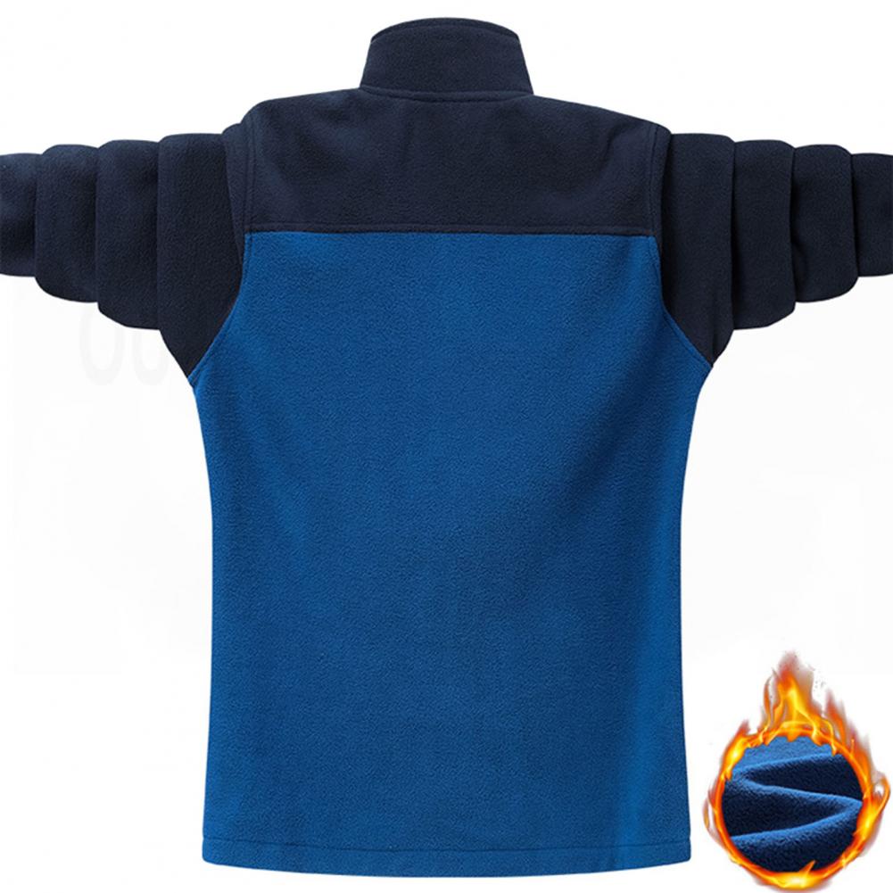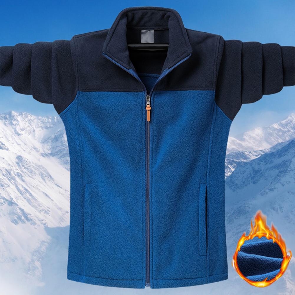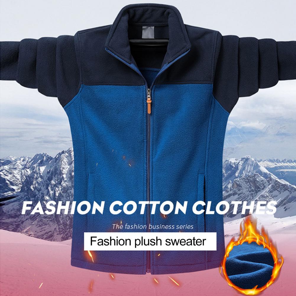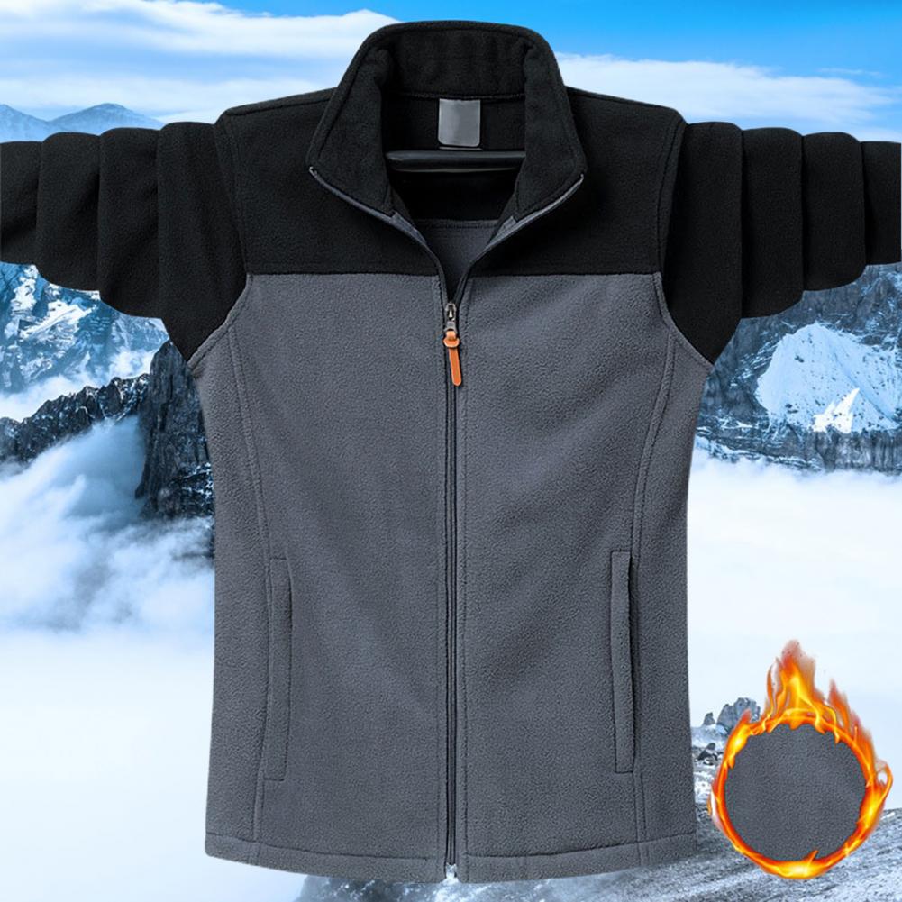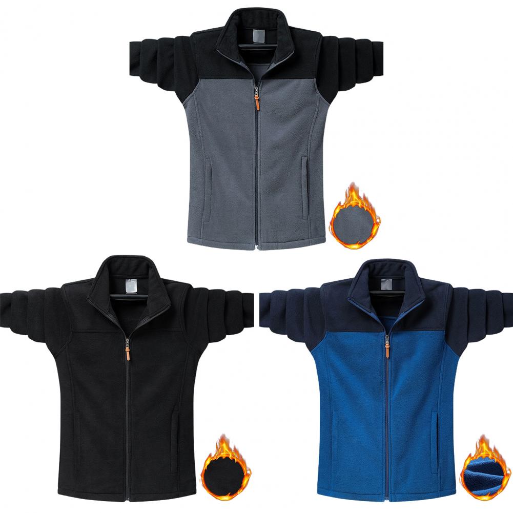 Men Fall Winter Coat Stand Collar Neck Protection Color Block Zipper Closure Long Sleeve Pockets Thick Warm Soft Loose Casual Coat