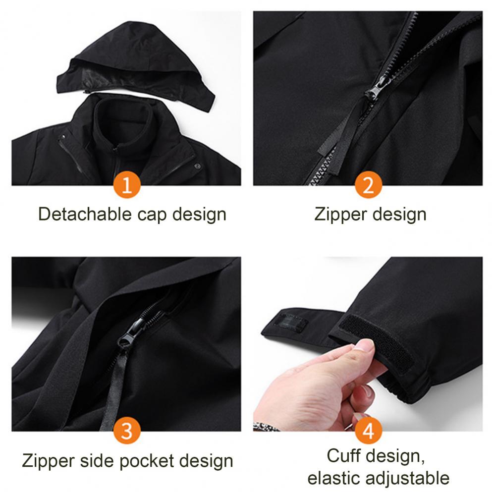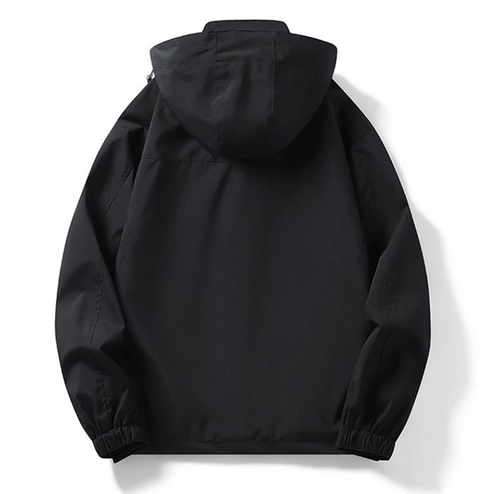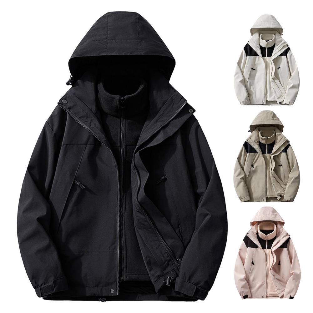 This jacket includes a hooded outer layer and a stand-up collar inner layer, perfect for a casual and simple style.