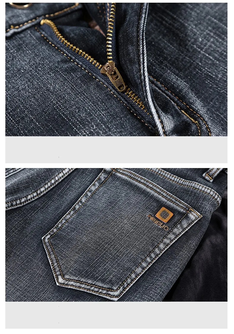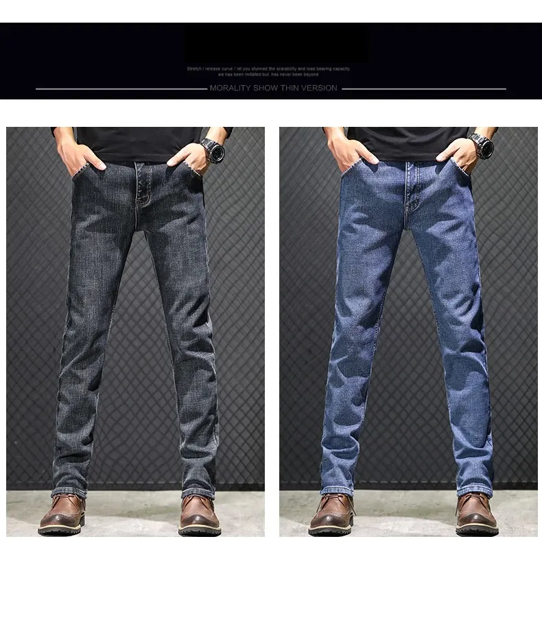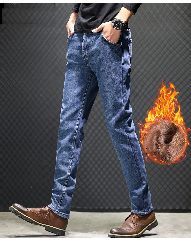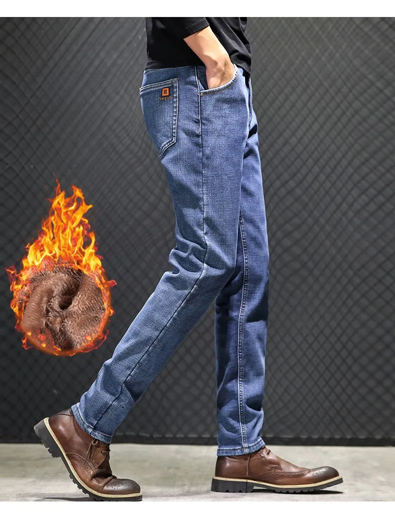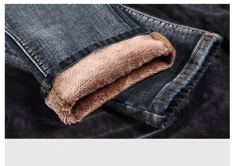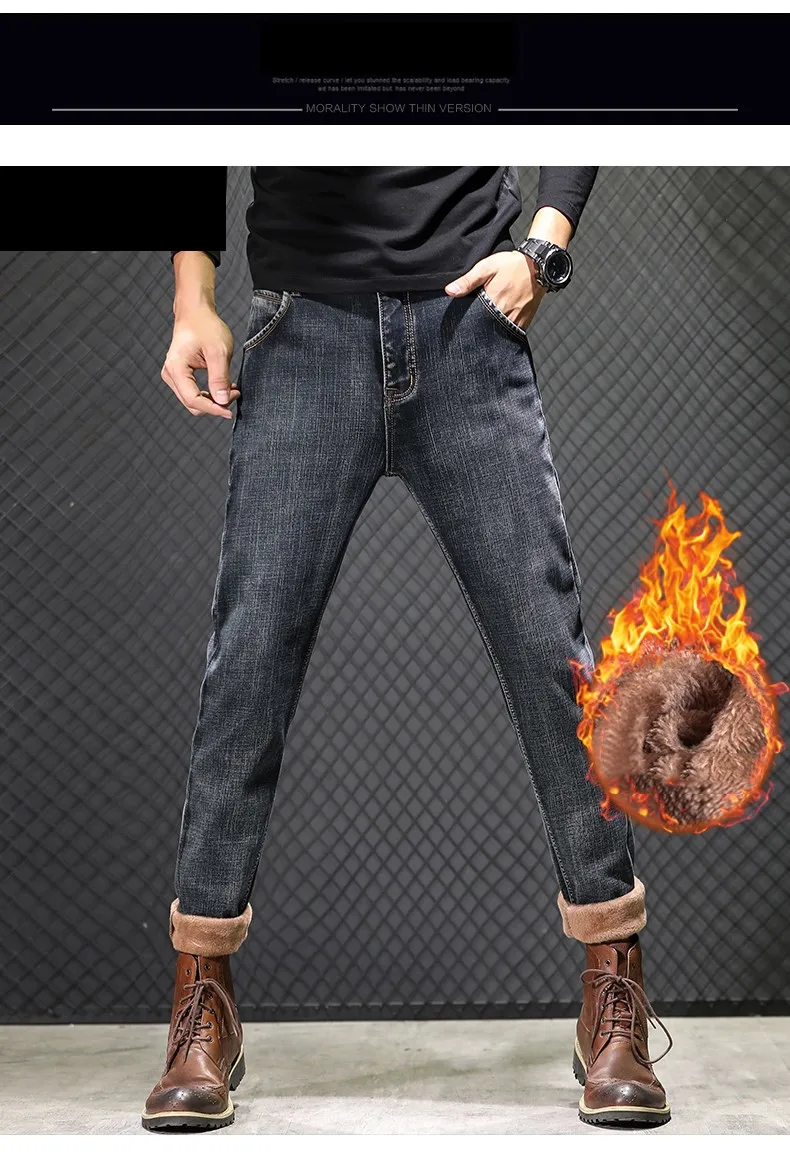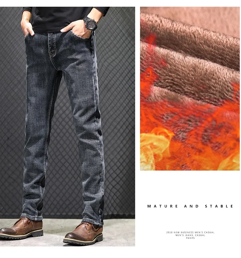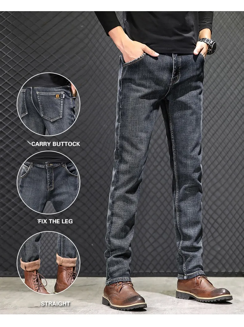 • 2024 New Men's Warm Fleece Jeans Classic Style High Quality Cotton Slim Fit Denim Stretch Trousers Dark Grey Brand Pants