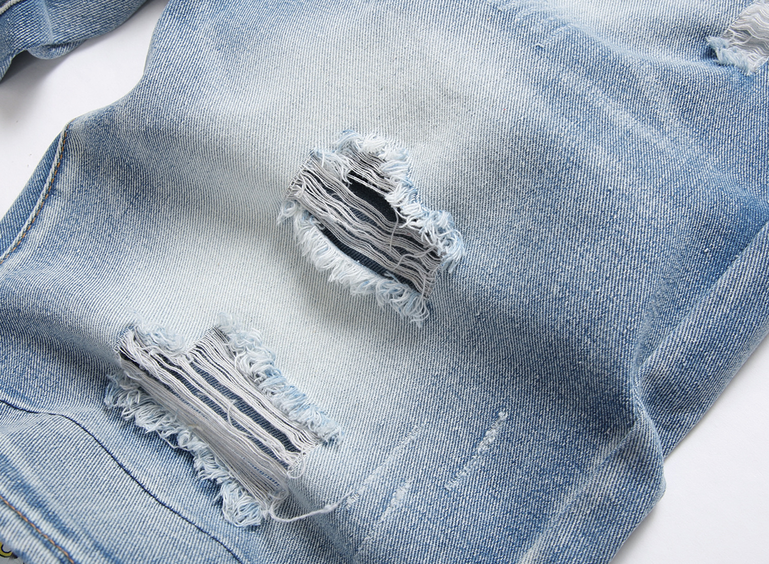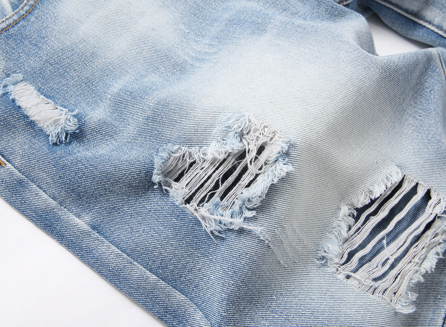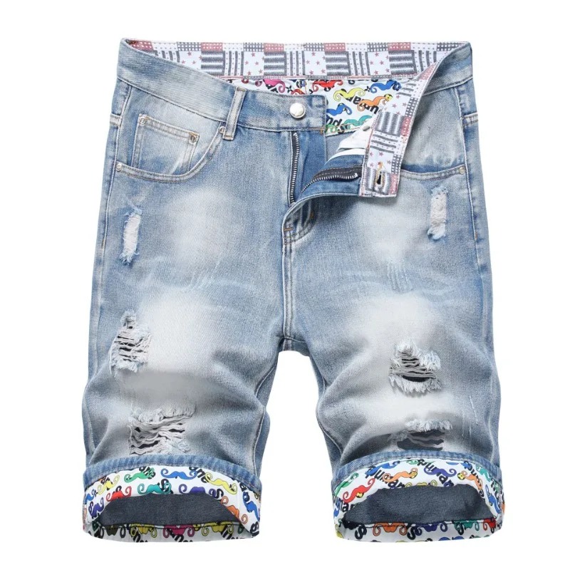 • Men Light Blue Denim Shorts New Summer Male Holes Short Jeans Man Fashion Ripped Jeans Shorts Straight Fit Denim Shorts Size 42