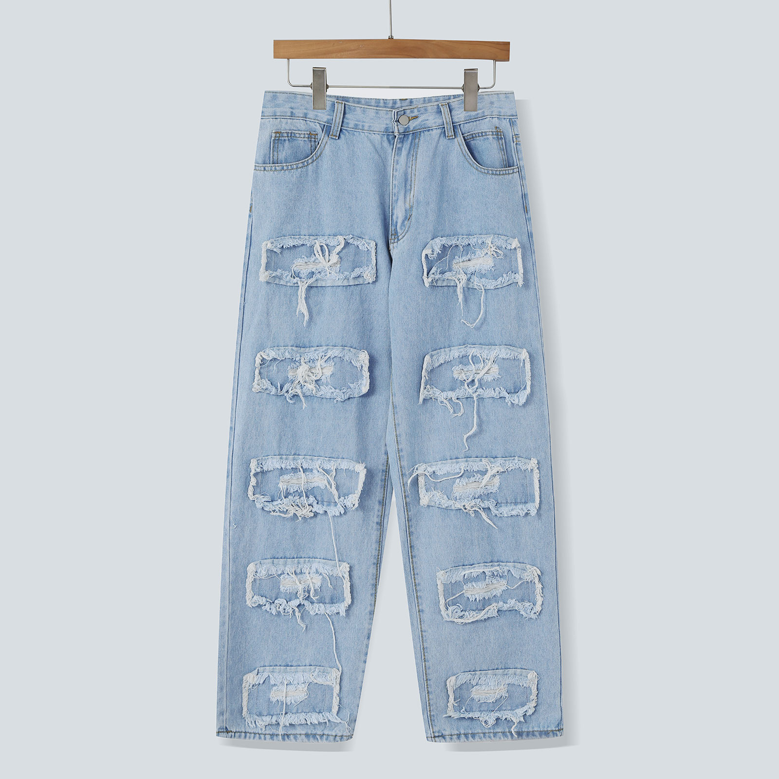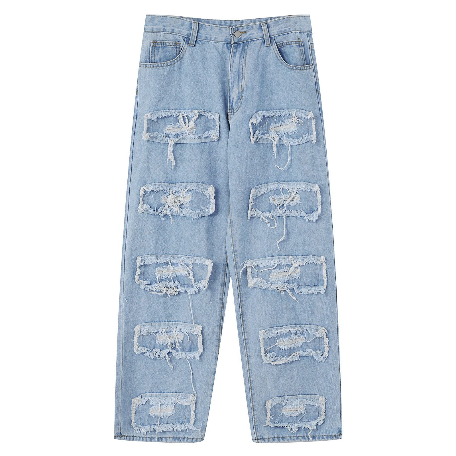 Men's Fashion Denim Cotton Hole Straight Pocket Trouser Distressed Jeans Pants