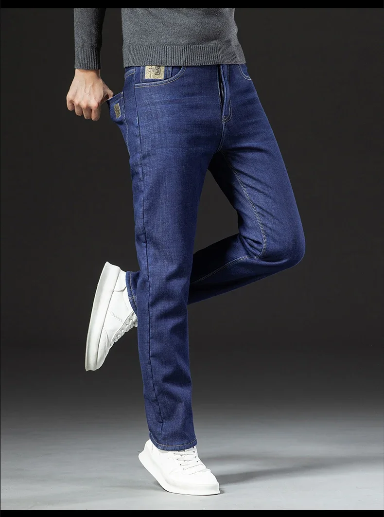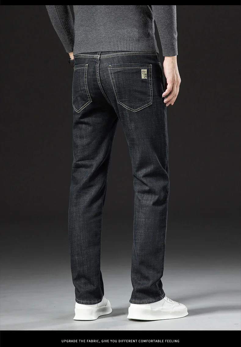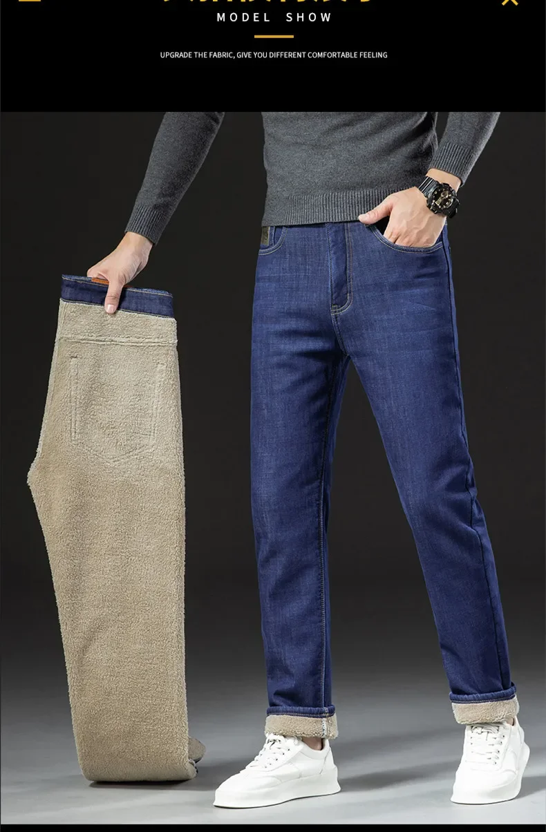 New Classic Men's Business Casual Velvet Jeans Winter Chinese Embroidery Straight Loose Warm Thick Pants