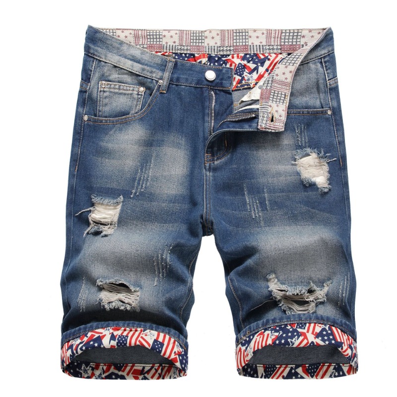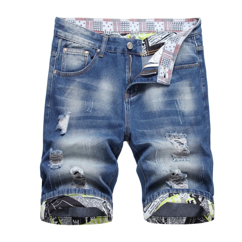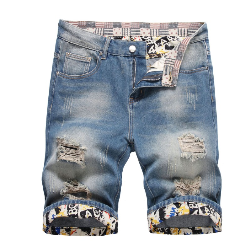 New Summer Men Light Blue Denim Shorts Holes Short Jeans Male Fashion Ripped Jeans Shorts Straight Fit Denim Shorts Size 42