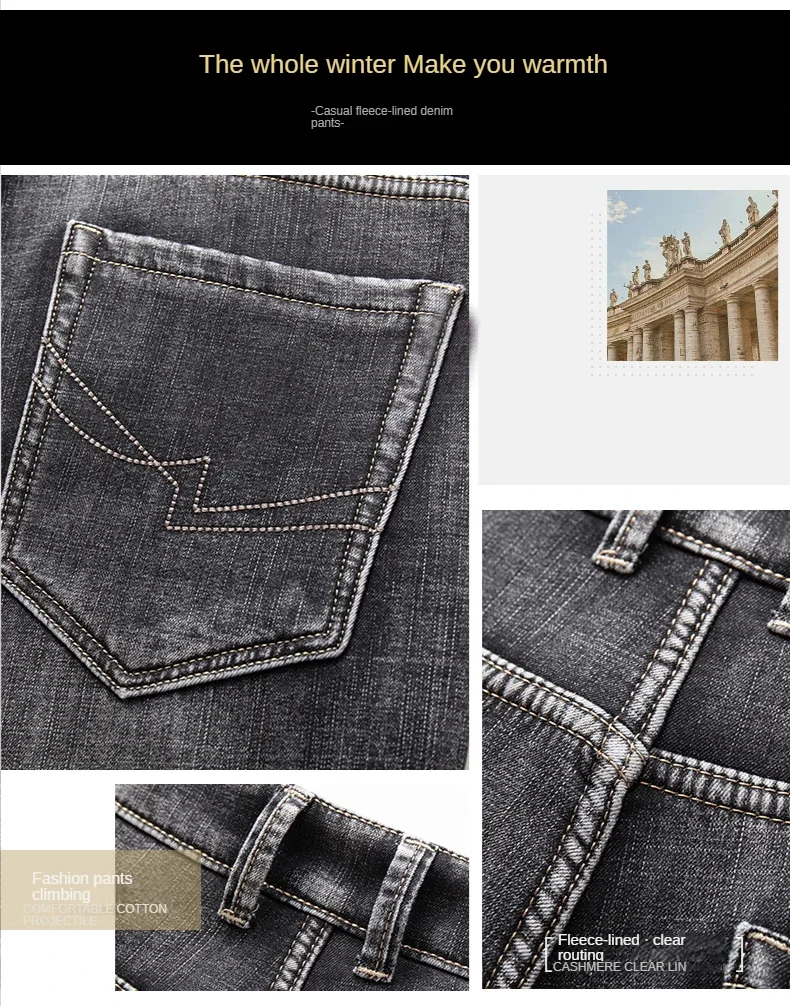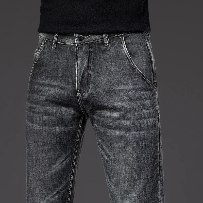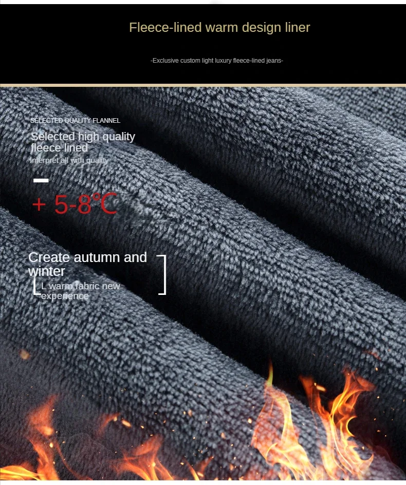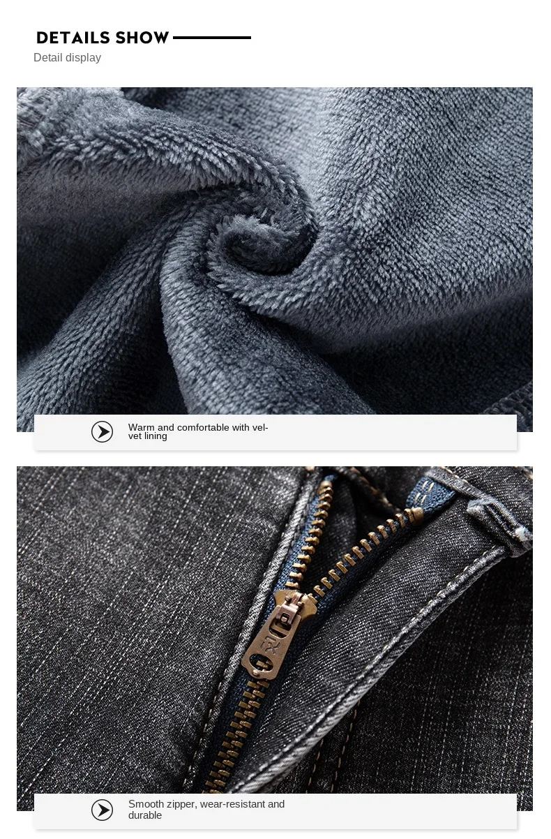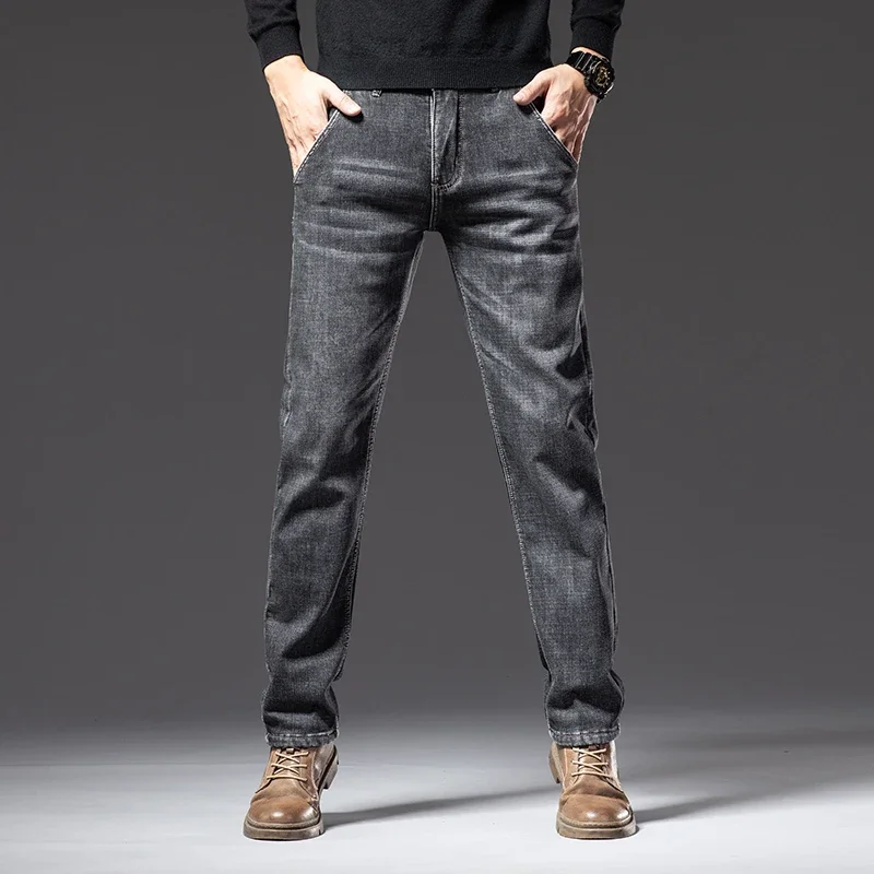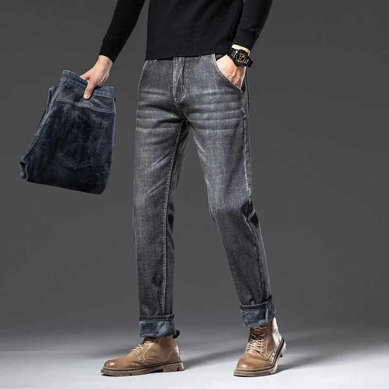 • Winter Brand Fleece Thick Warm Fit Straight Stretch Jeans Classic Fashion Casual Youth Men's Slim Jeans Black Gray Blue 2024