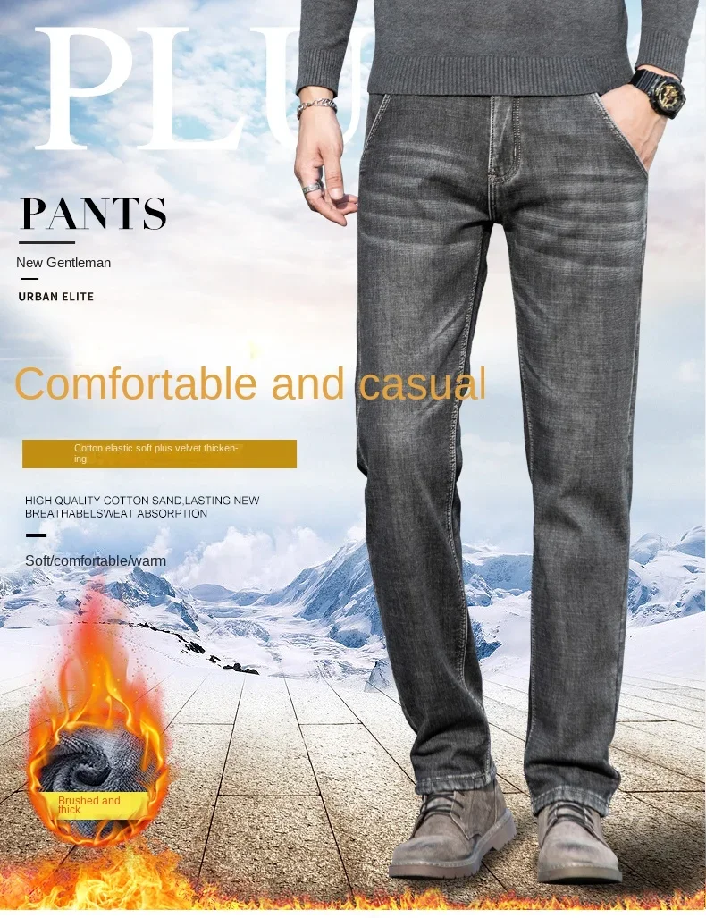 Winter Brand Fleece Thick Warm Fit Straight Stretch Jeans Classic Fashion Casual Youth Men's Slim Jeans Black Gray Blue 2024