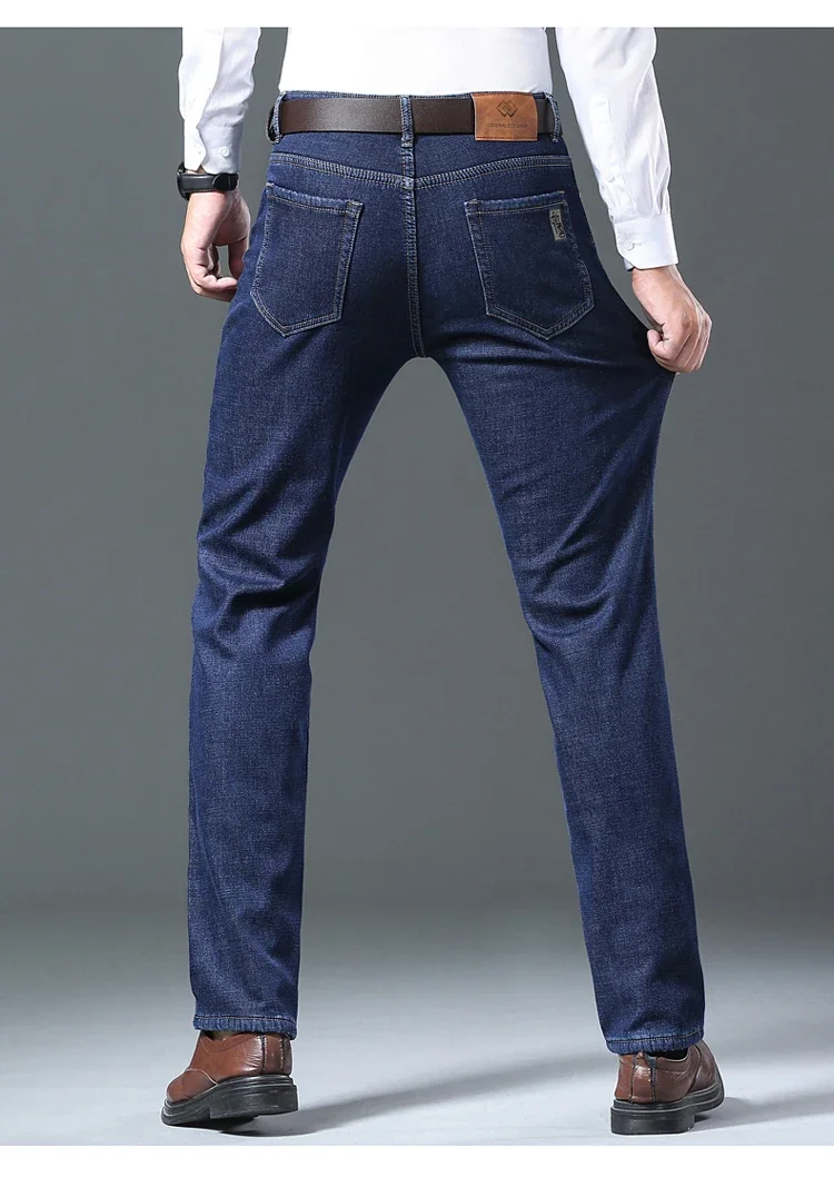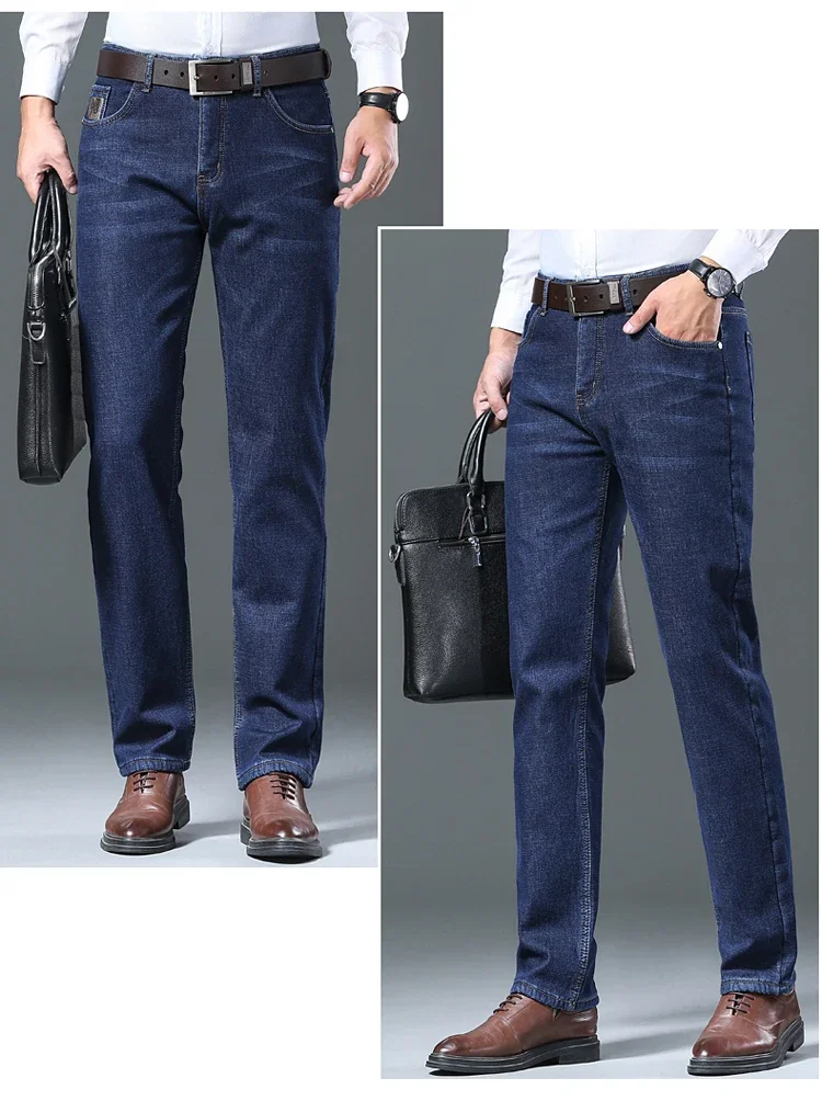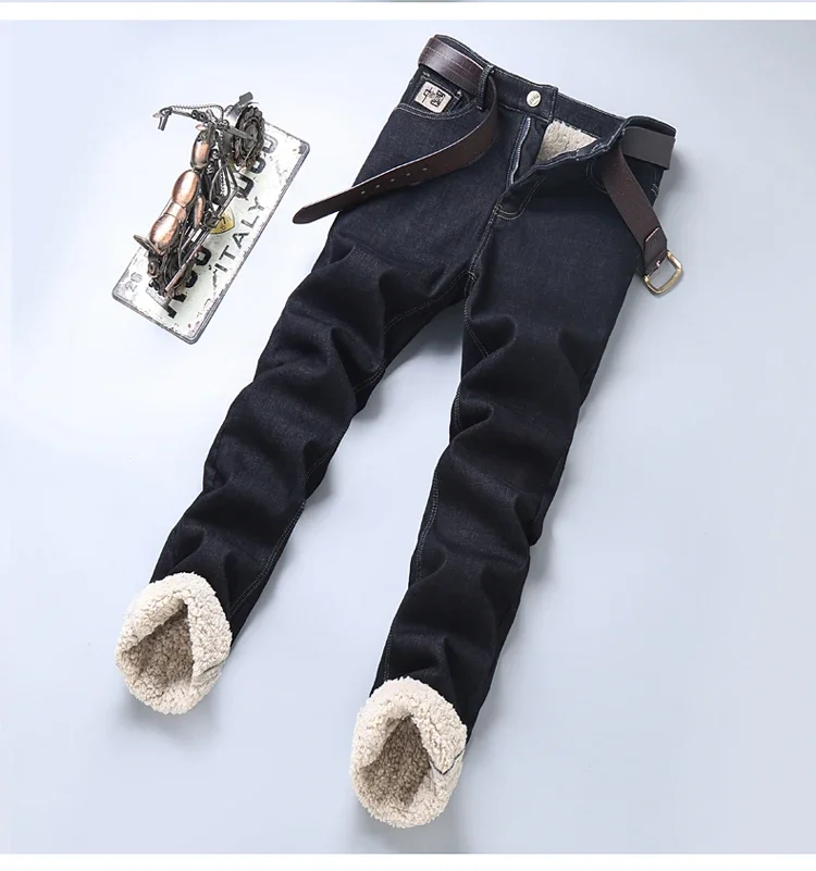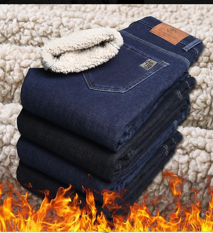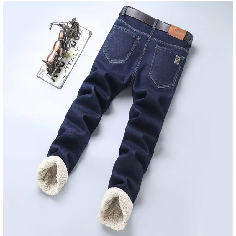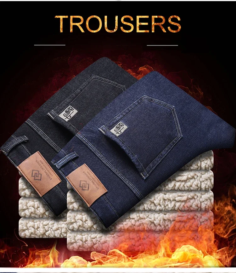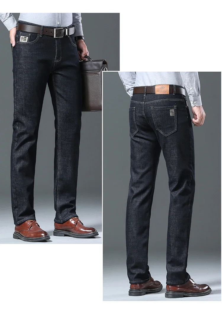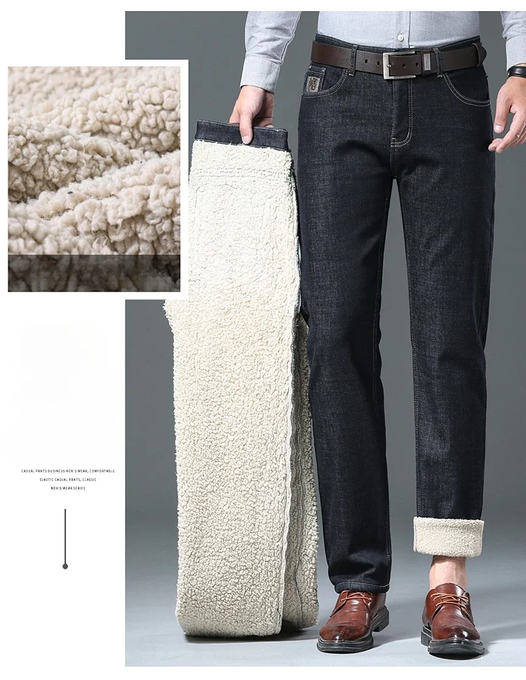 • Winter Wool Velvet Men's Jeans Fleece Thickened Straight Mid-waist Business Casual Comfortable Thermal Straight Denim Trousers