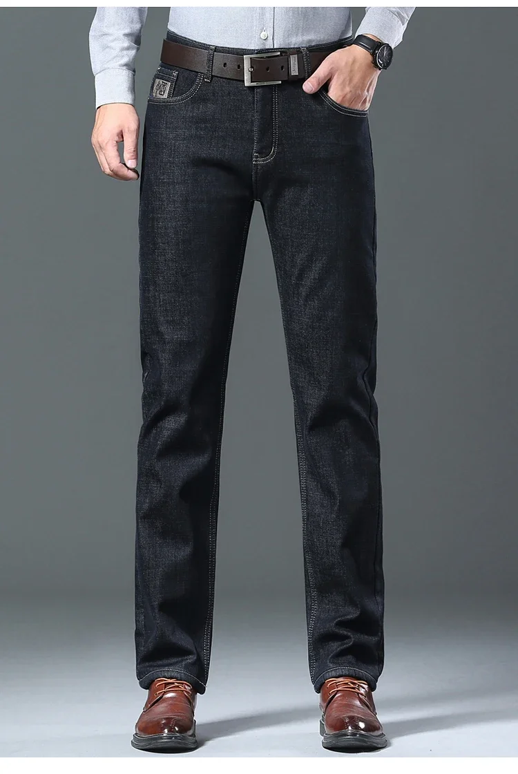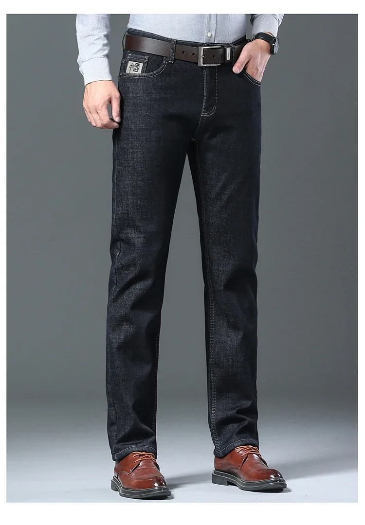 Winter Wool Velvet Men's Jeans Fleece Thickened Straight Mid-waist Business Casual Comfortable Thermal Straight Denim Trousers