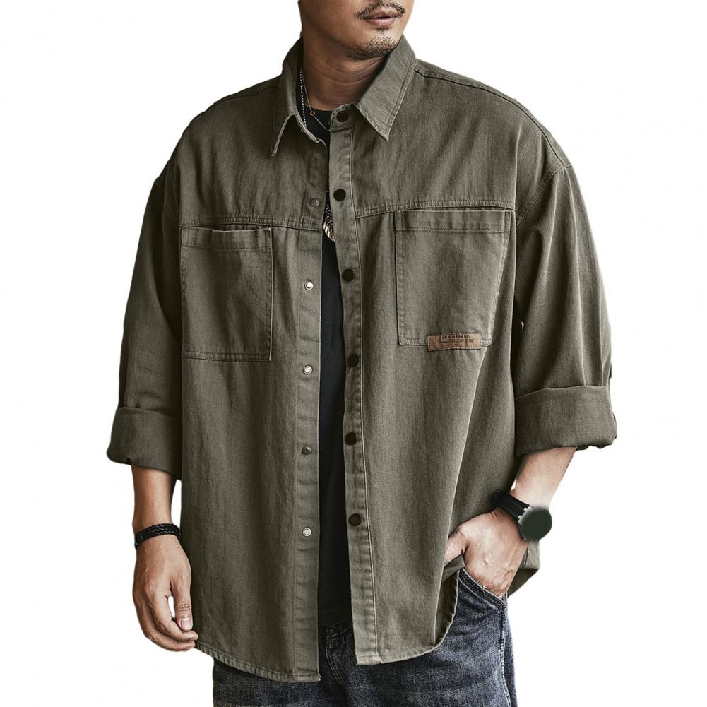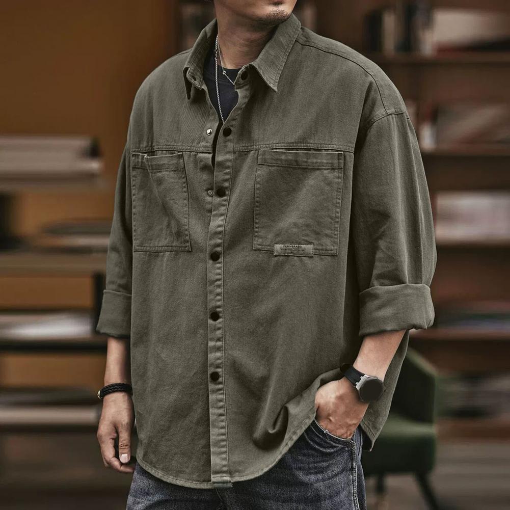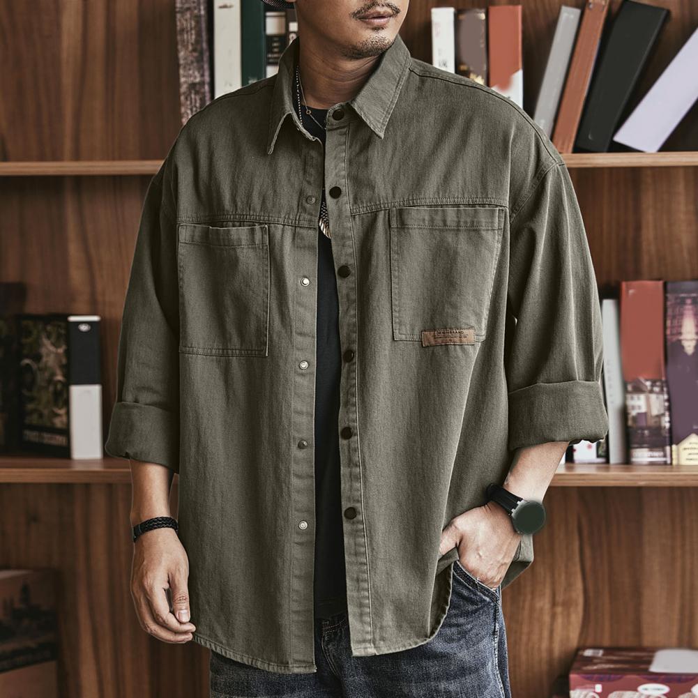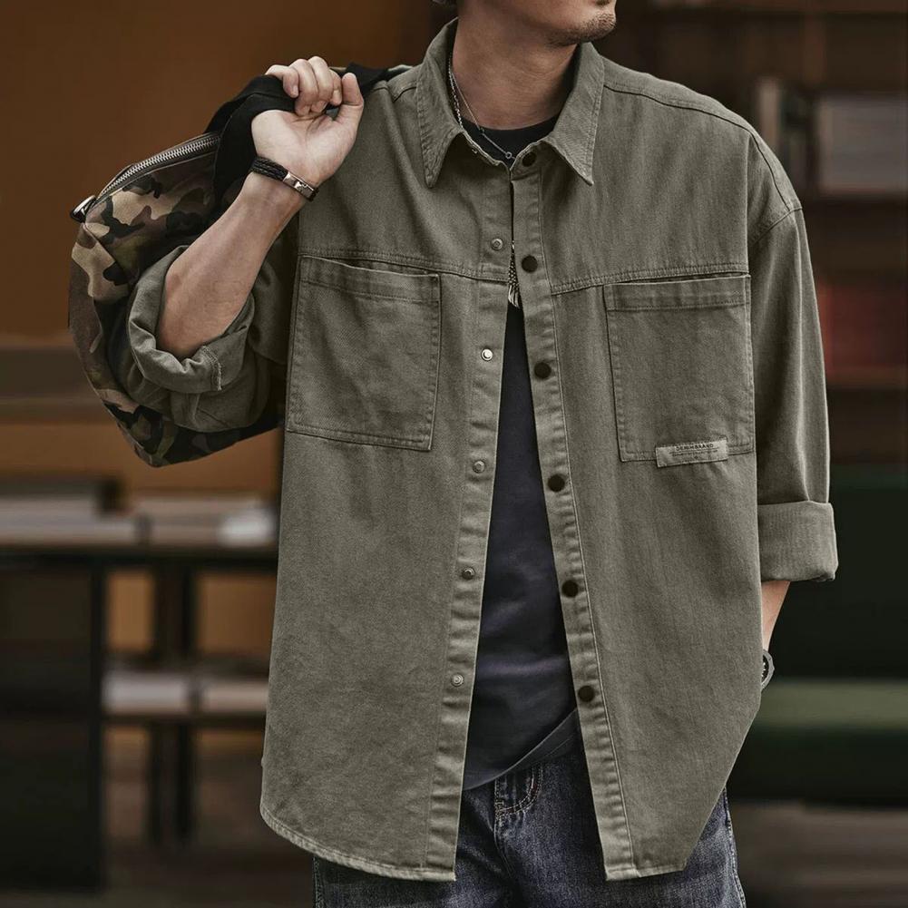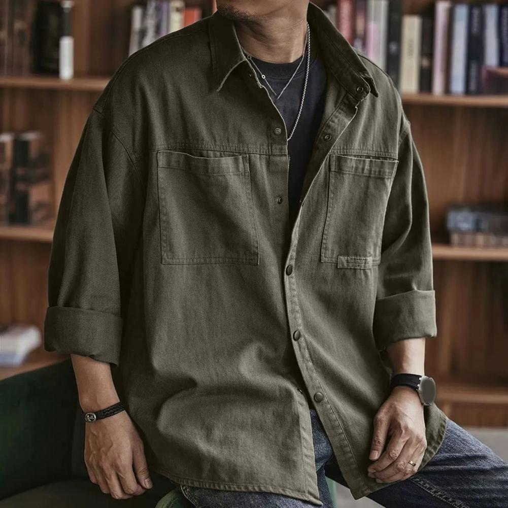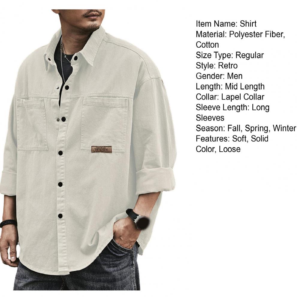 Men Spring Fall Shirt Turn-down Collar Loose Single-breasted Long Sleeve Solid Color Casual Cardigan Buttons Patch Pockets Men Daily Top