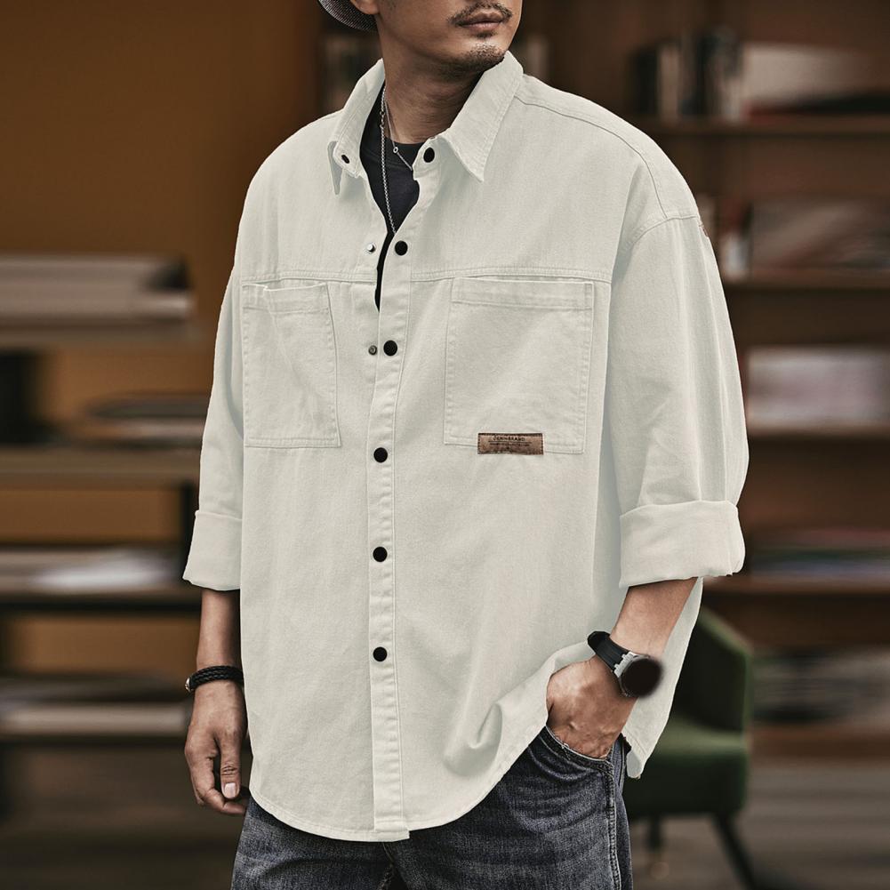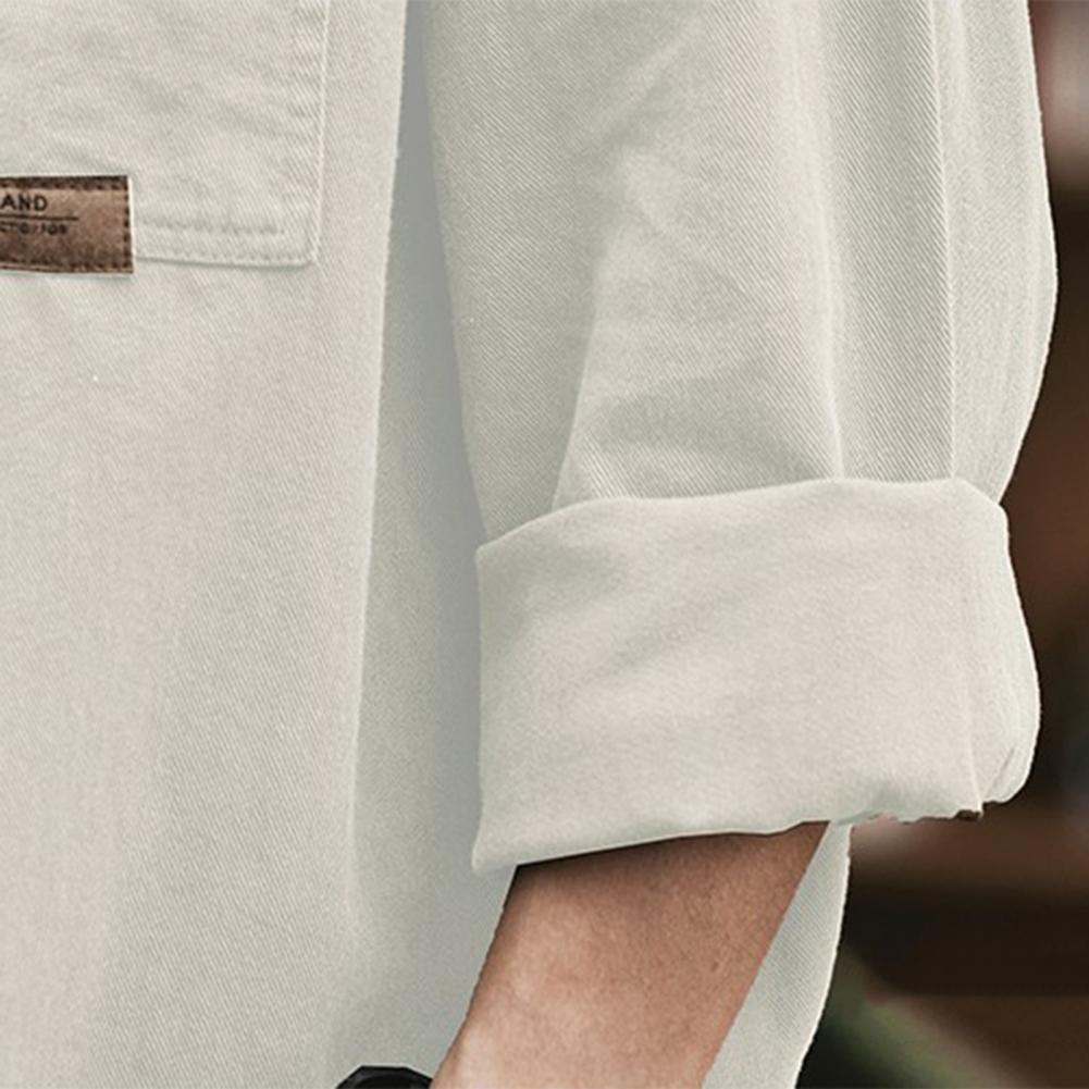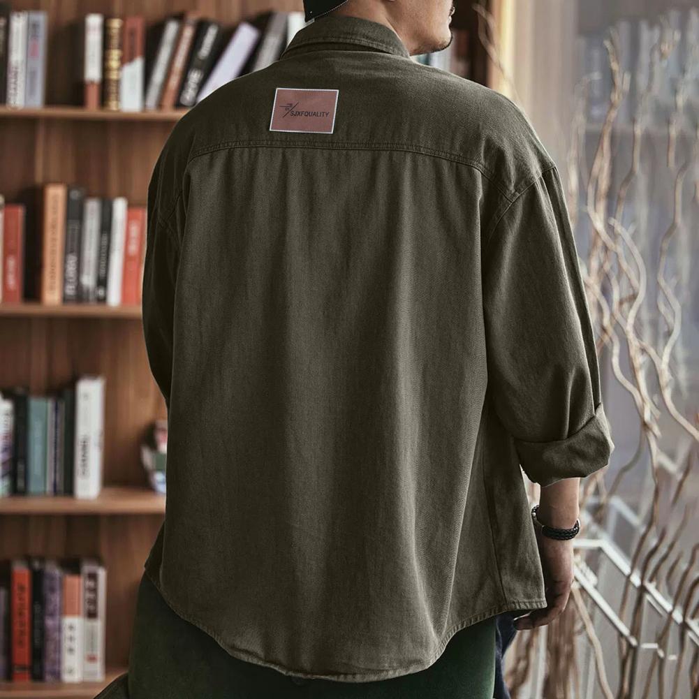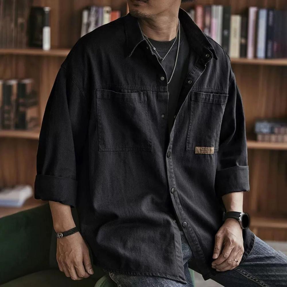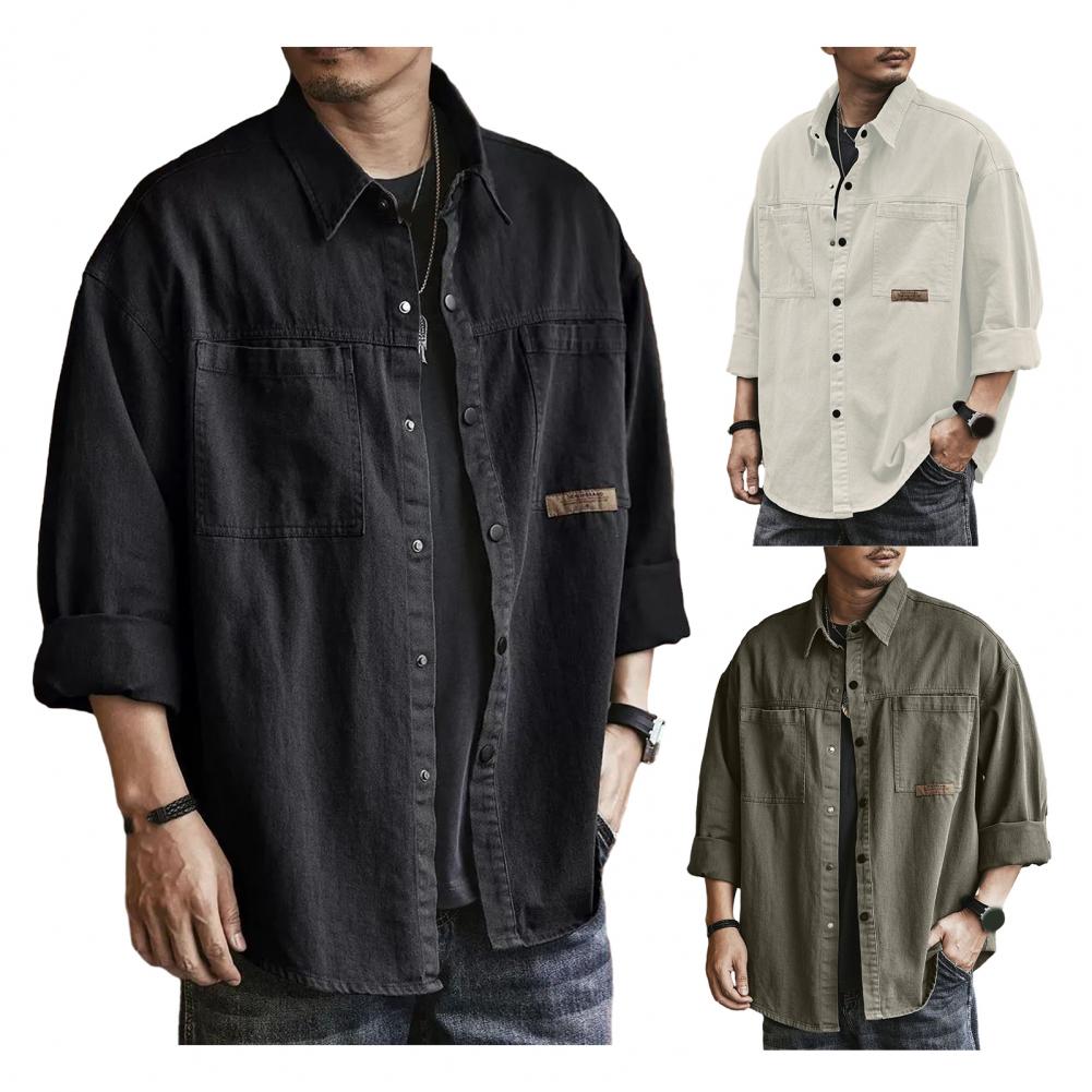Men Spring Fall Shirt Turn-down Collar Loose Single-breasted Long Sleeve Solid Color Casual Cardigan Buttons Patch Pockets Men Daily Top