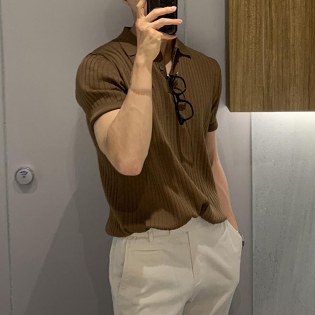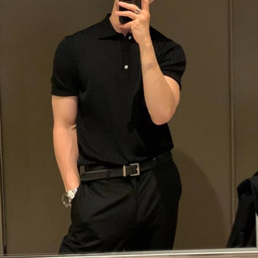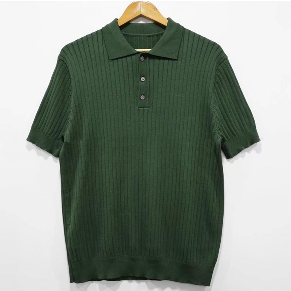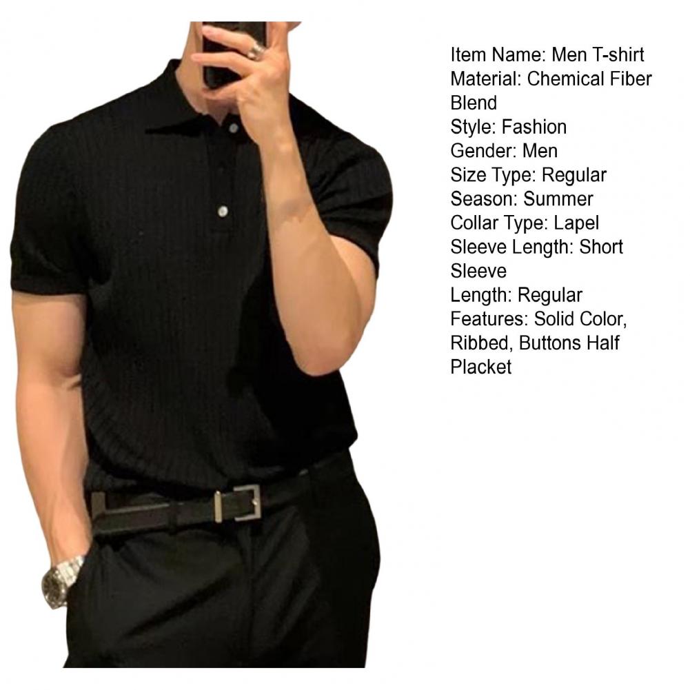 Lapel Short Sleeve Buttons Half Placket Loose Men T-shirt Summer Solid Color Knitting Ribbed Shirt Top Streetwear