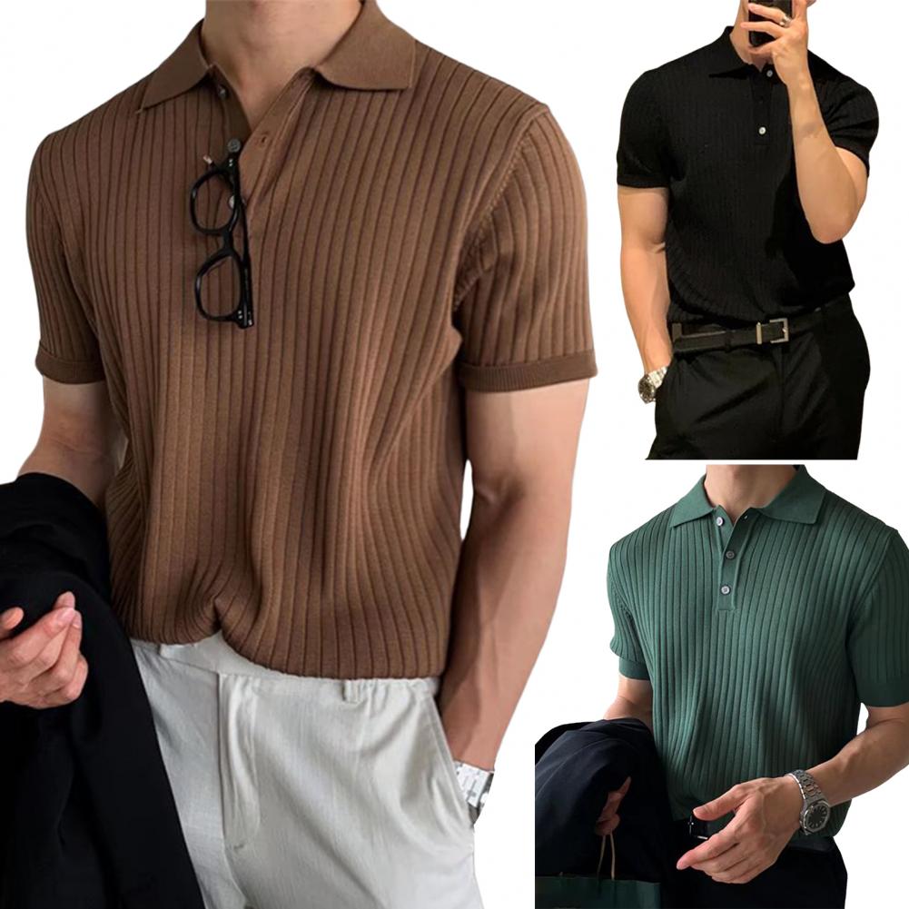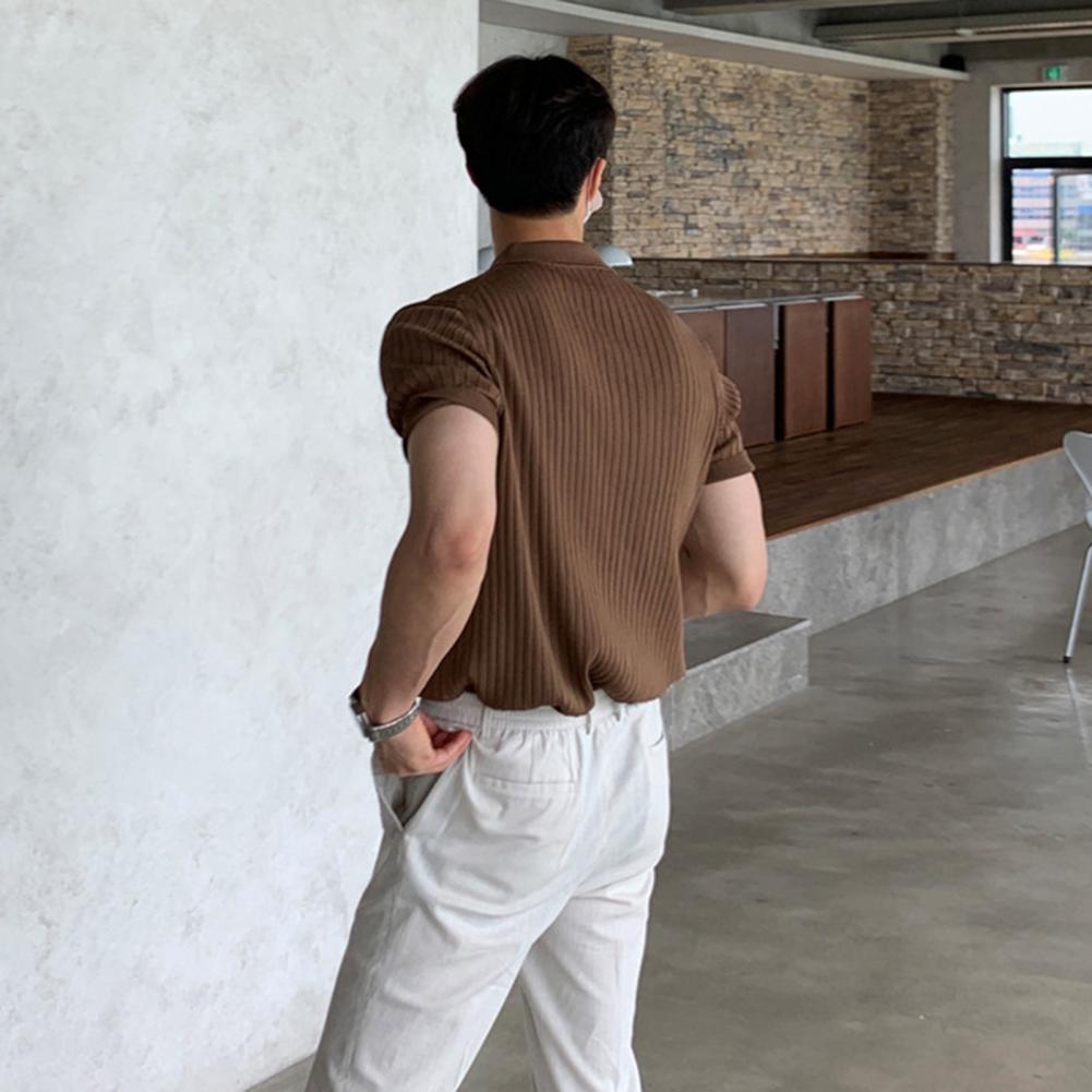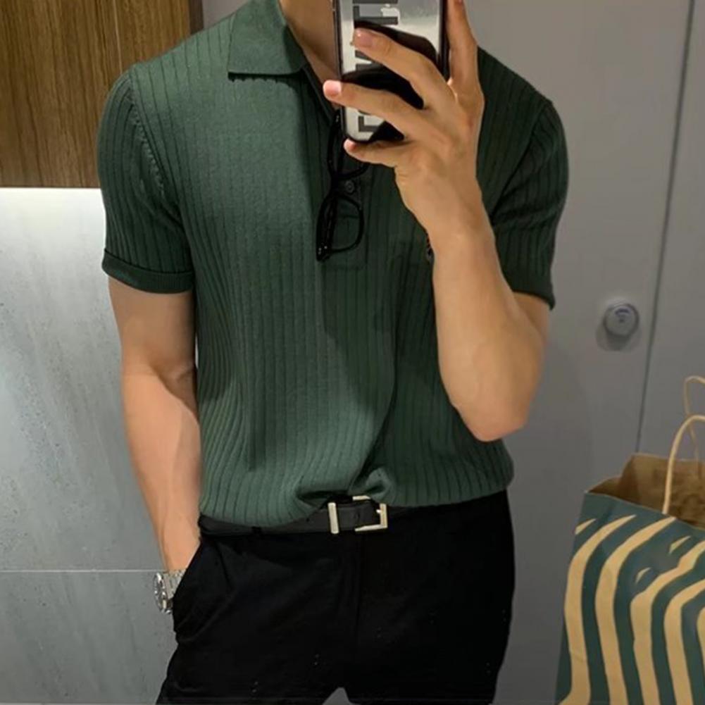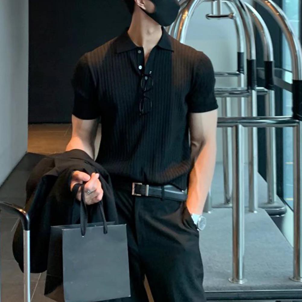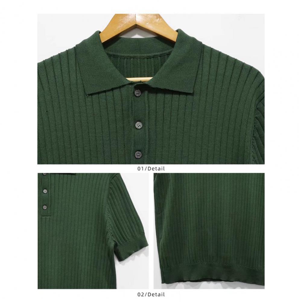Lapel Short Sleeve Buttons Half Placket Loose Men T-shirt Summer Solid Color Knitting Ribbed Shirt Top Streetwear