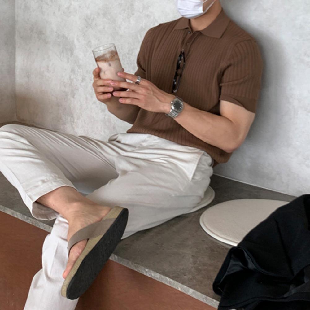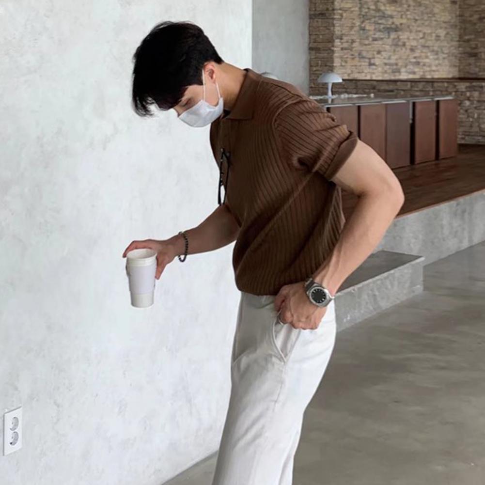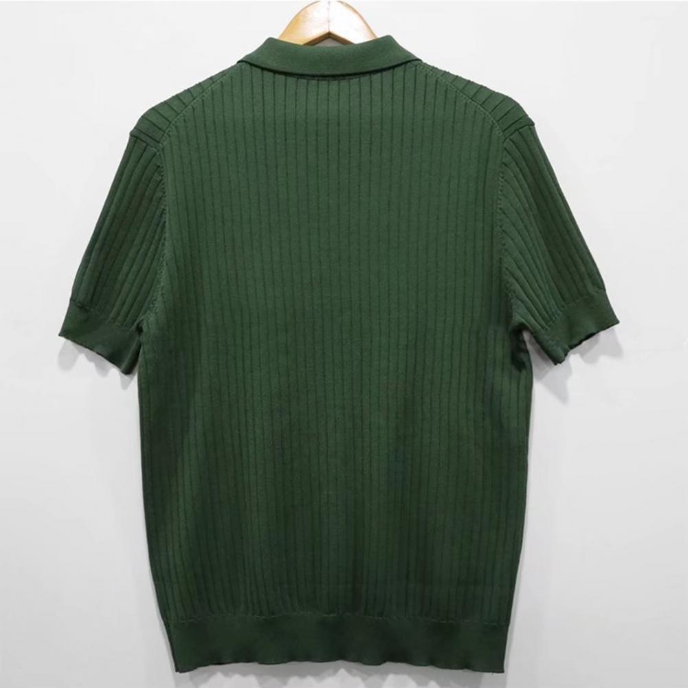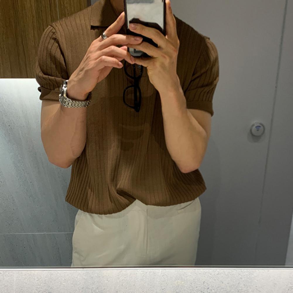 Lapel Short Sleeve Buttons Half Placket Loose Men T-shirt Summer Solid Color Knitting Ribbed Shirt Top Streetwear
