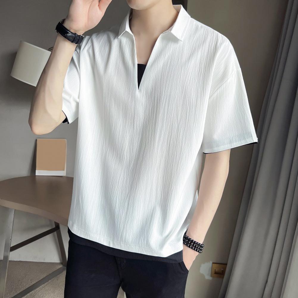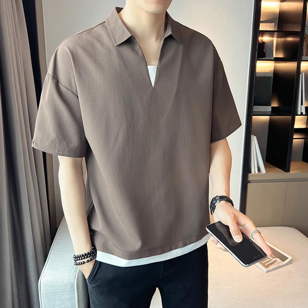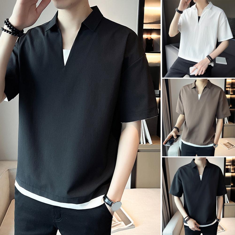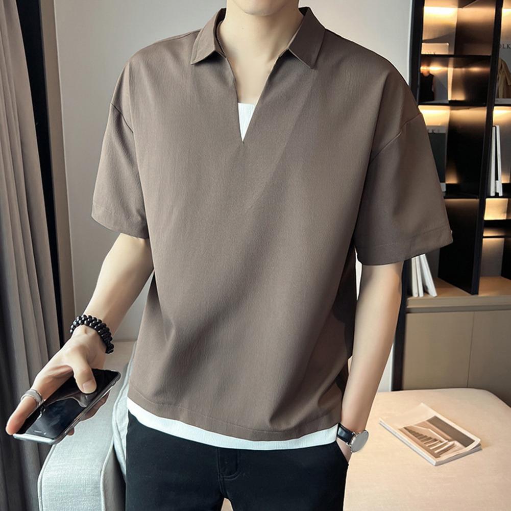 Summer Men Shirt V Neck Lapel Solid Color Fake Two-piece Ice Silk Short Sleeves Loose Pullover Stretchy Casual Daily T-shirt Sport Top