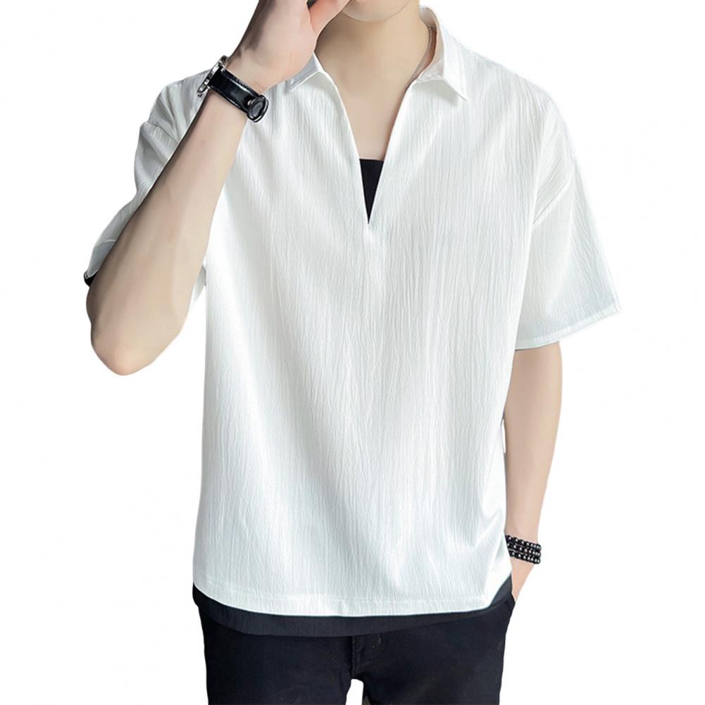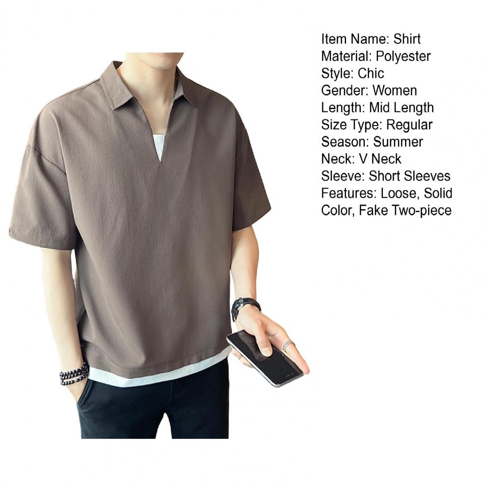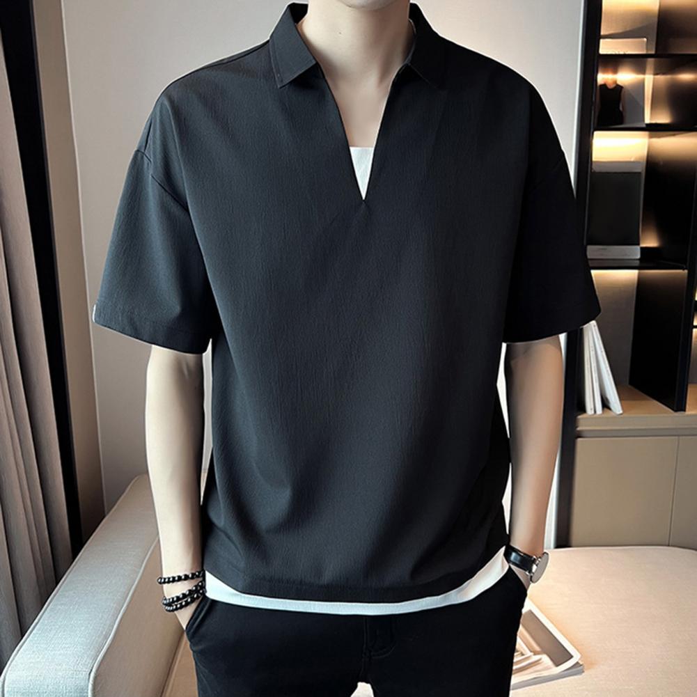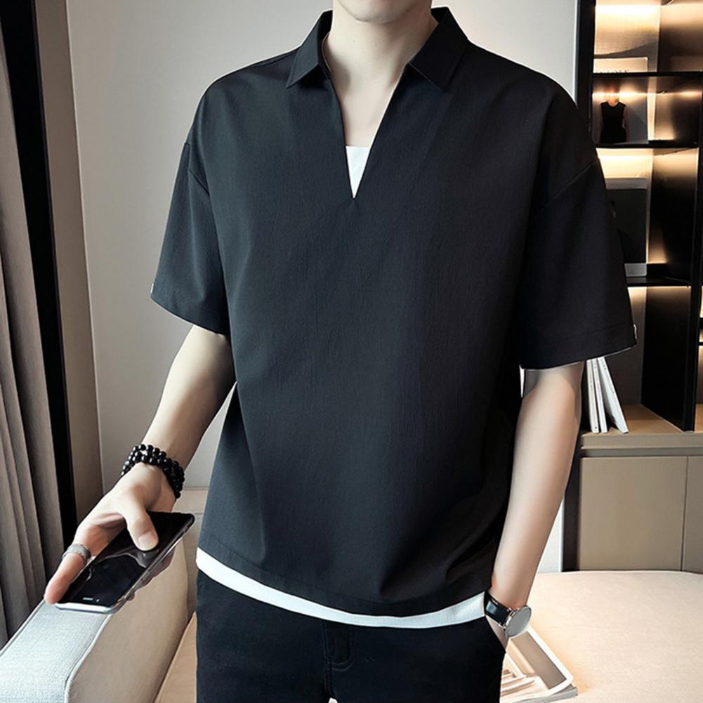 Summer Men Shirt V Neck Lapel Solid Color Fake Two-piece Ice Silk Short Sleeves Loose Pullover Stretchy Casual Daily T-shirt Sport Top
