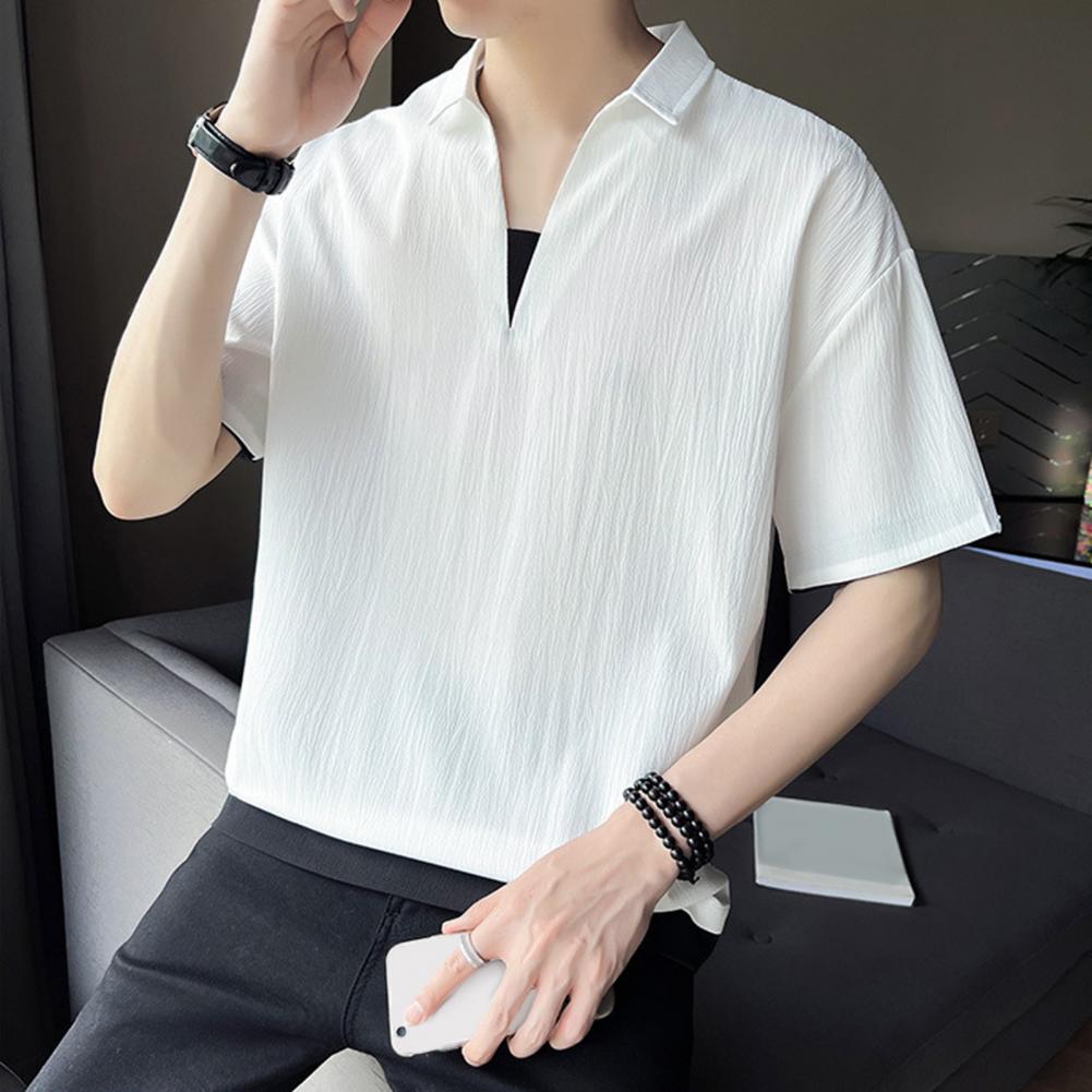 Introducing the stylish and versatile Men's Ice Silk Wrinkle Summer T-Shirt! This trendy top features a lapel and short-sleeved design, offering a casual and loose fit for ultimate comfort.