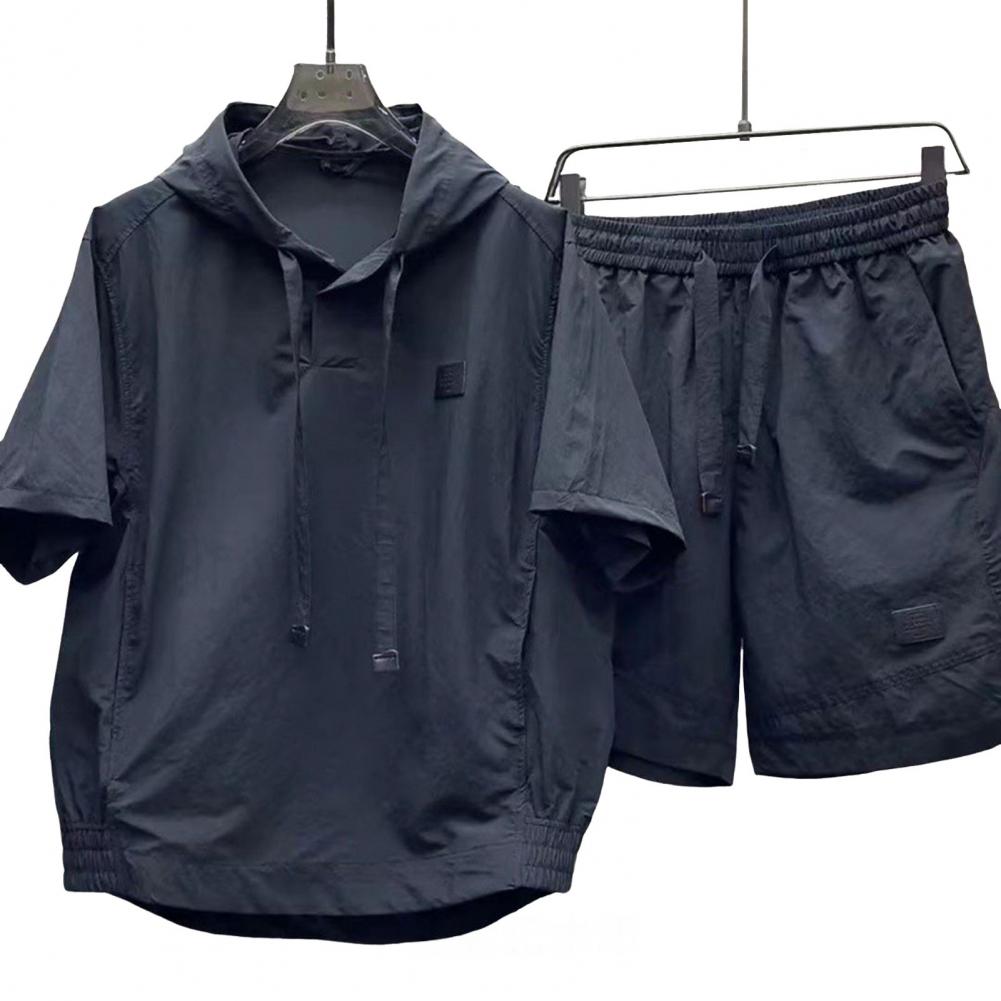 2Pcs/Set Men Summer Outfit Hooded Drawstring Short Sleeve Tops Elastic Waist Pockets Shorts Set Solid Color Loose Fit Tracksuit