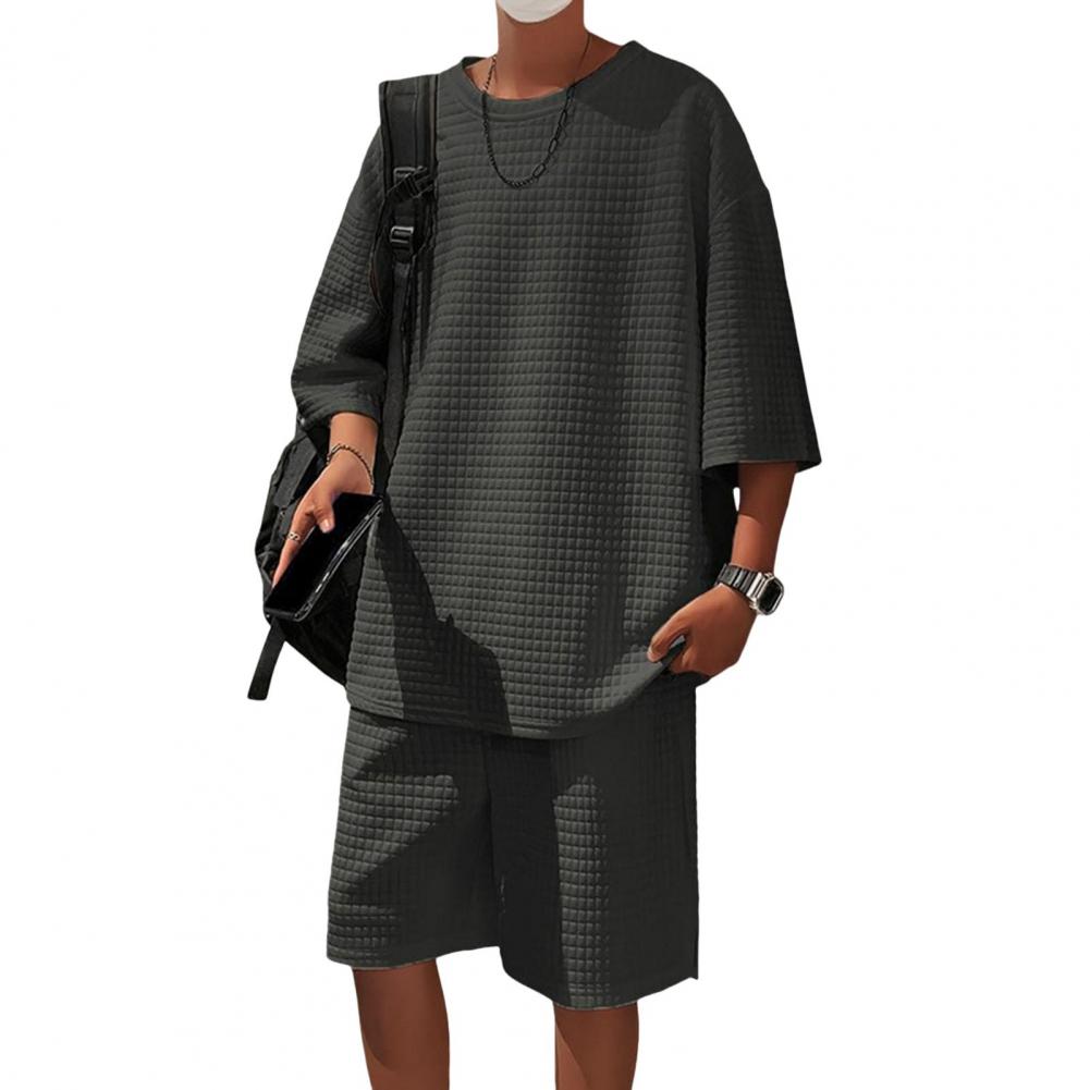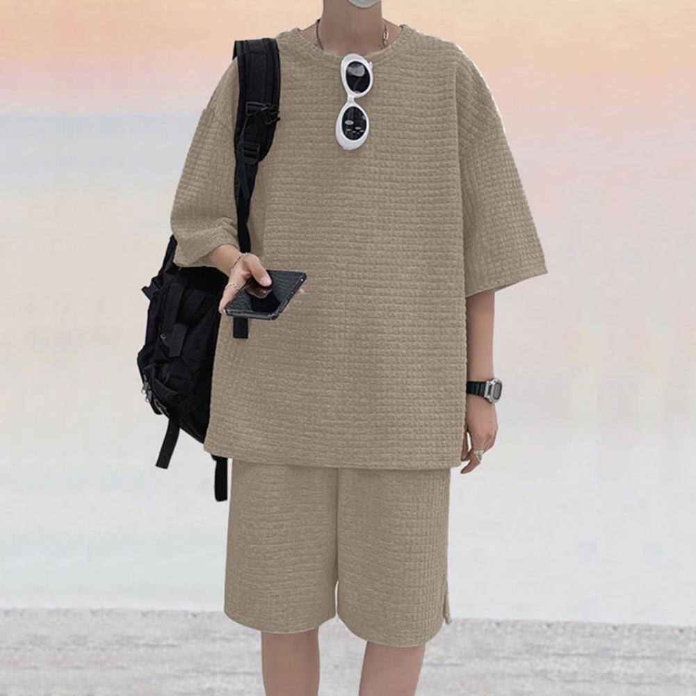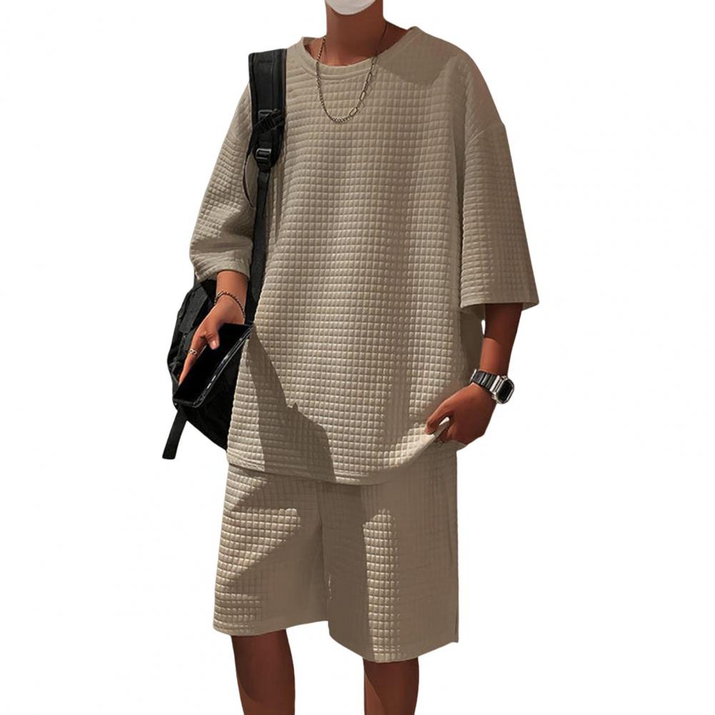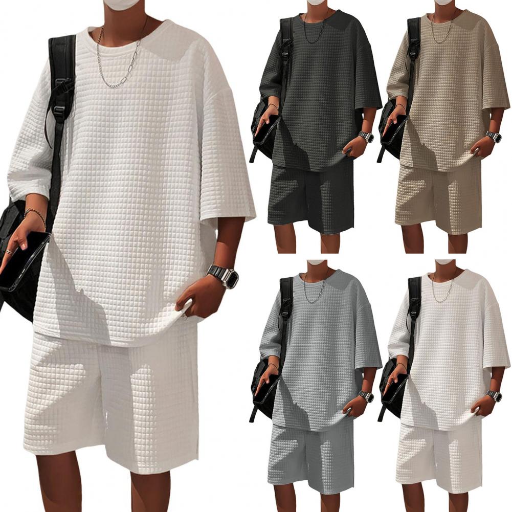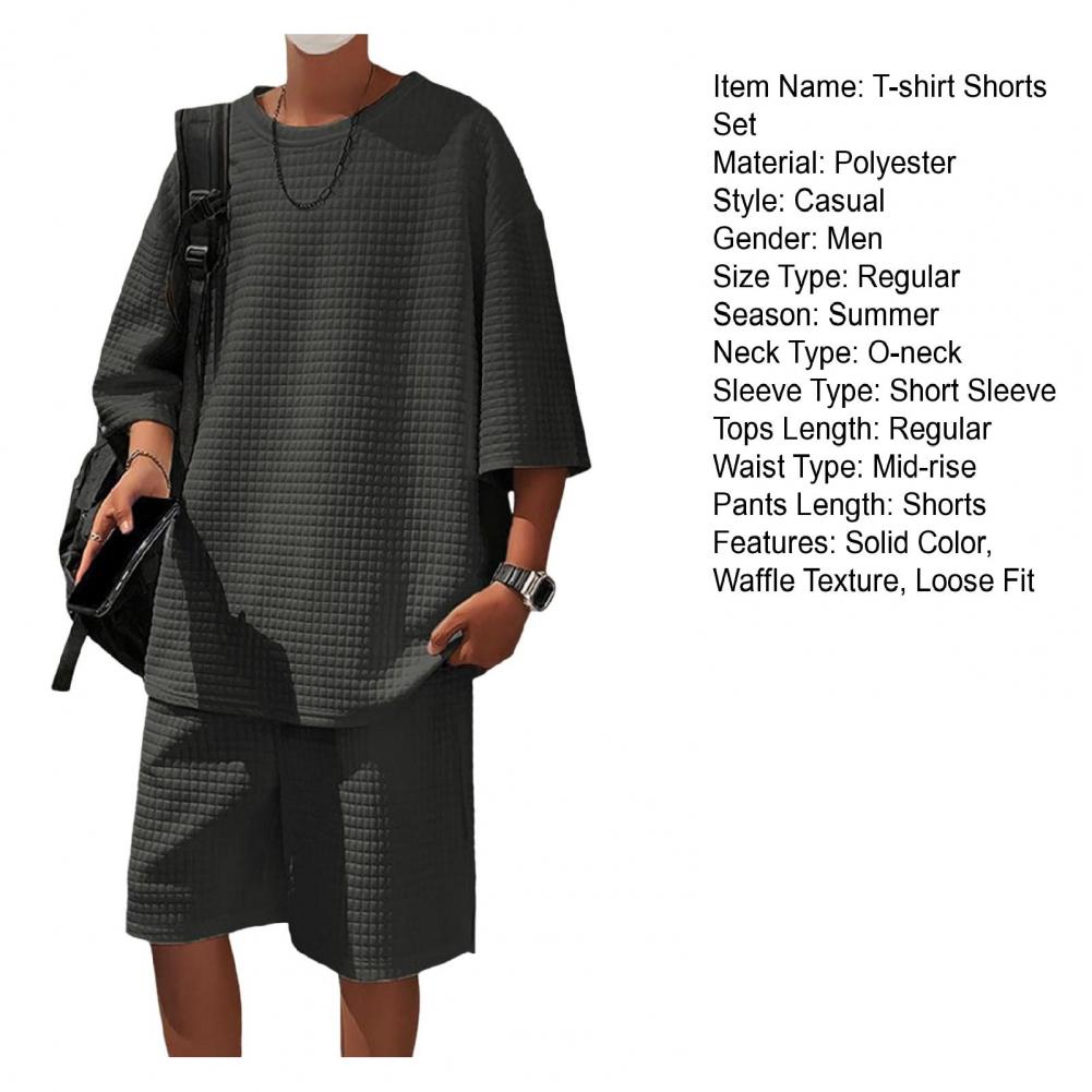 2Pcs/Set Men Summer Outfit O-neck Short Sleeve T-shirt Elastic Waist Wide Leg Pockets Shorts Set Solid Color Waffle Texture Sport Outfit